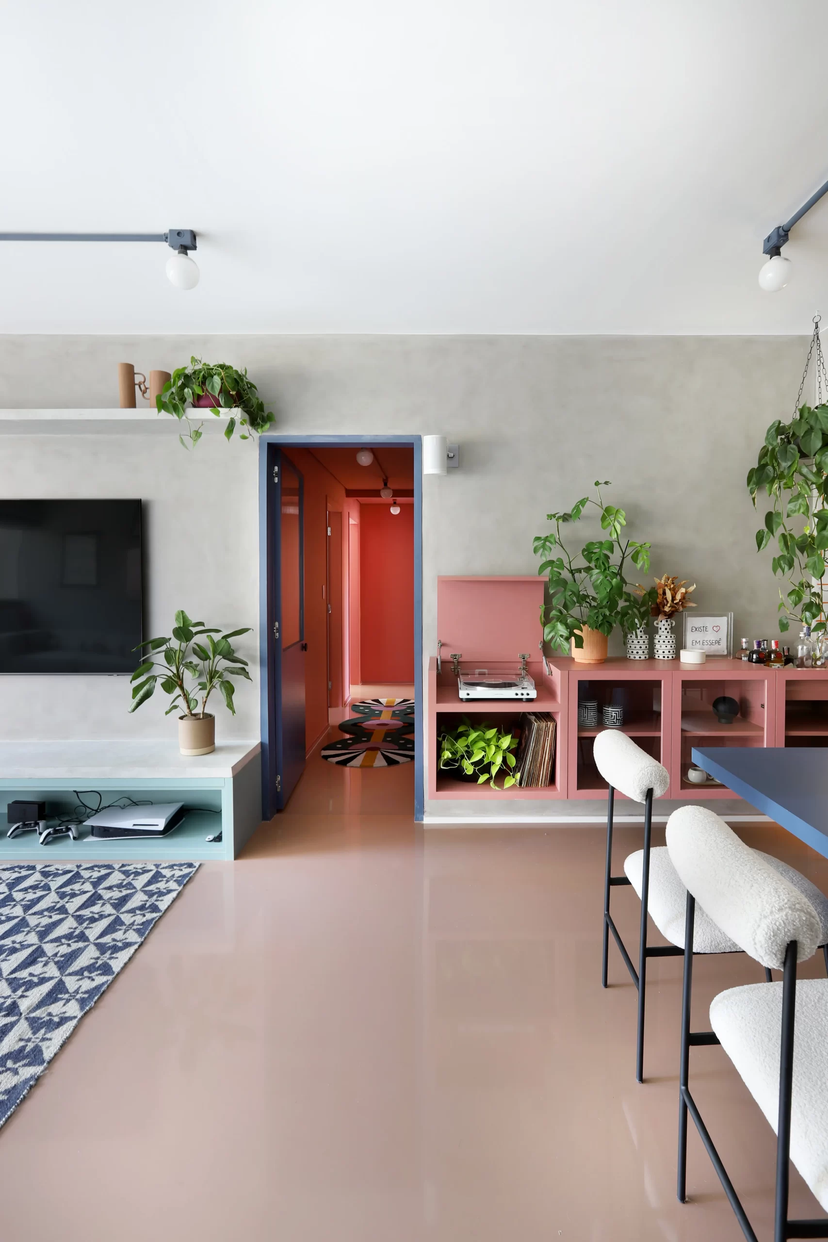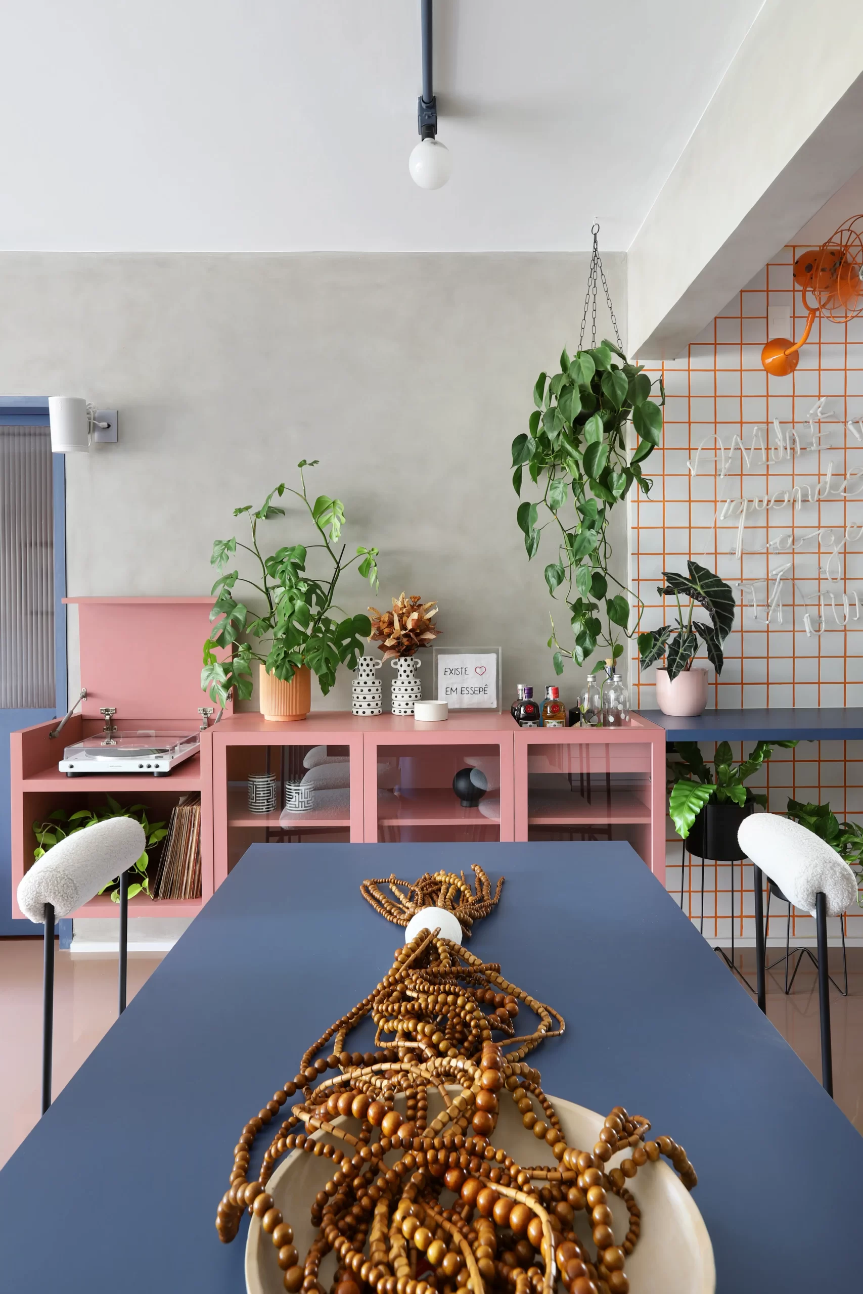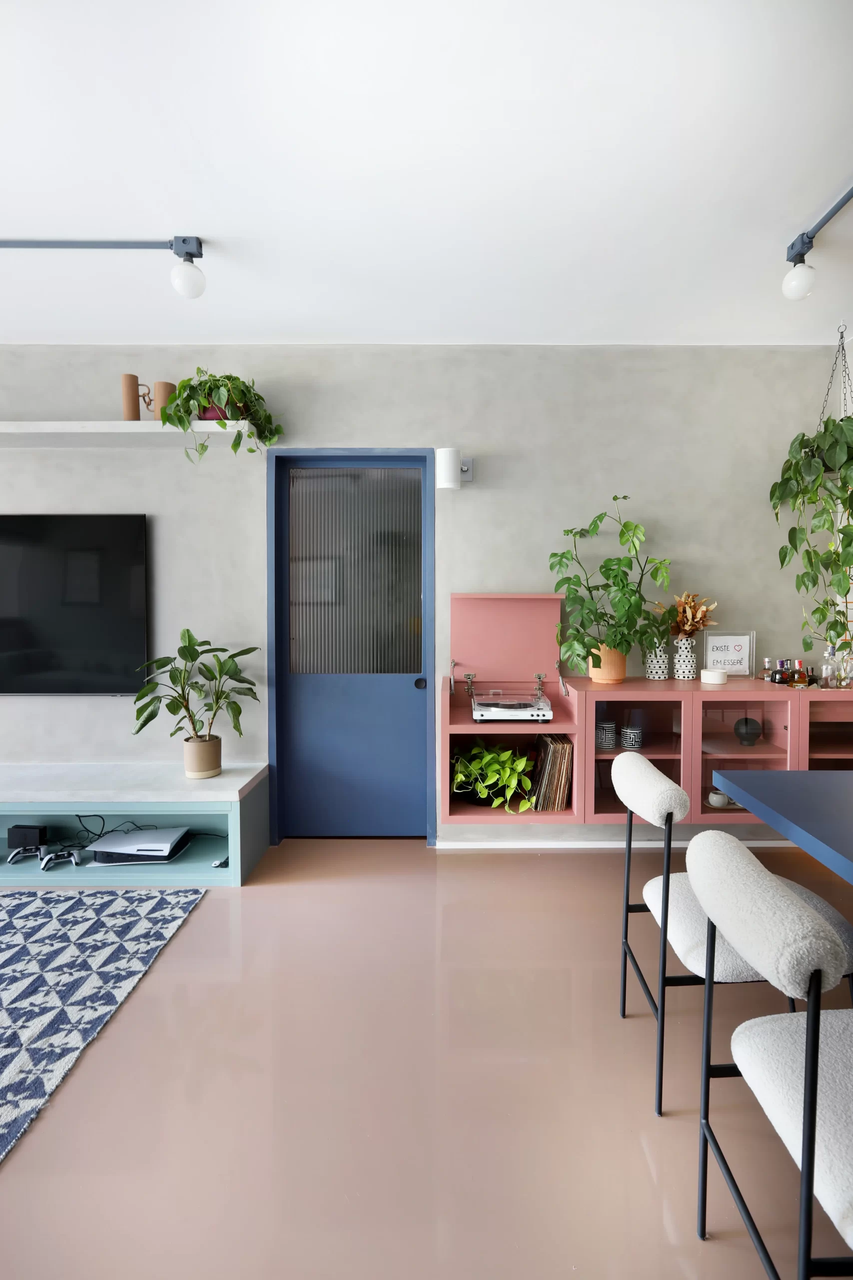 O painel de TV ganhou banco de concreto com floreira embutida. A mesa de jantar também é autoral, com tampo azul e cadeiras em metal preto e bouclê branco.