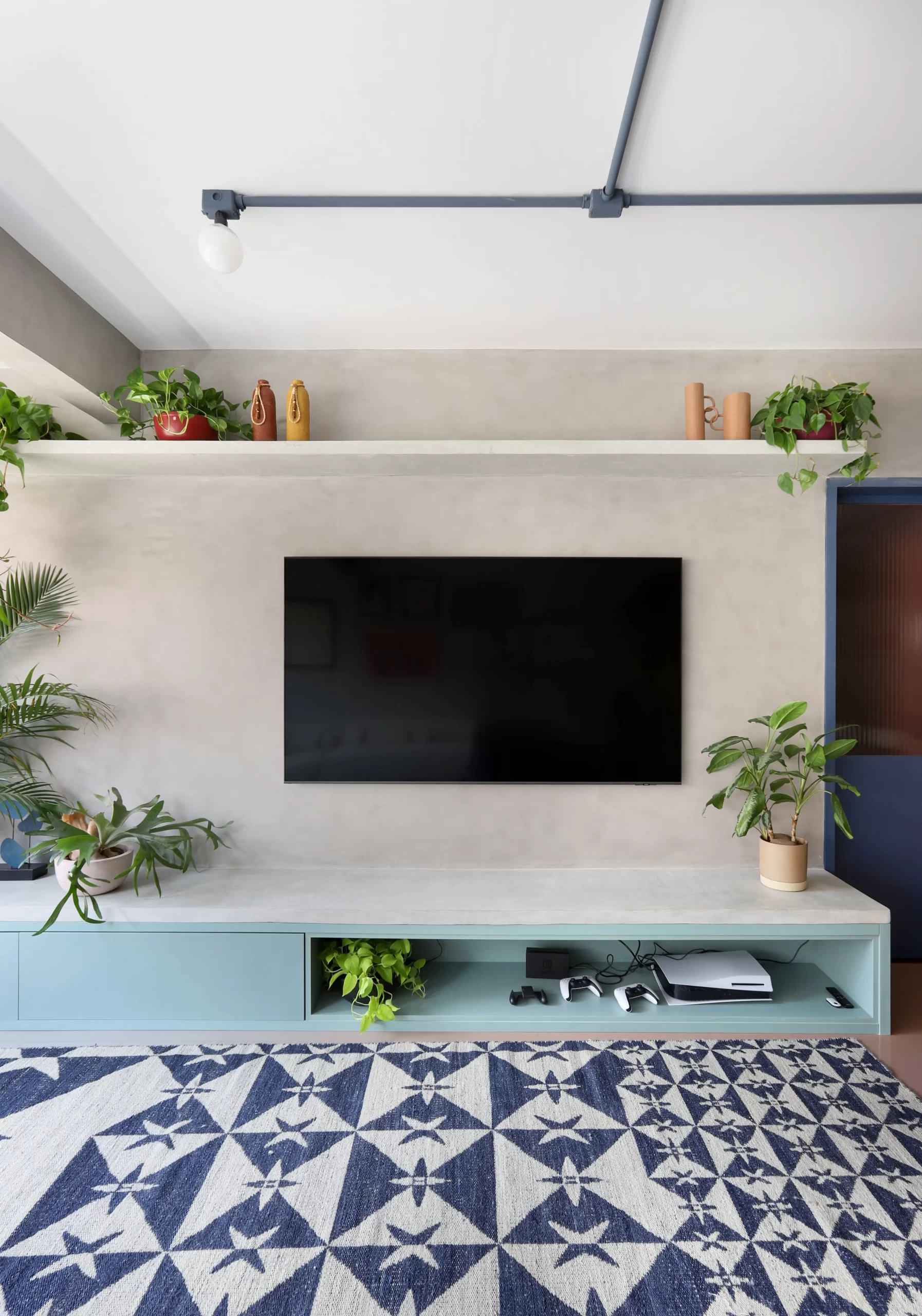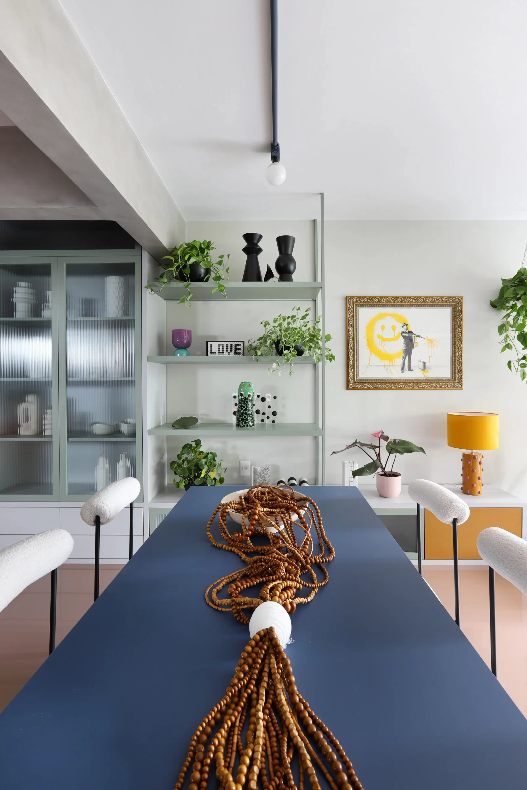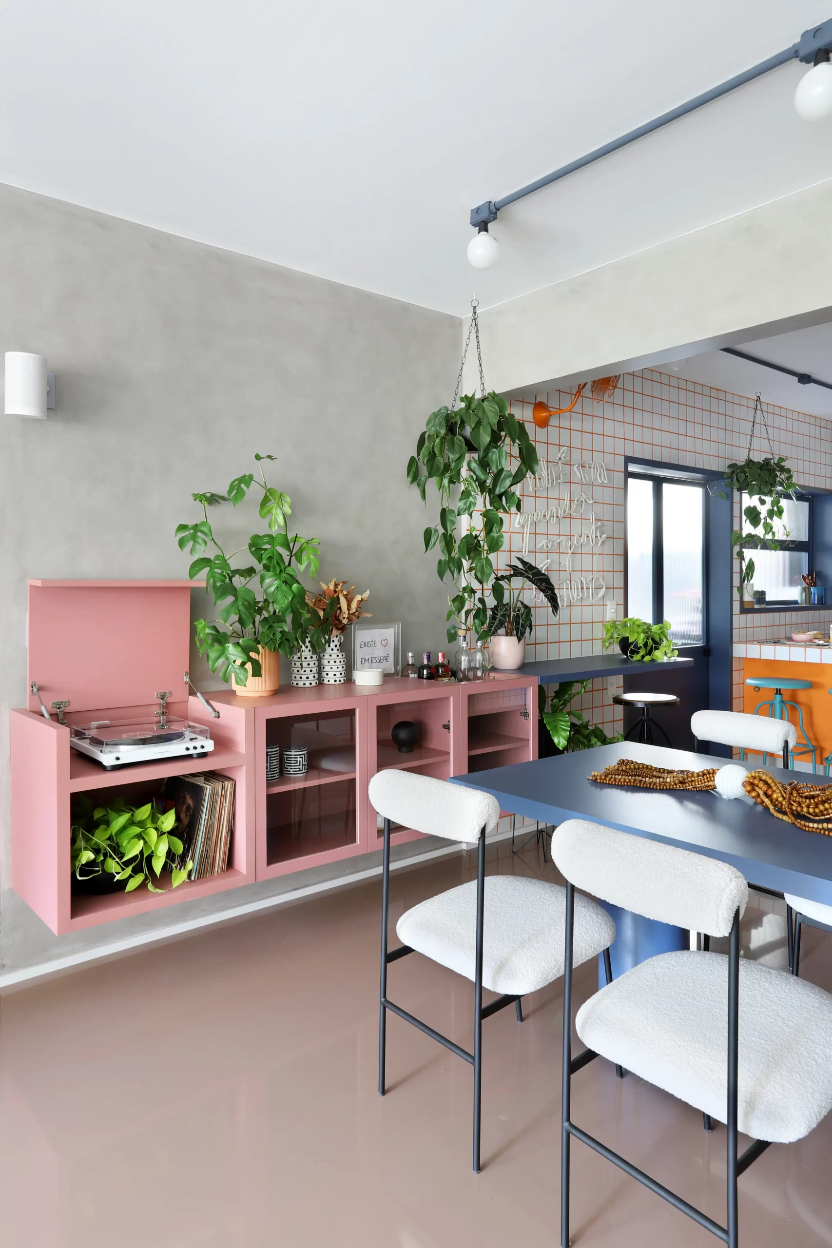 O painel de TV ganhou banco de concreto com floreira embutida. A mesa de jantar também é autoral, com tampo azul e cadeiras em metal preto e bouclê branco.