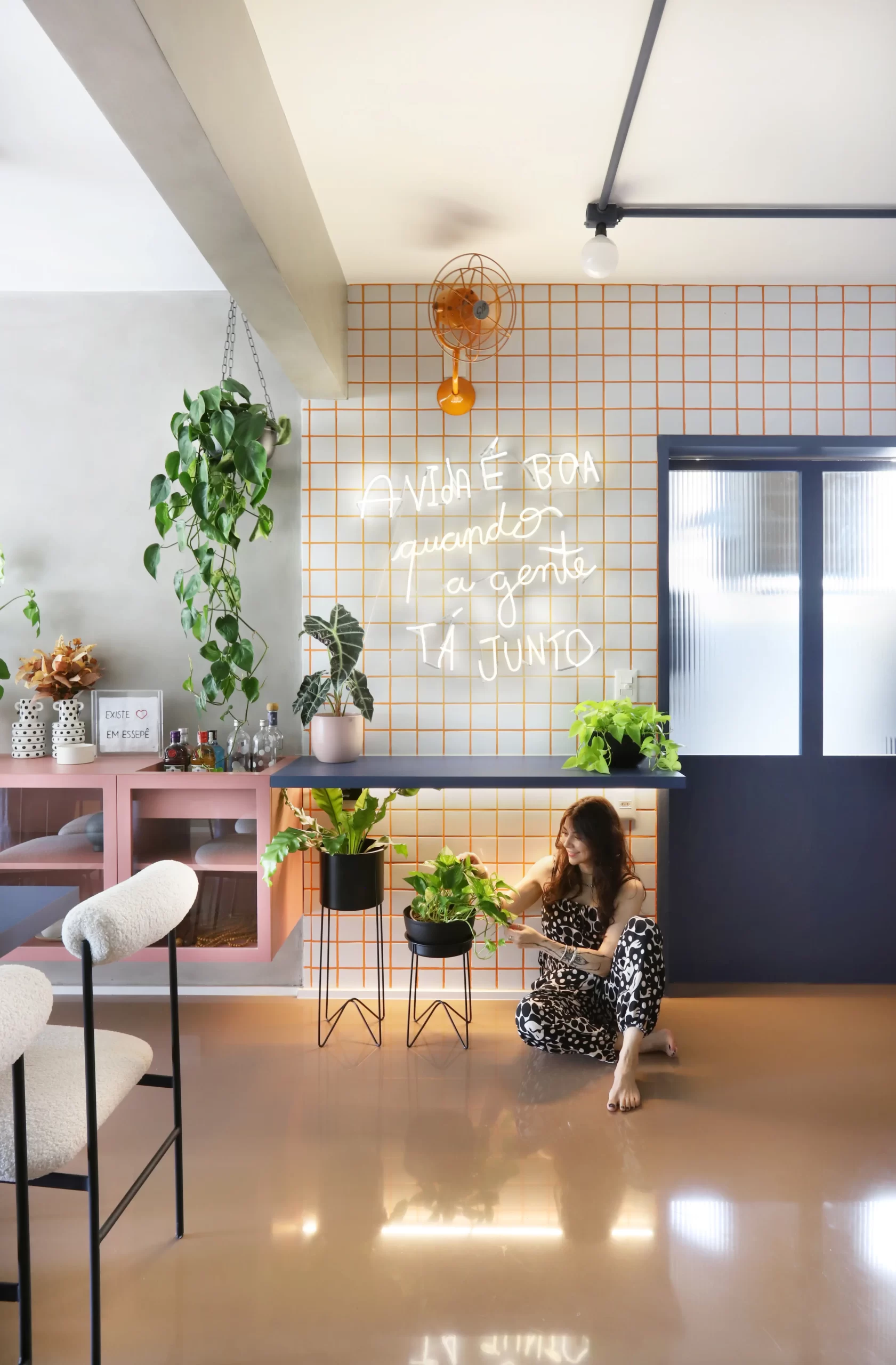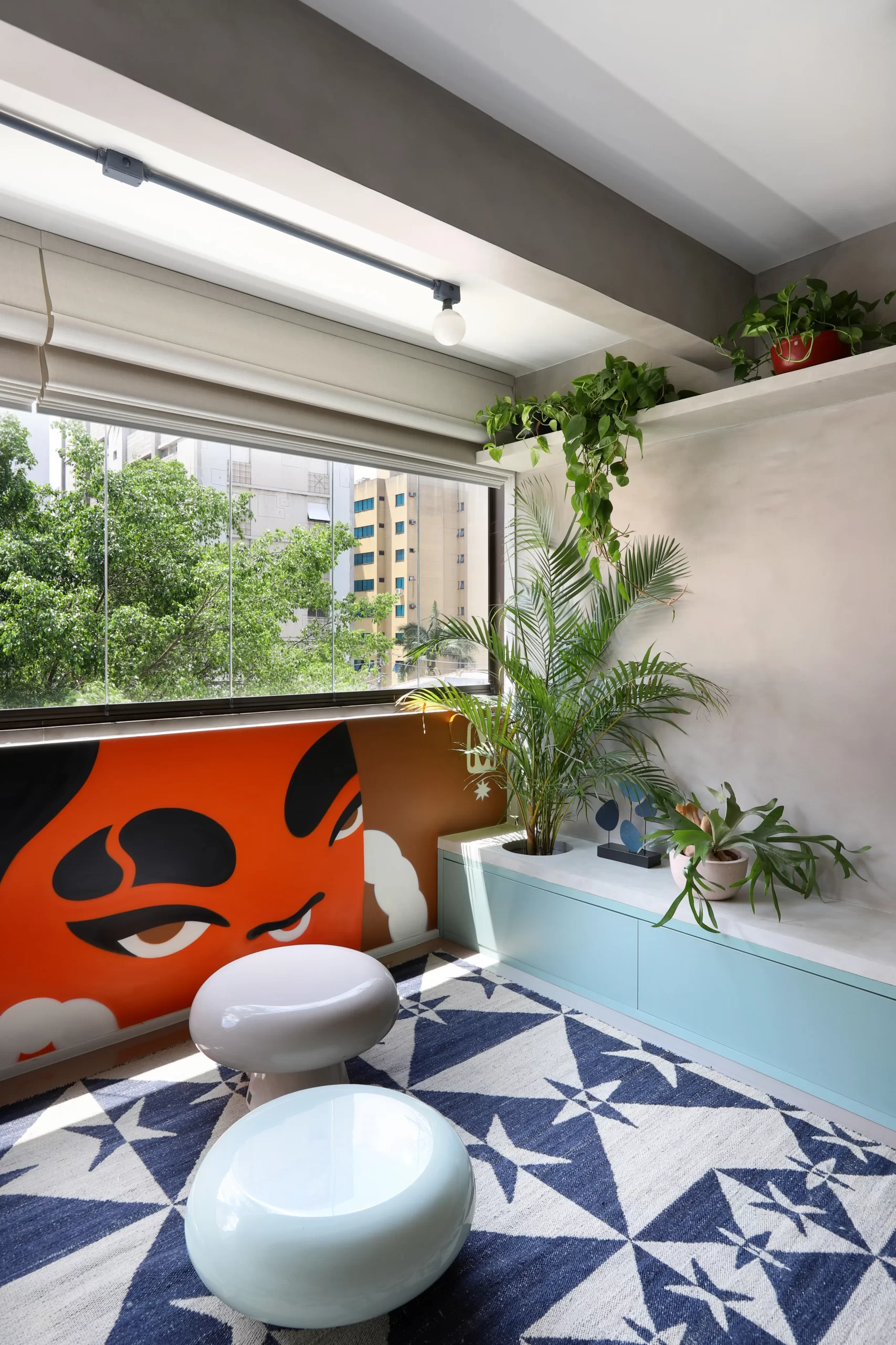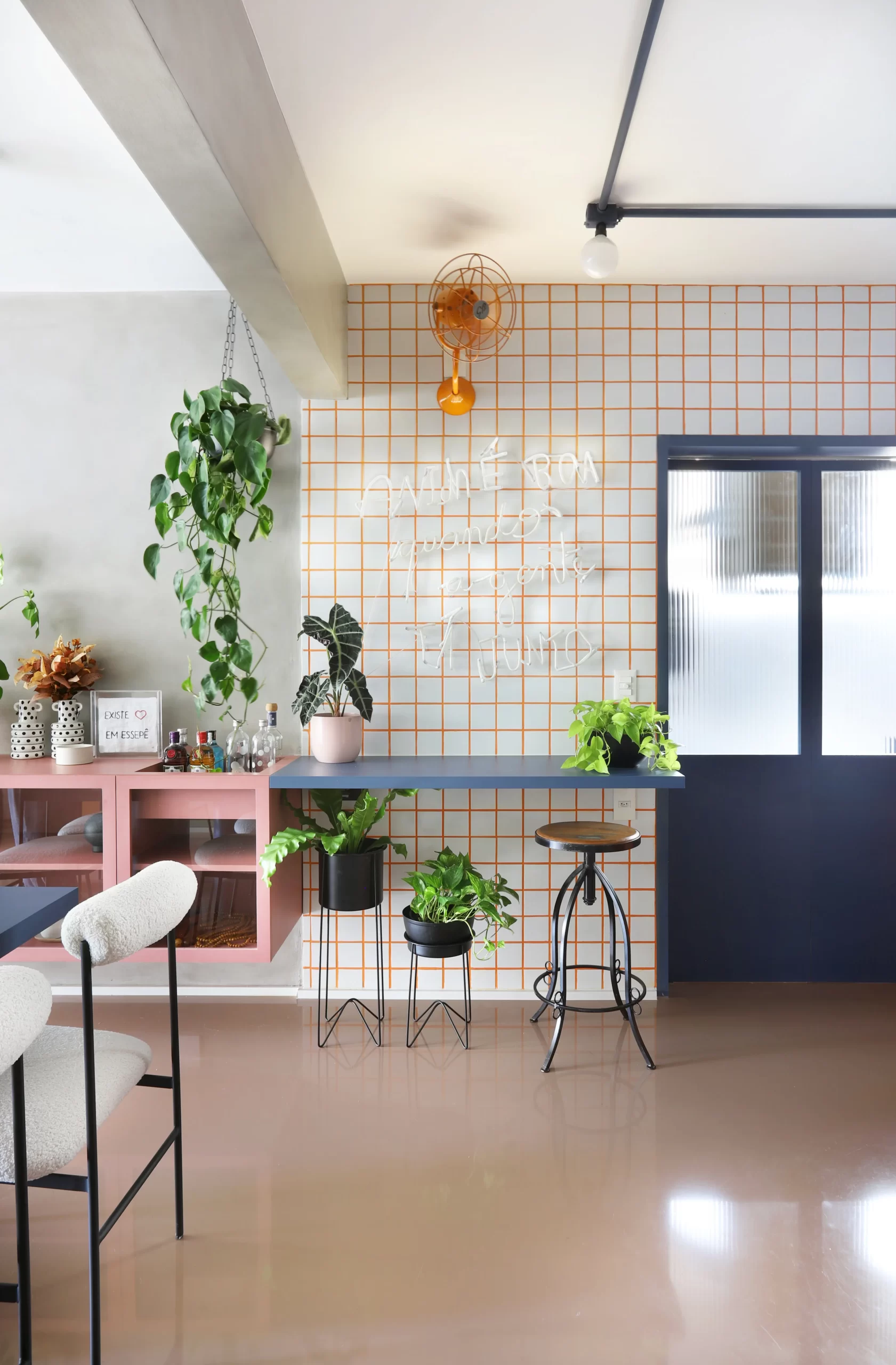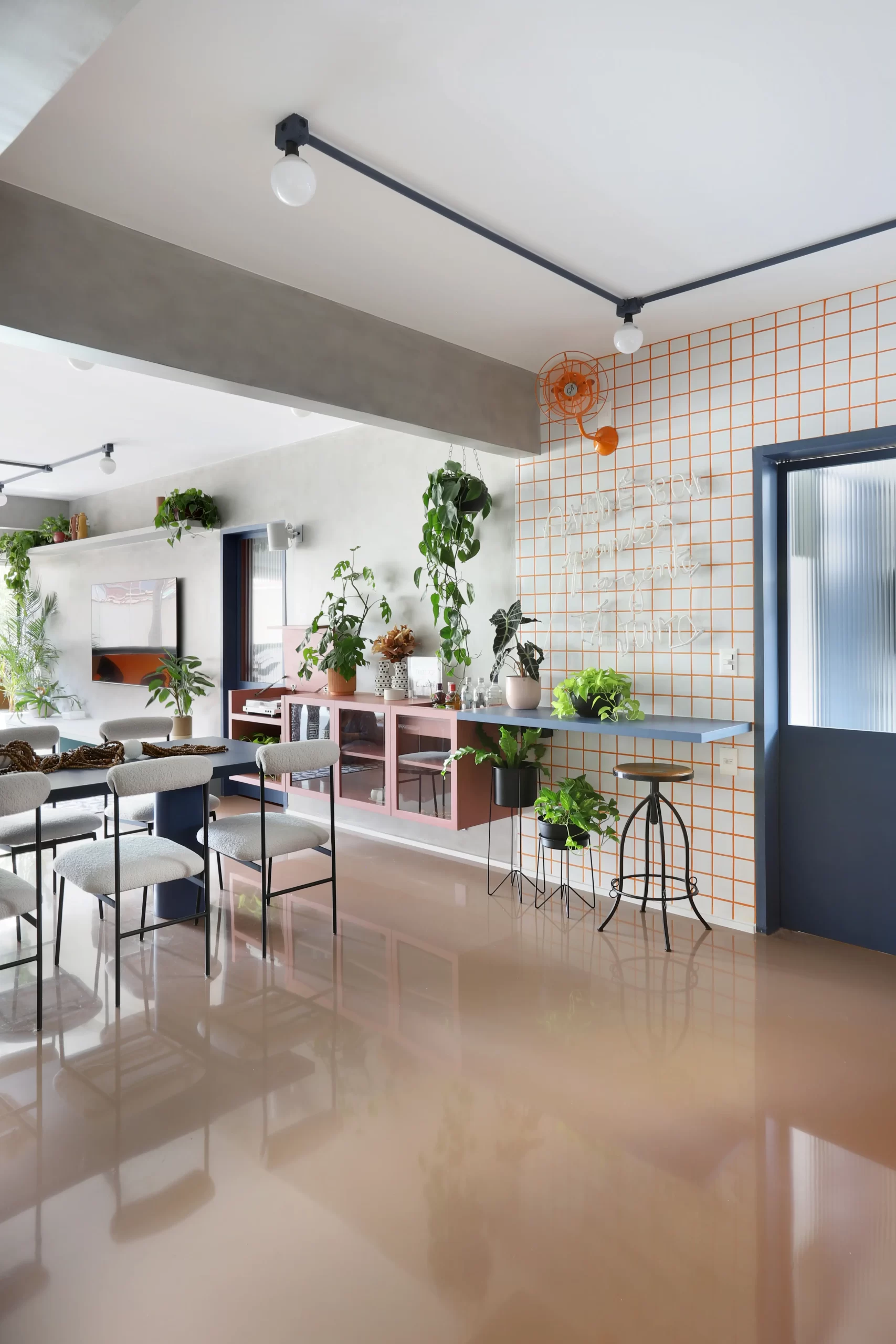 O projeto luminotécnico mescla eletrodutos aparentes com pintura azul, lâmpadas tipo balloom e iluminação indireta pontual, valorizando texturas e criando conforto visual. O verde das plantas está presente em vasos grandes, floreiras e janelas com vidro canelado que ampliam a entrada de luz e ventilação.