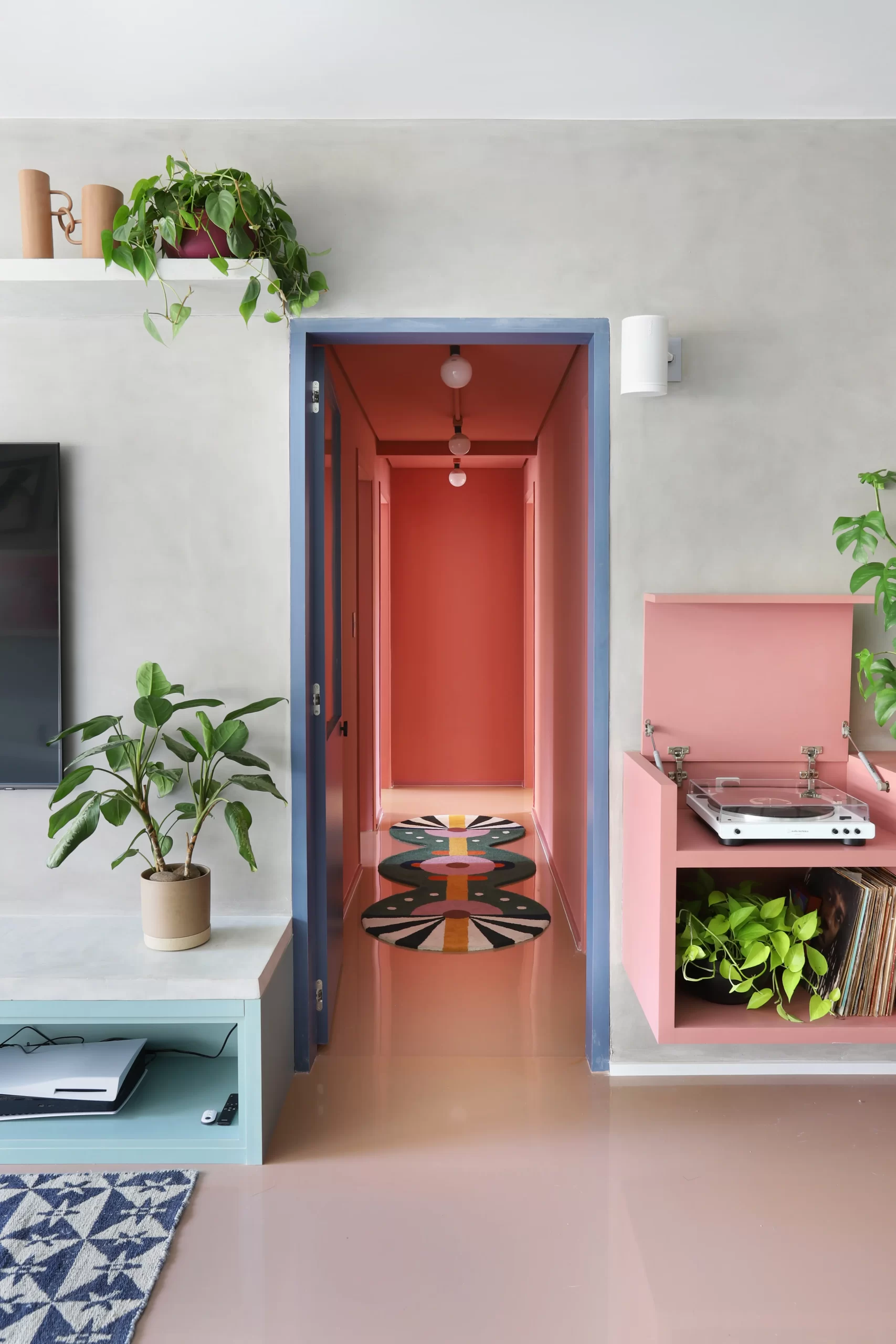 O mobiliário da área social foi desenhado exclusivamente para o espaço: peças multifuncionais em MDF rosa e azul organizam vitrola, bar e aparadores. Na parede oposta, um conjunto contínuo une banco, cristaleira, estante e sofá, que foi reformado e integrado à proposta.