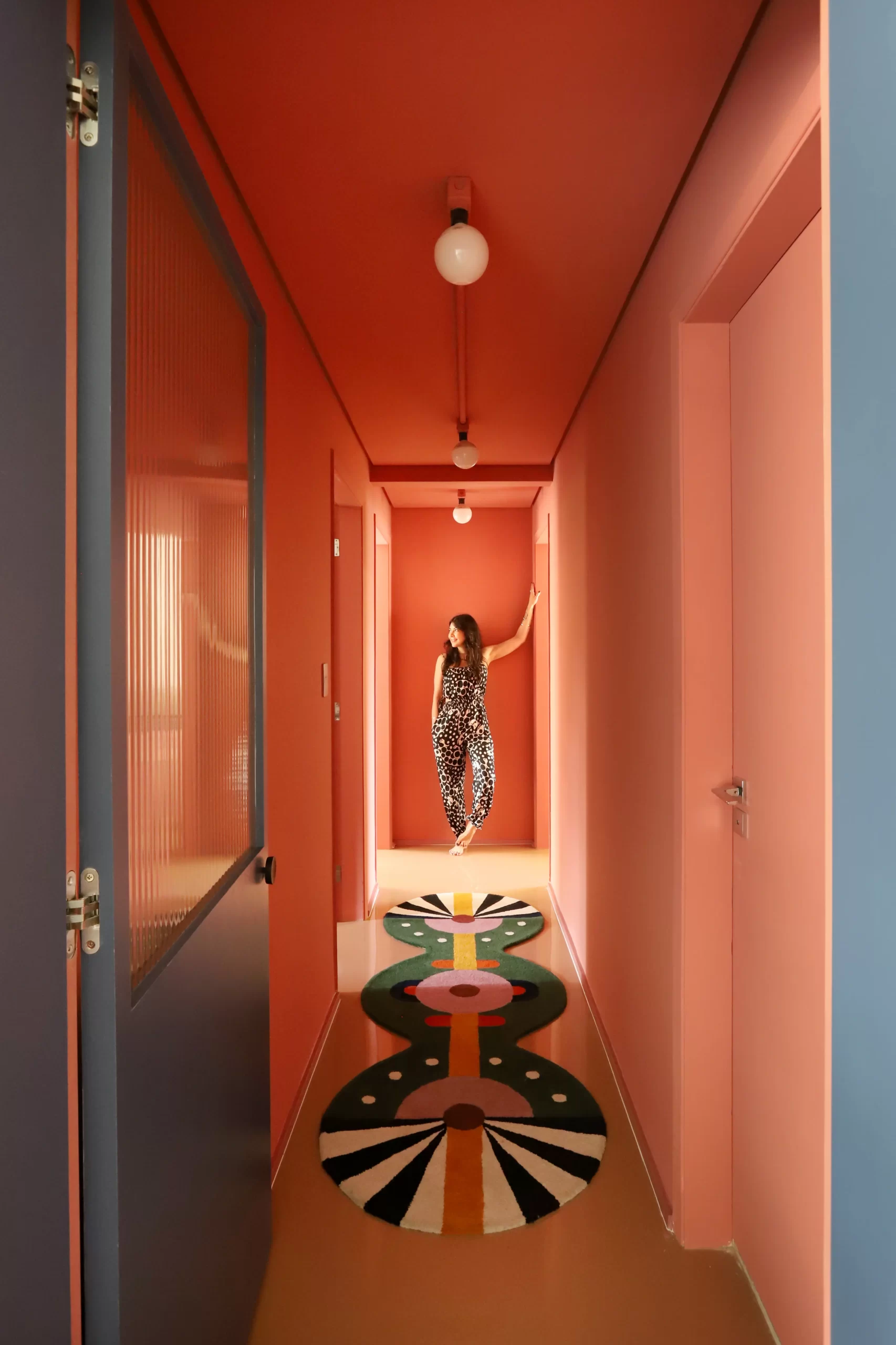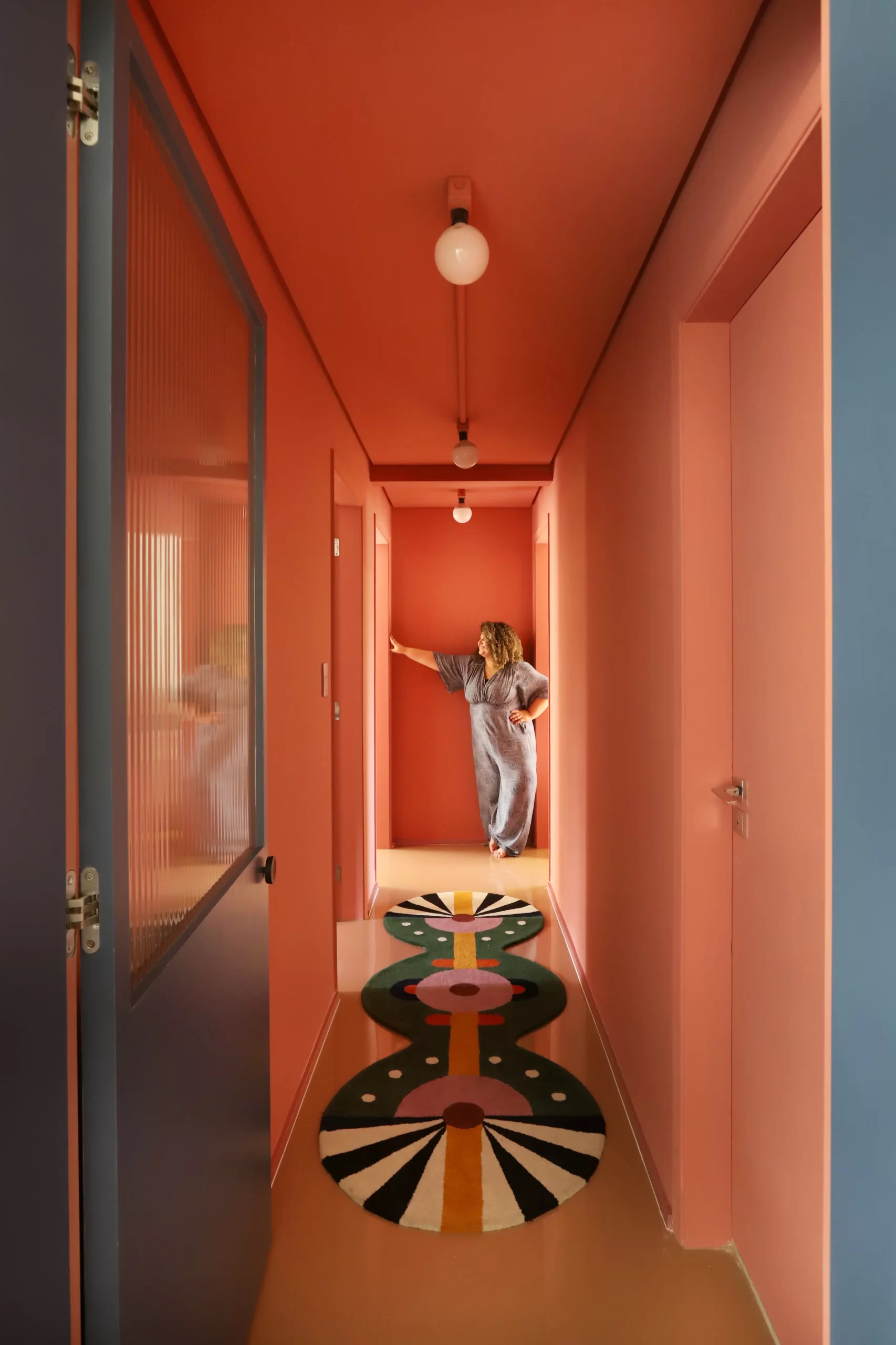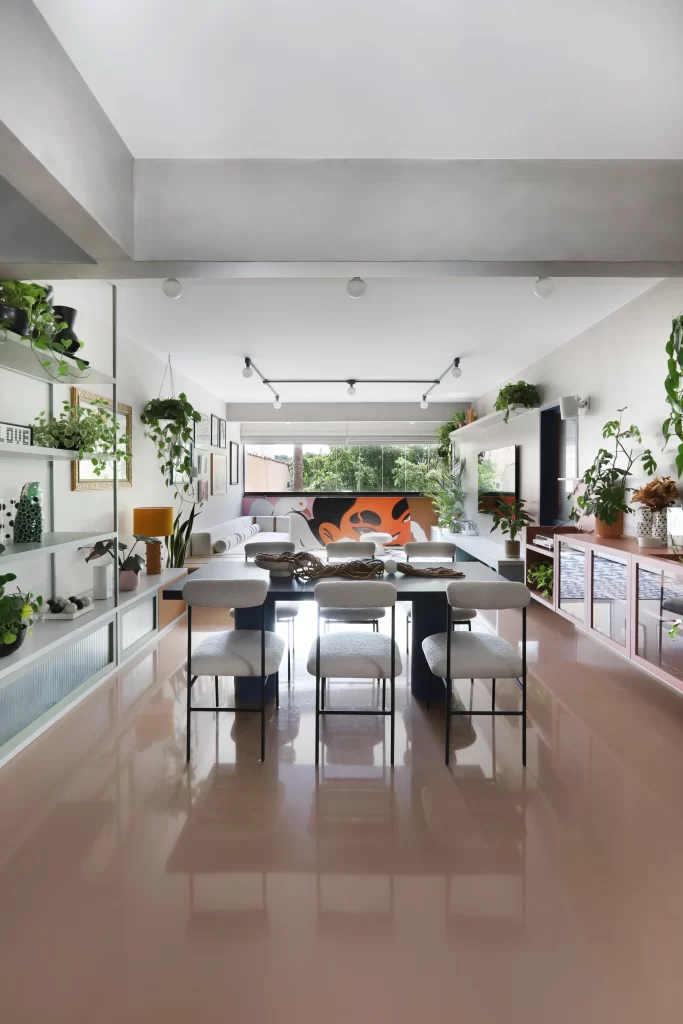 A paleta tem mais de 30 cores, testadas em diversas intensidades e pontos de luz ao longo do dia. Tons como azul mineral, laranja queimado, rosa pastel e mostarda aparecem em marcenaria, tecidos, mobiliário e revestimentos.