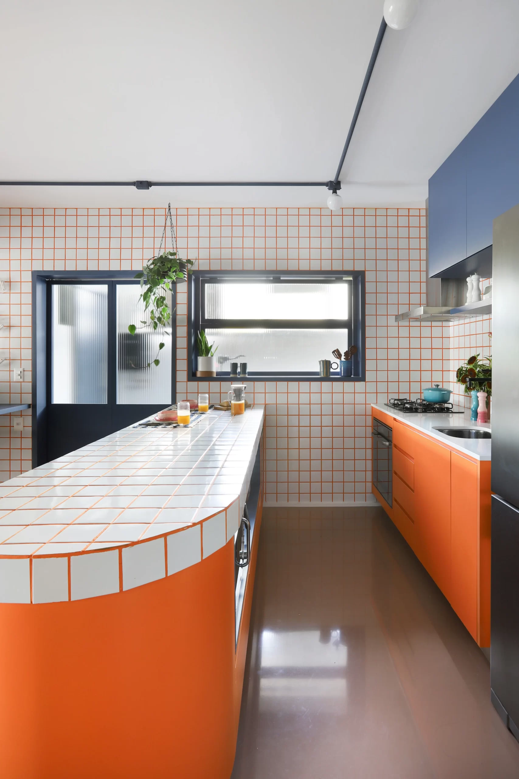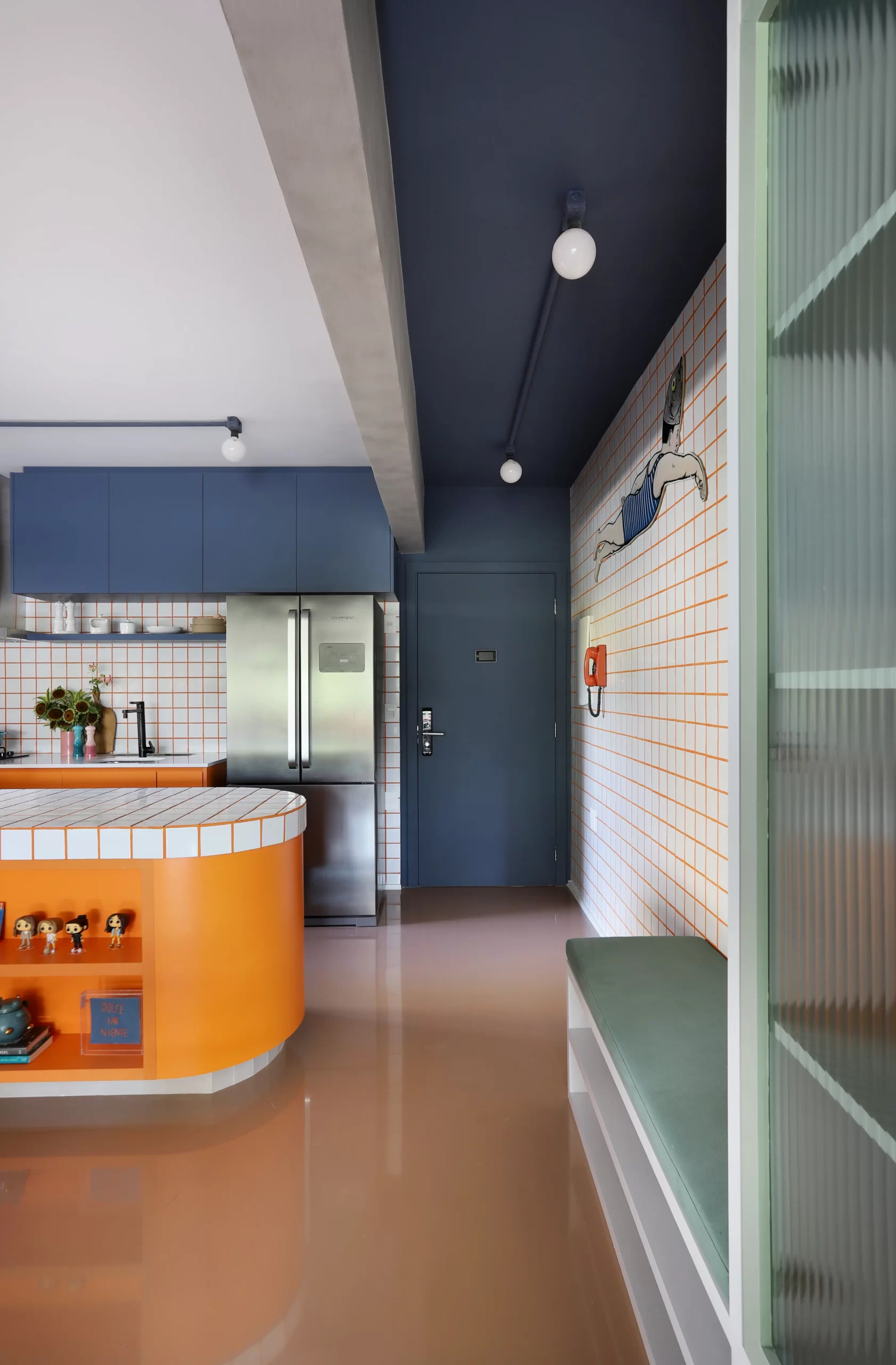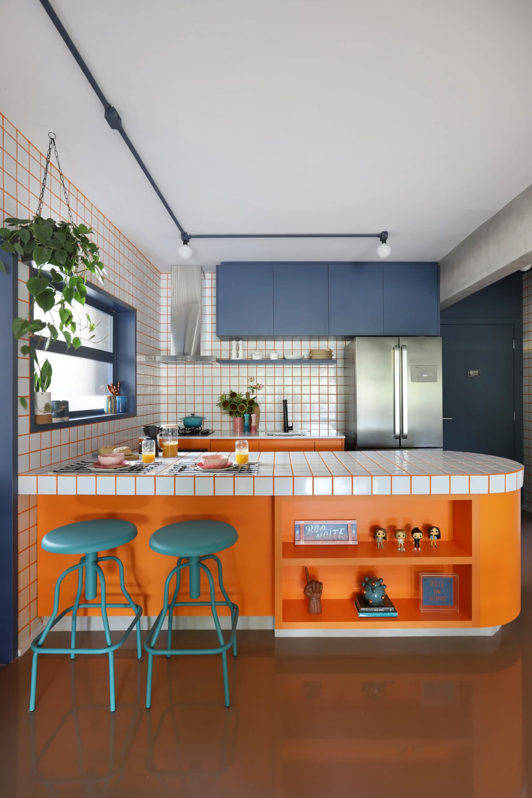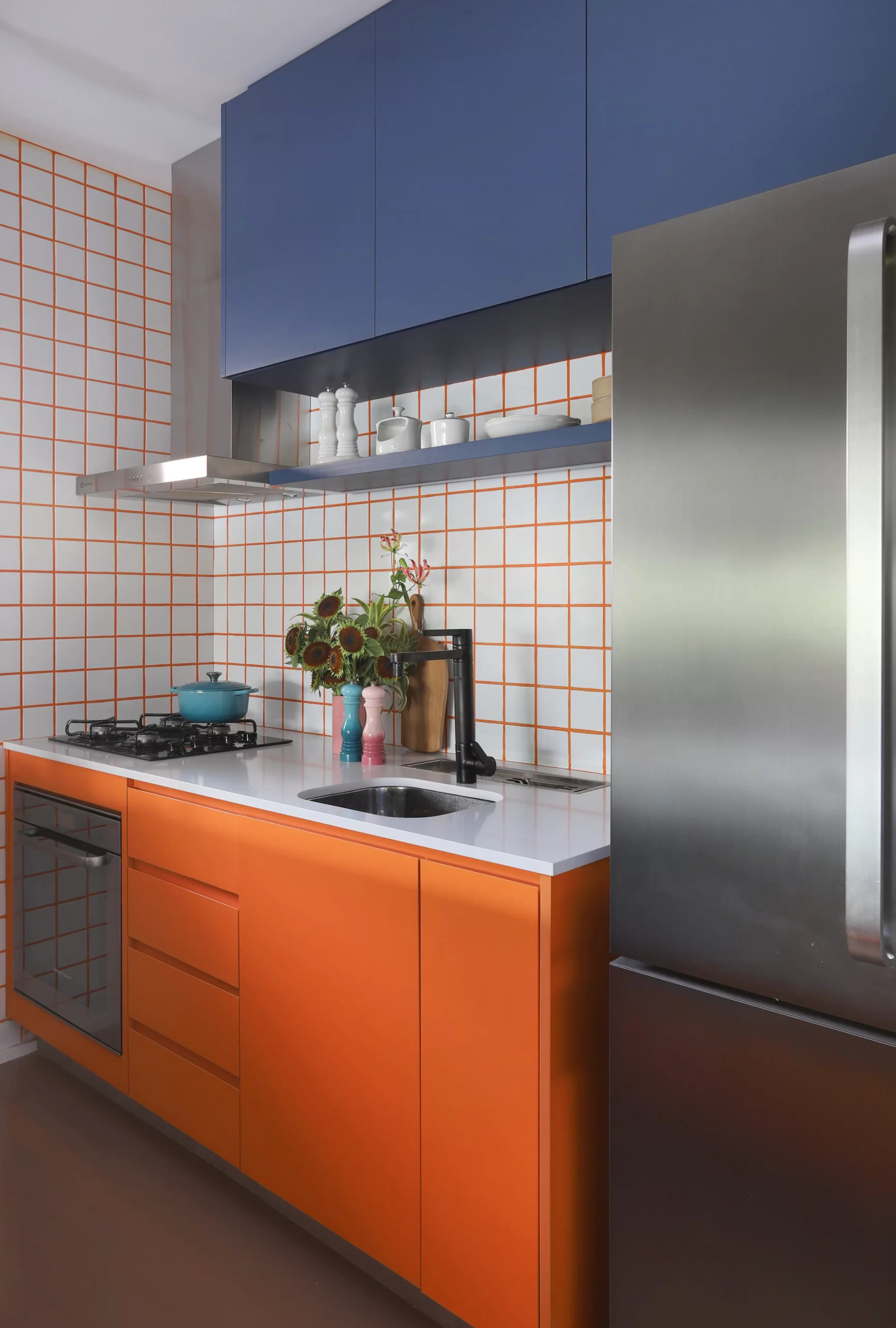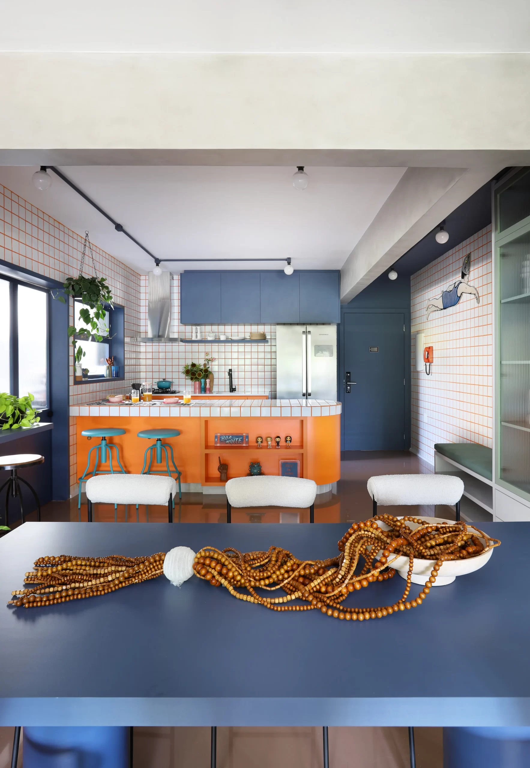 A cozinha, com armários coloridos e bancada curvilínea em fórmica laranja, traz ritmo e recebe destaque na área social. O tampo em cerâmica branca 9,5×9,5 cm e rejunte laranja cria o contraste central do projeto, repetido no backsplash, hall de entrada e chapelaria.
