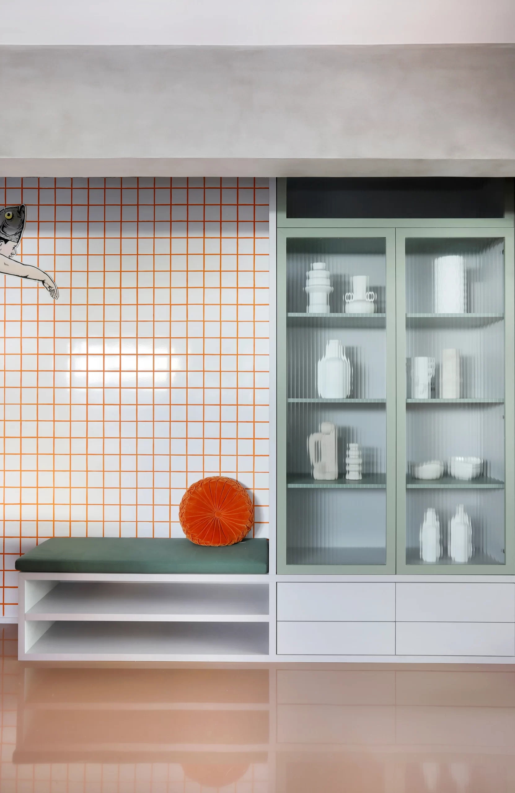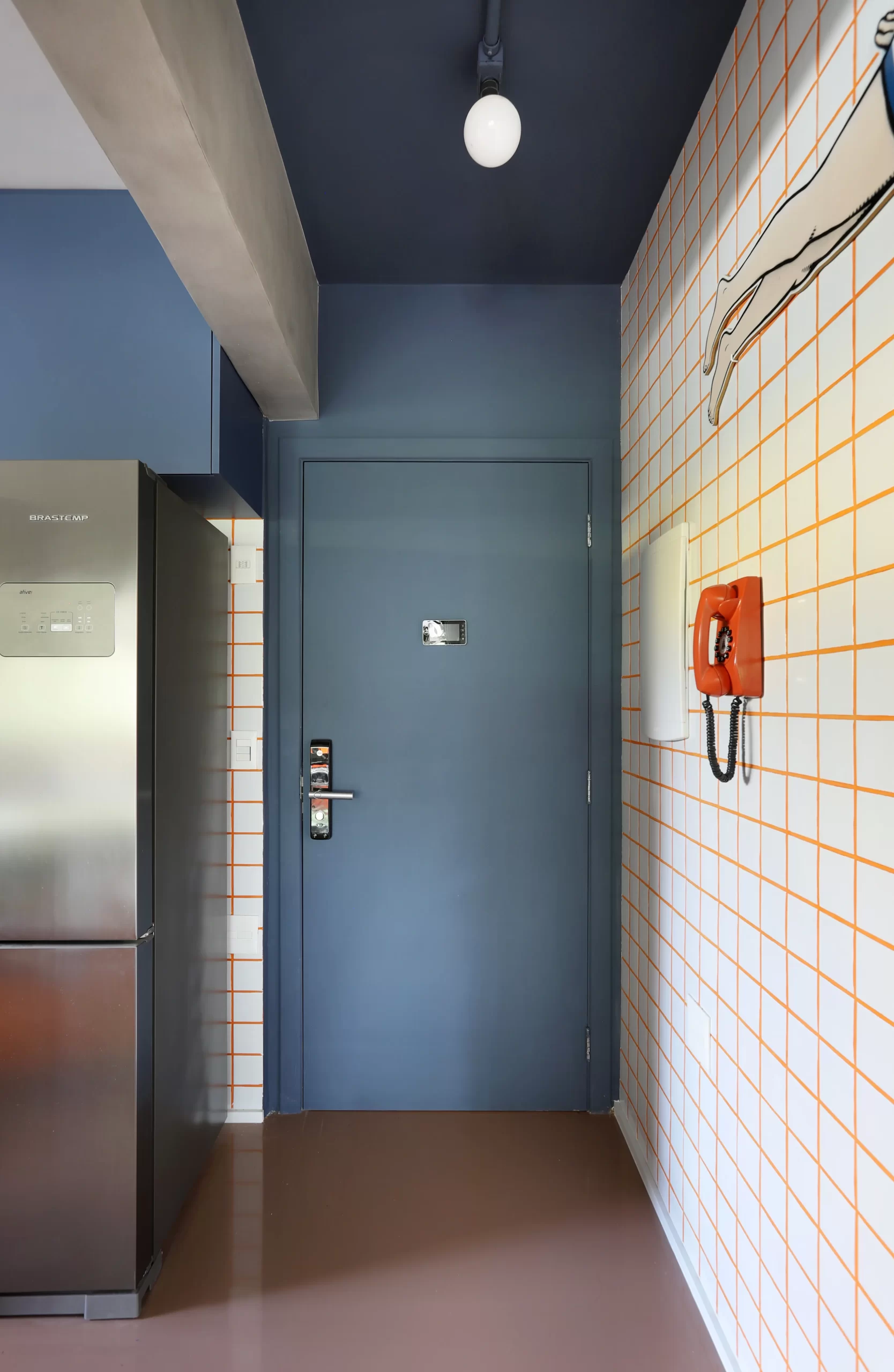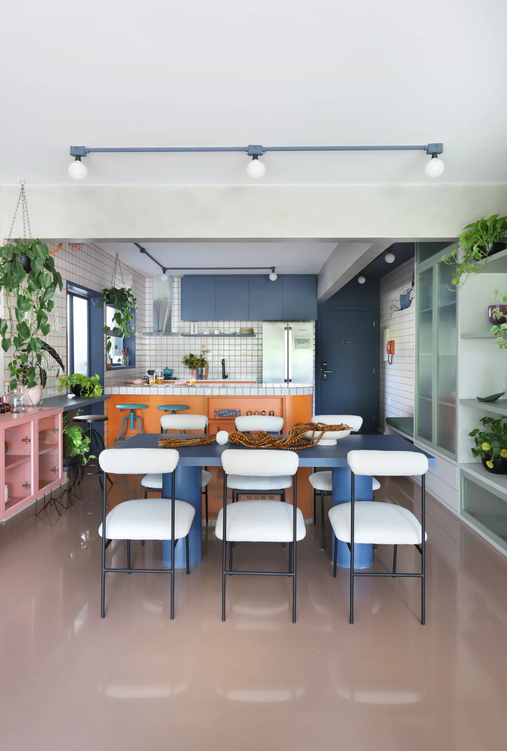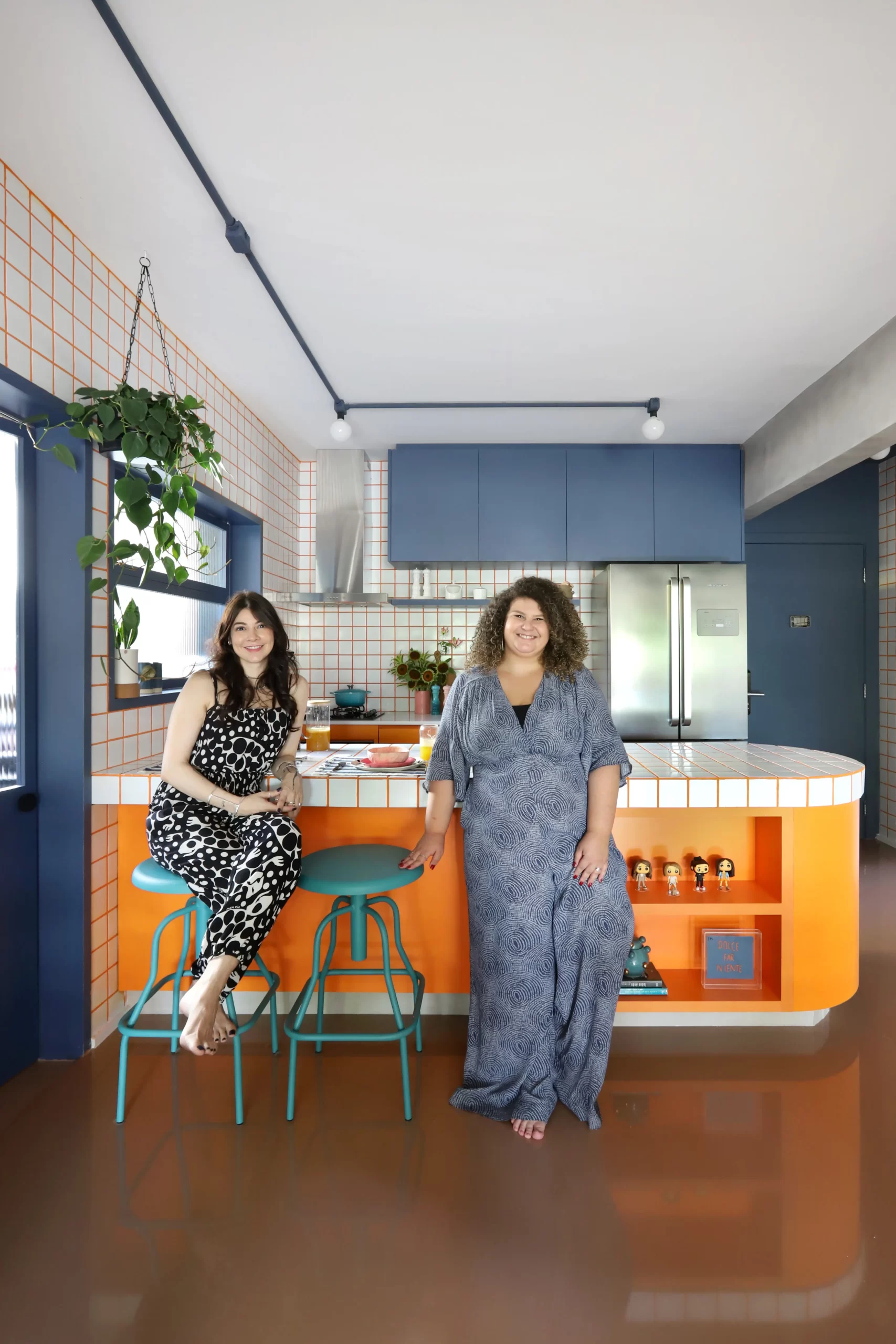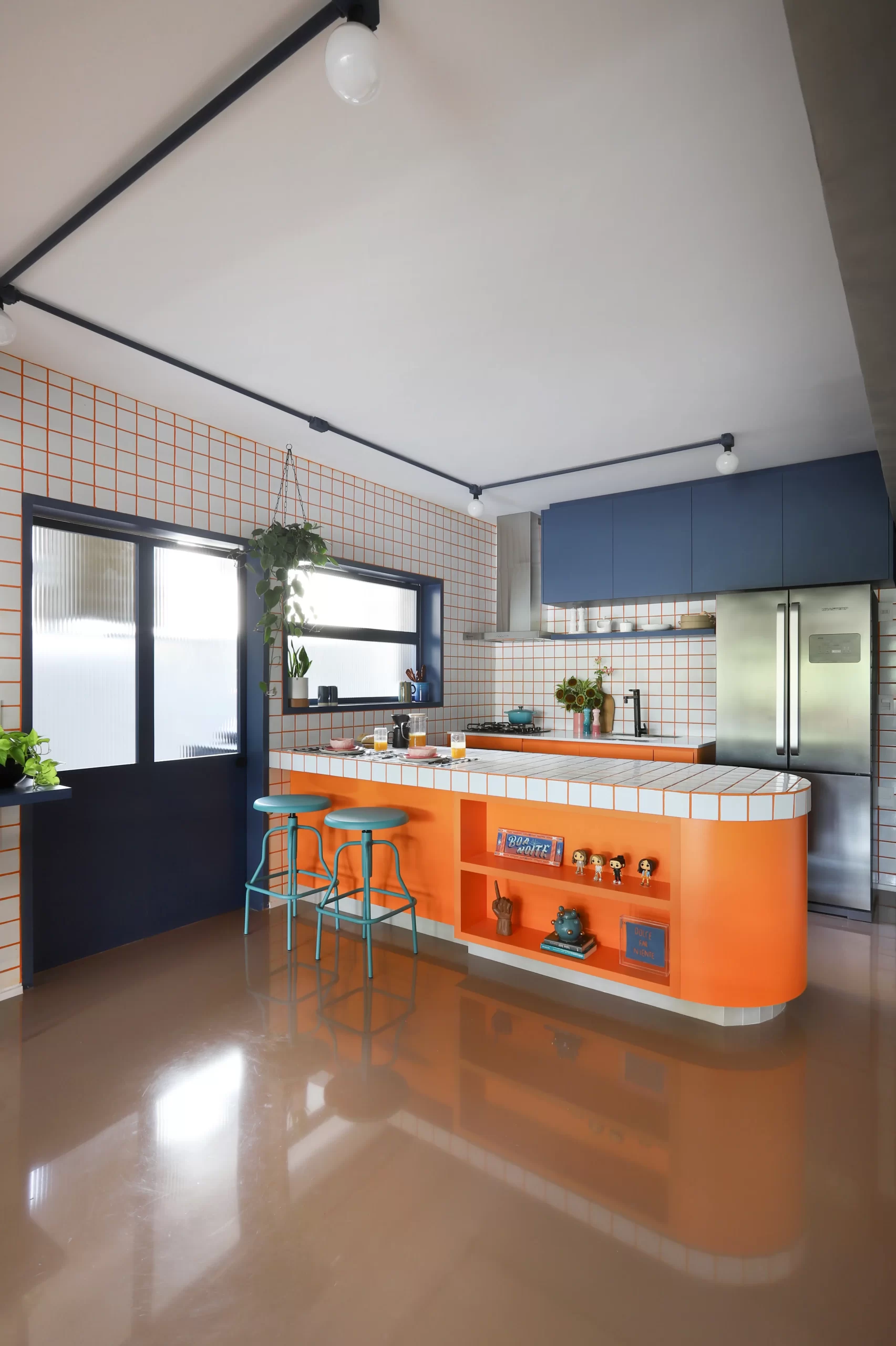 A cozinha, com armários coloridos e bancada curvilínea em fórmica laranja, traz ritmo e recebe destaque na área social. O tampo em cerâmica branca 9,5×9,5 cm e rejunte laranja cria o contraste central do projeto, repetido no backsplash, hall de entrada e chapelaria.