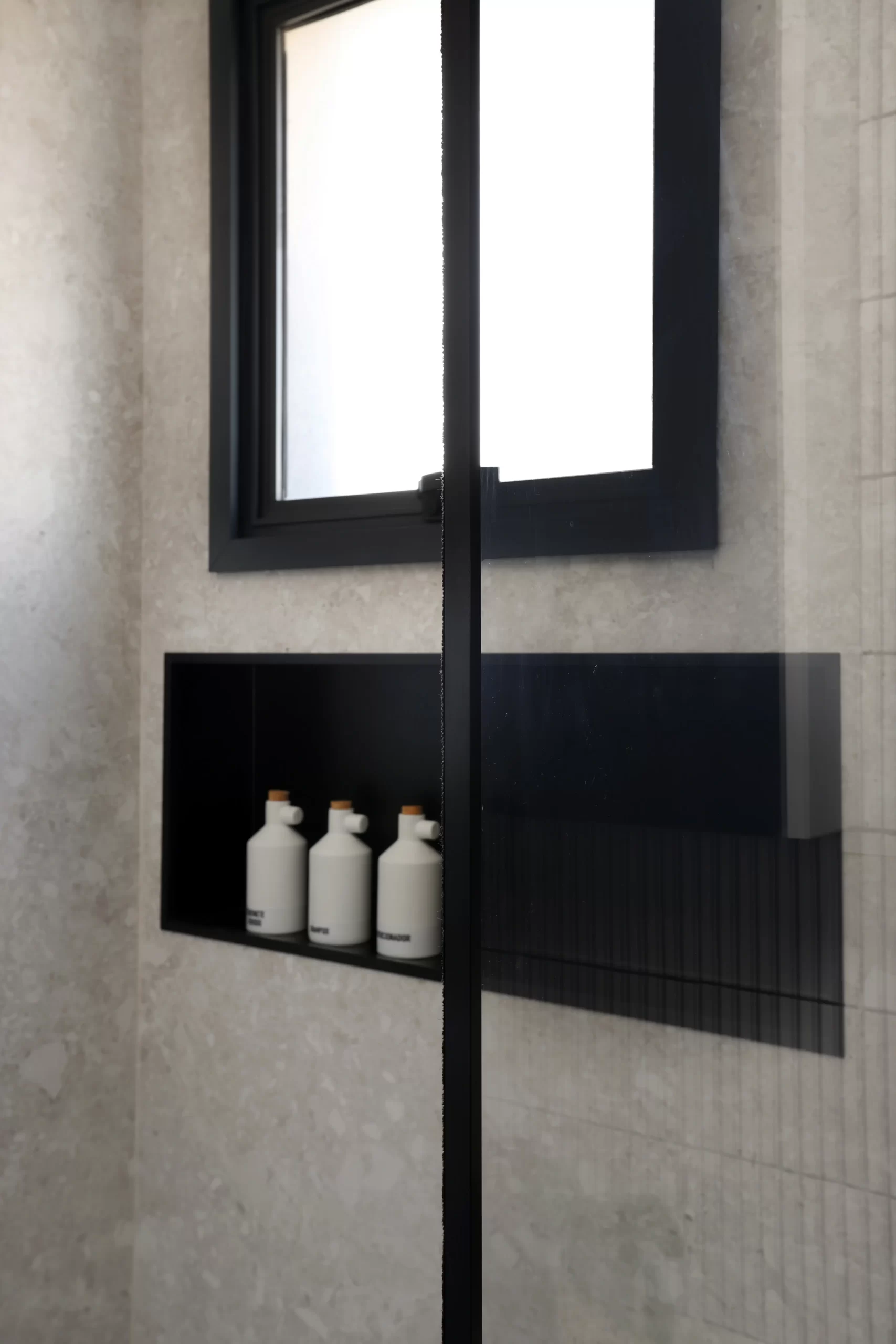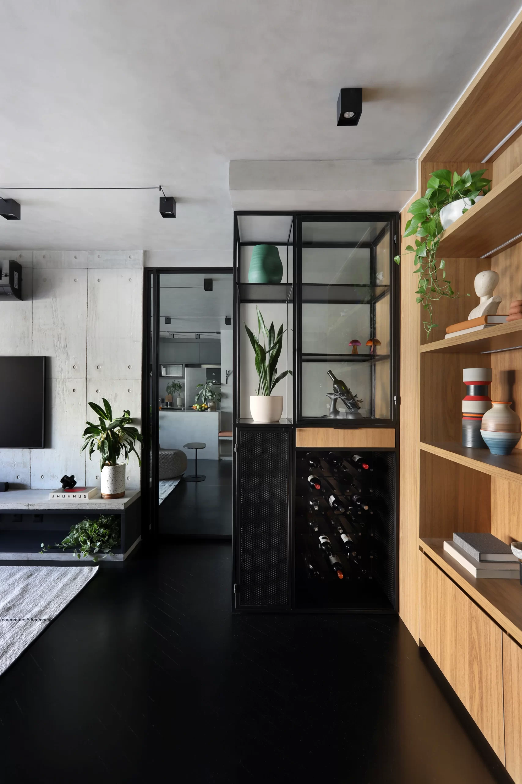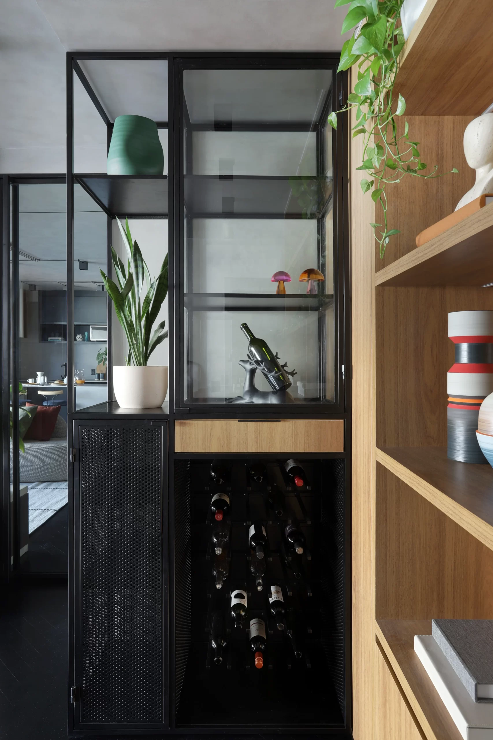 No hall de entrada, a serralheria preta aparece na adega desenhada sob medida, com nichos, armários perfurados e portas de vidro. O armário de apoio e a estante em madeira com iluminação interna complementam a composição com funcionalidade e contraste sutil.