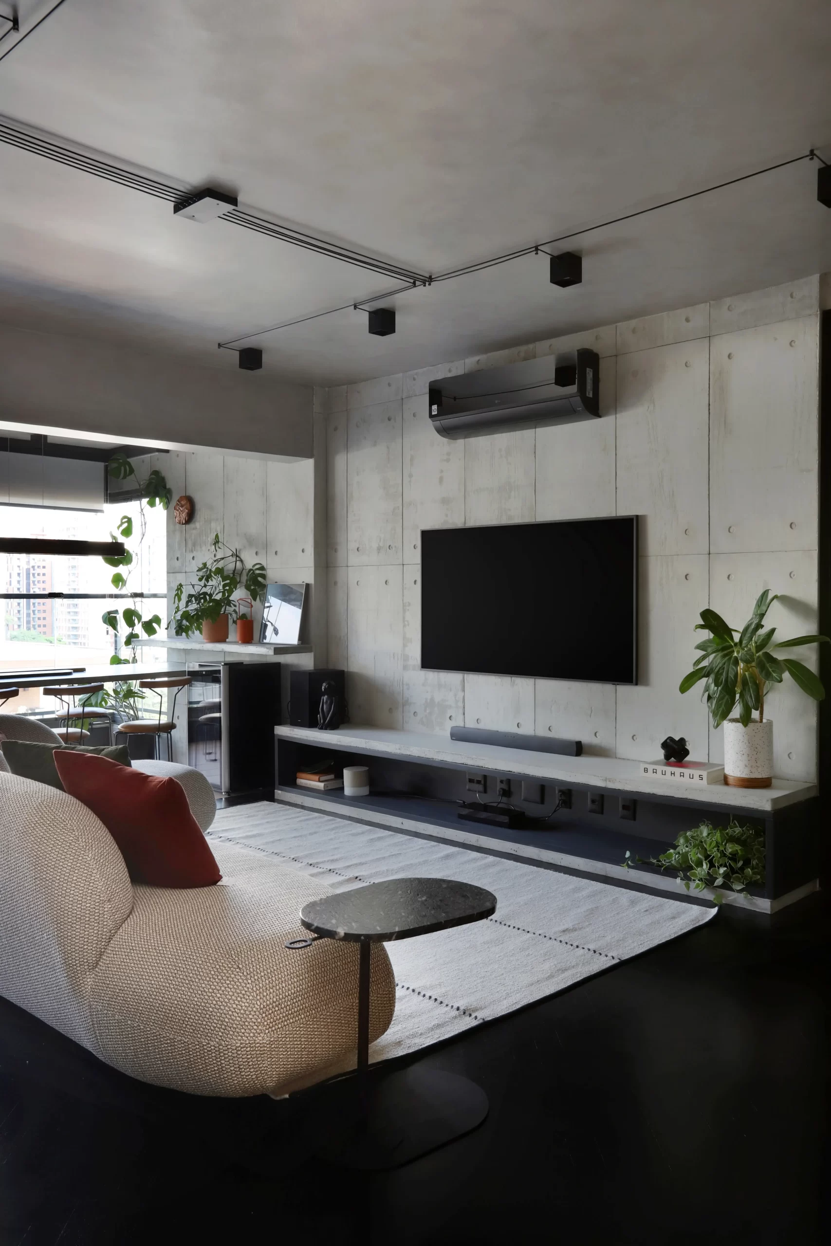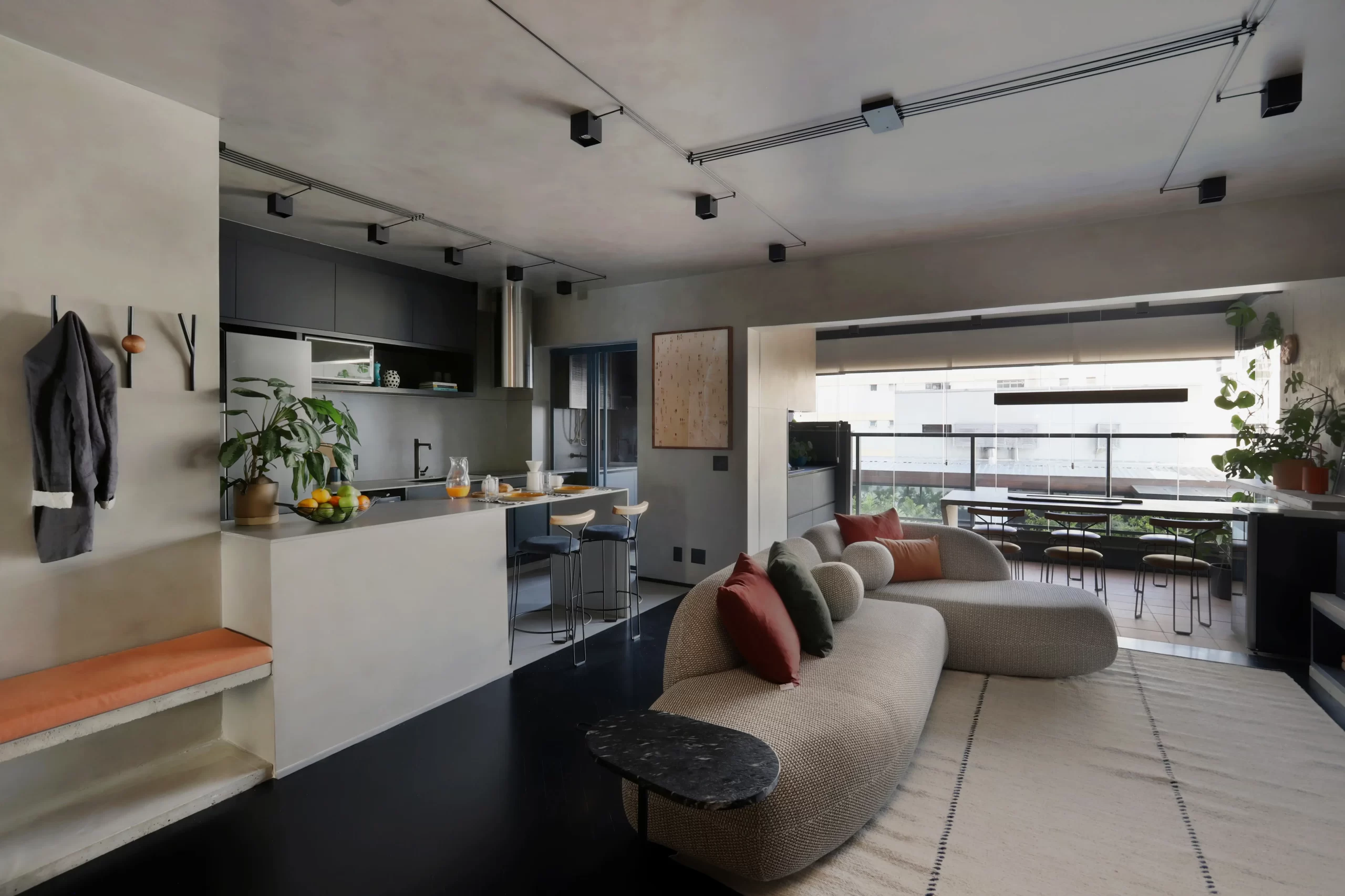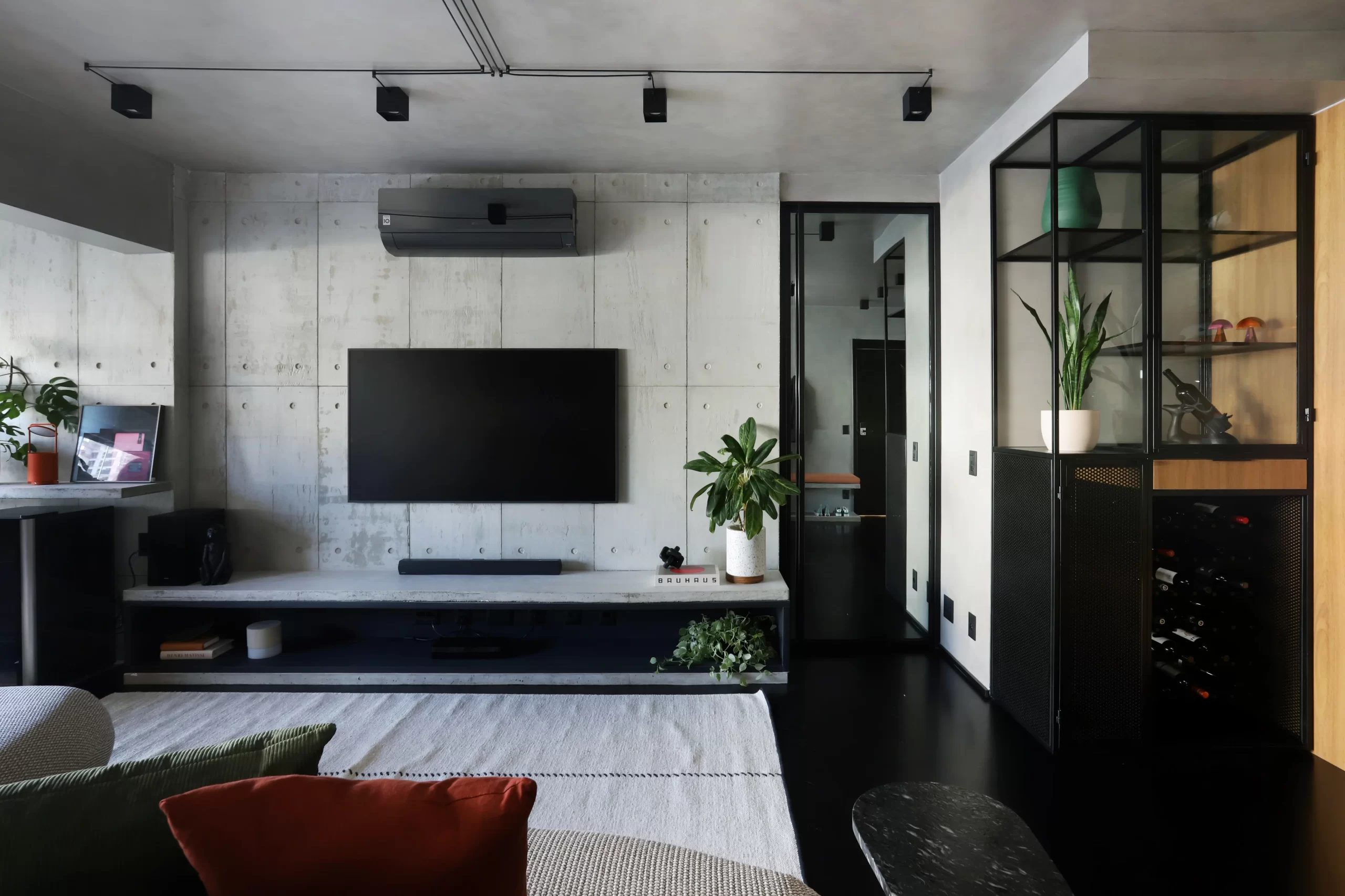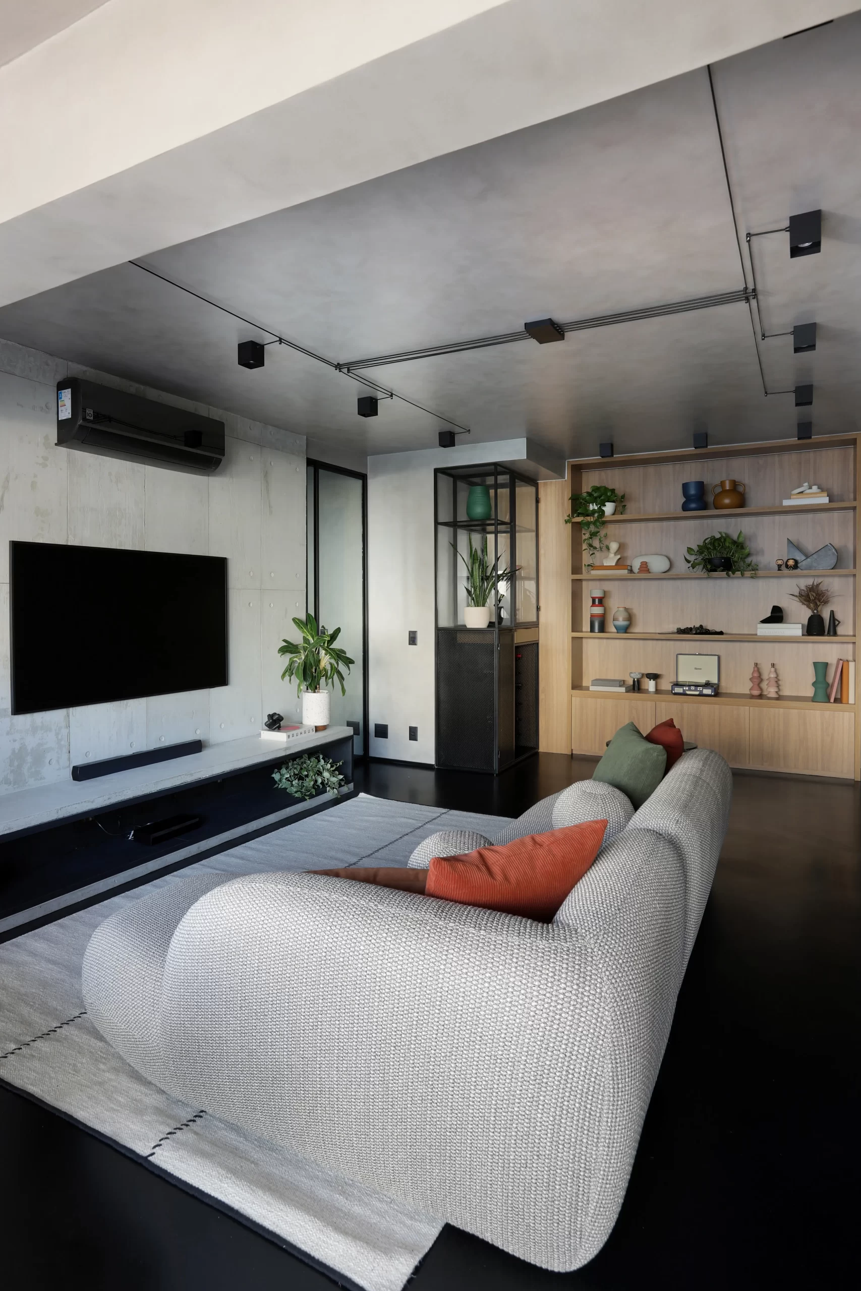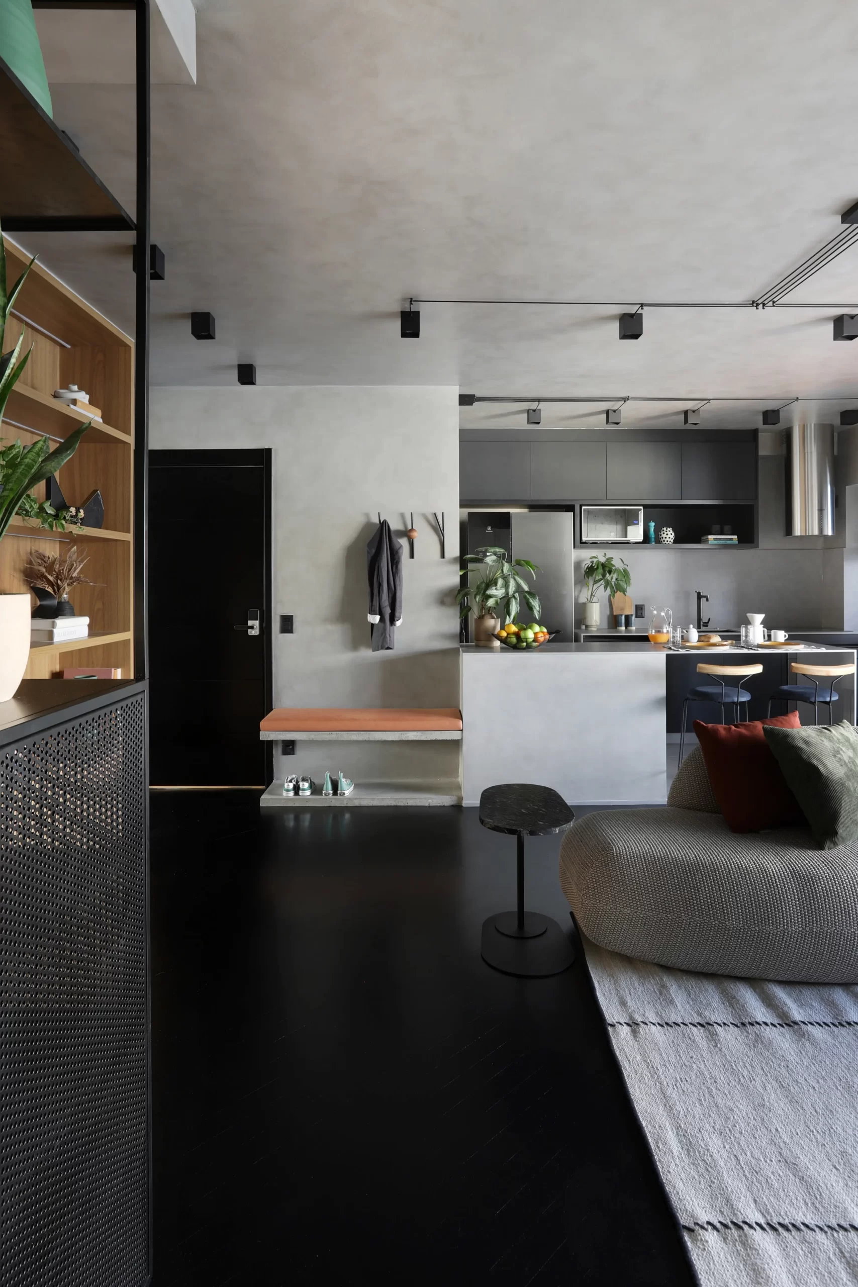 Com 98m, localizado em Pinheiros, o Apê Ébano explora o estilo industrial de forma contemporânea, valorizando o uso da serralheria, concreto aparente e tons escuros e sóbrios. O projeto partiu do pedido do cliente por um ambiente minimalista e funcional, com destaque para a marcenaria escura, estruturas metálicas e texturas que criam identidade sem excessos.