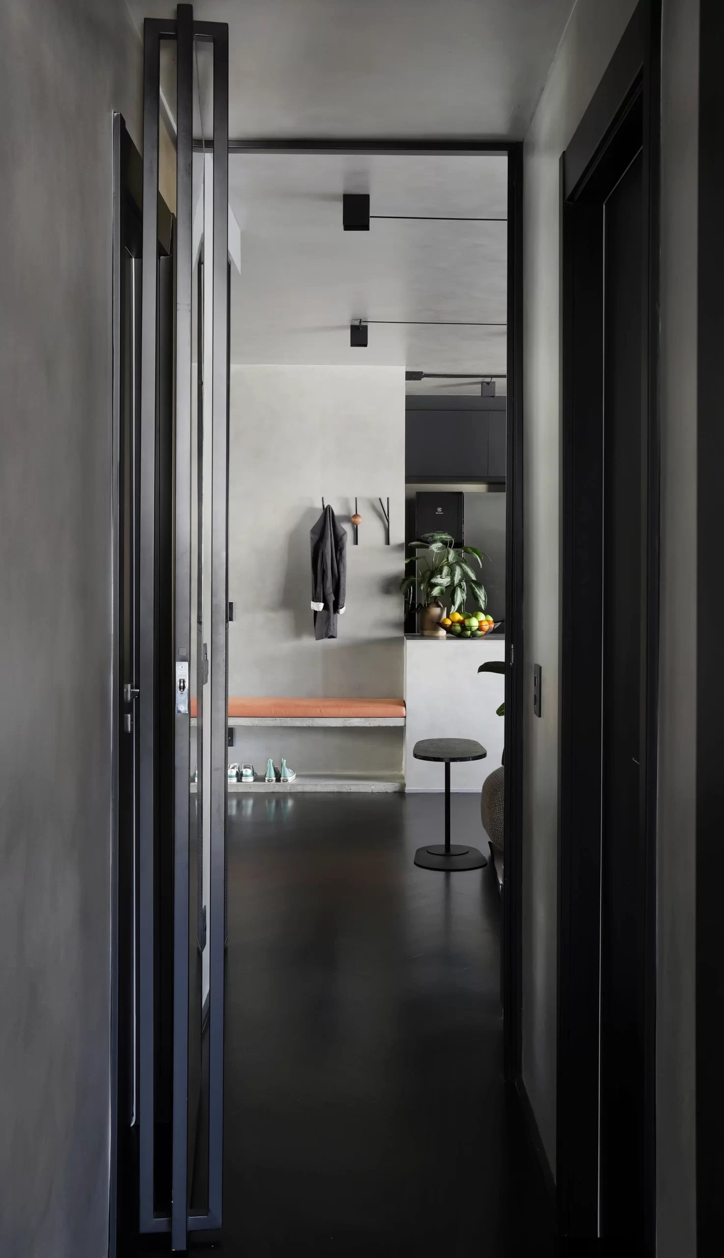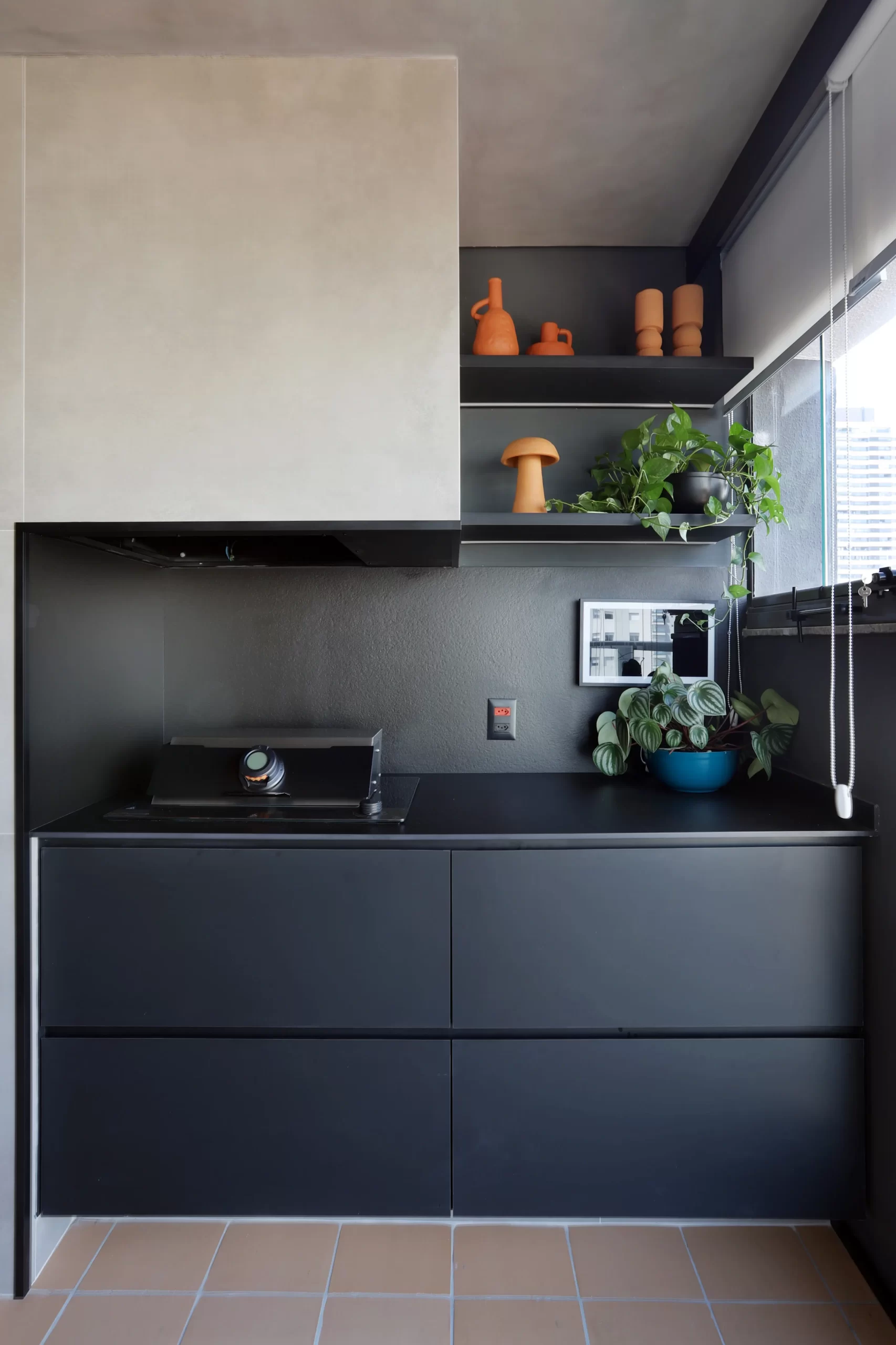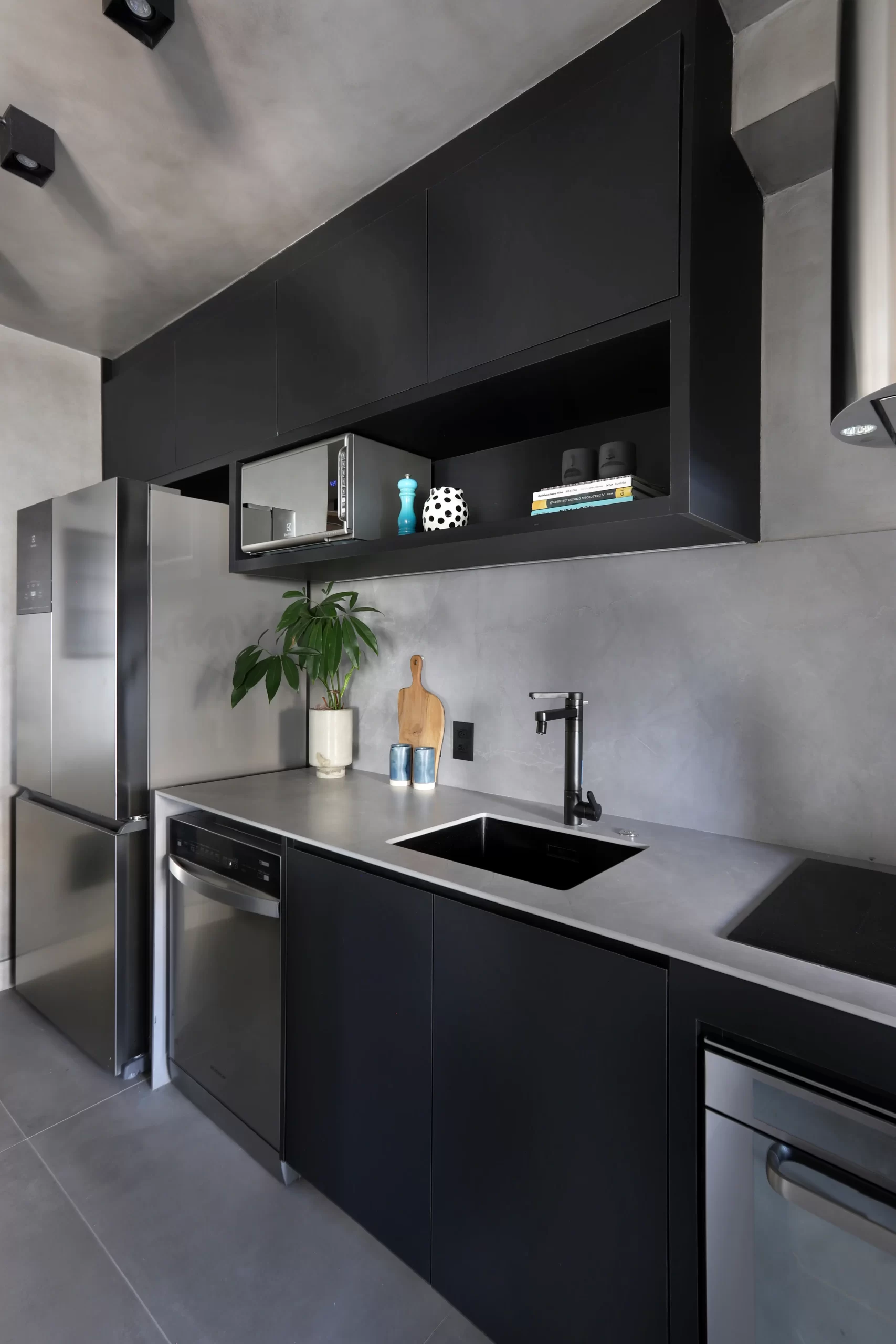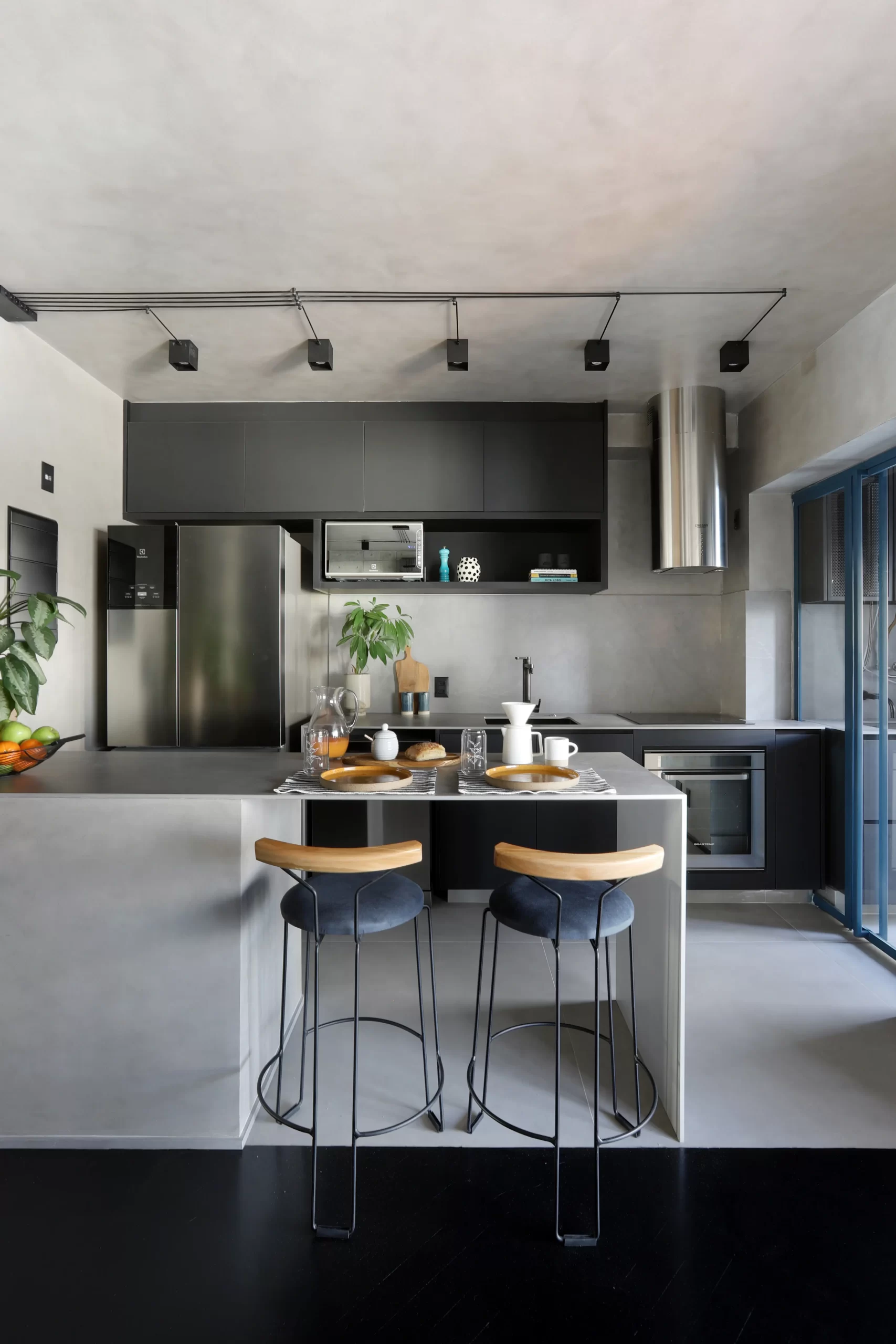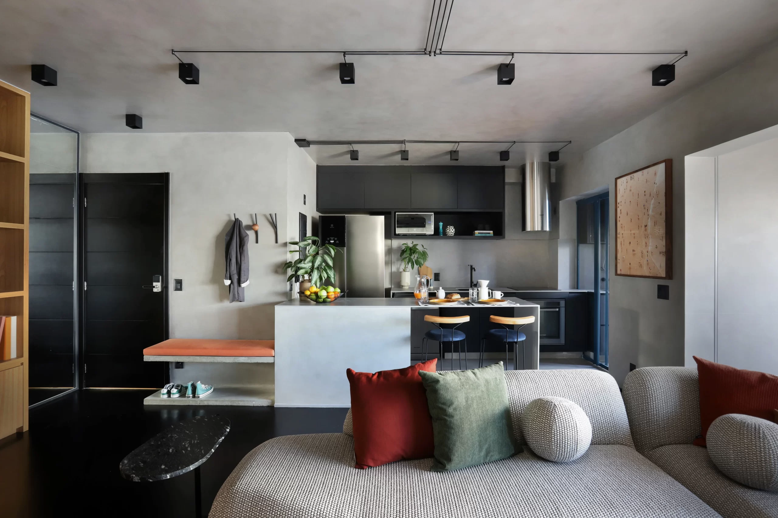 Com 98m, localizado em Pinheiros, o Apê Ébano explora o estilo industrial de forma contemporânea, valorizando o uso da serralheria, concreto aparente e tons escuros e sóbrios. O projeto partiu do pedido do cliente por um ambiente minimalista e funcional, com destaque para a marcenaria escura, estruturas metálicas e texturas que criam identidade sem excessos.