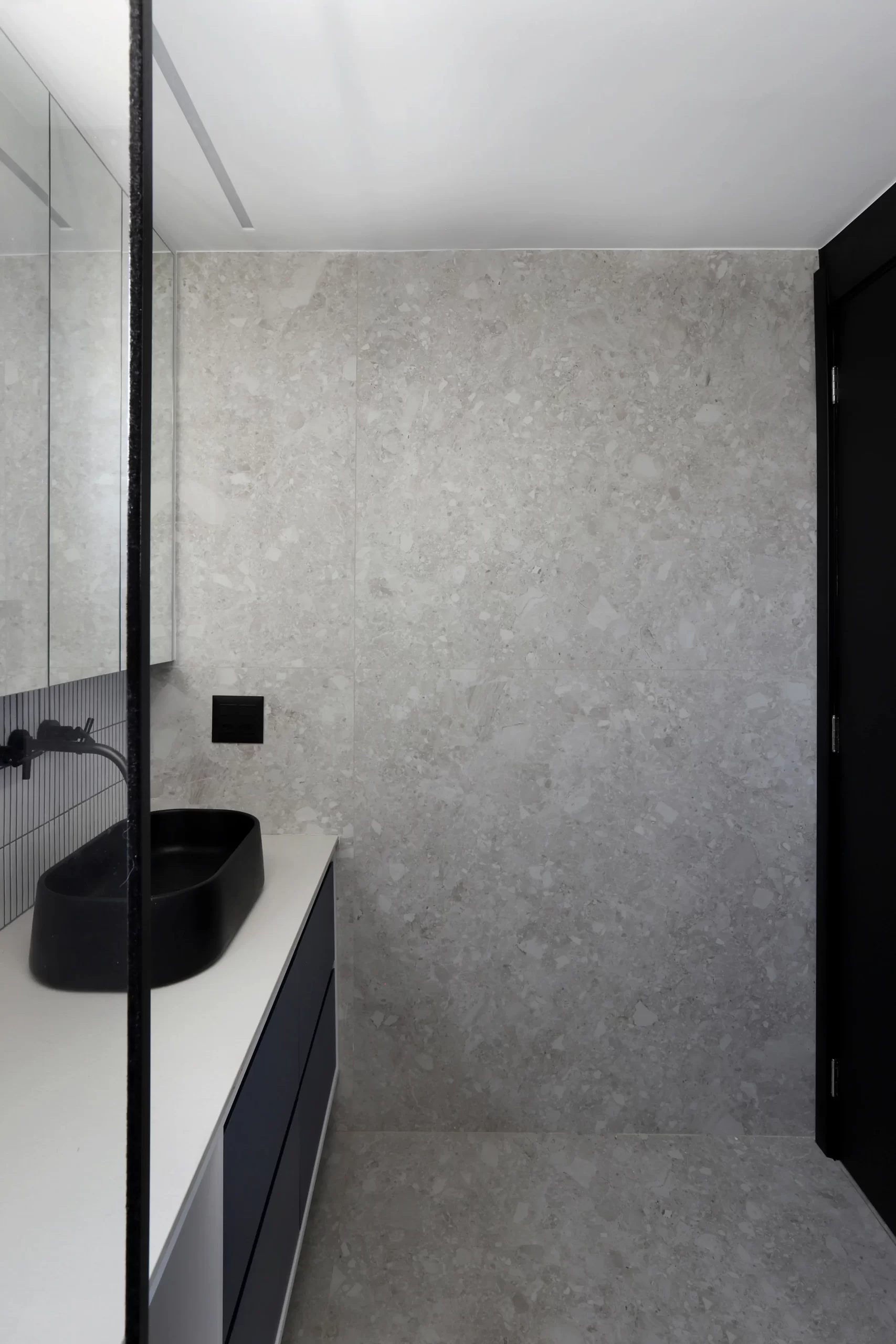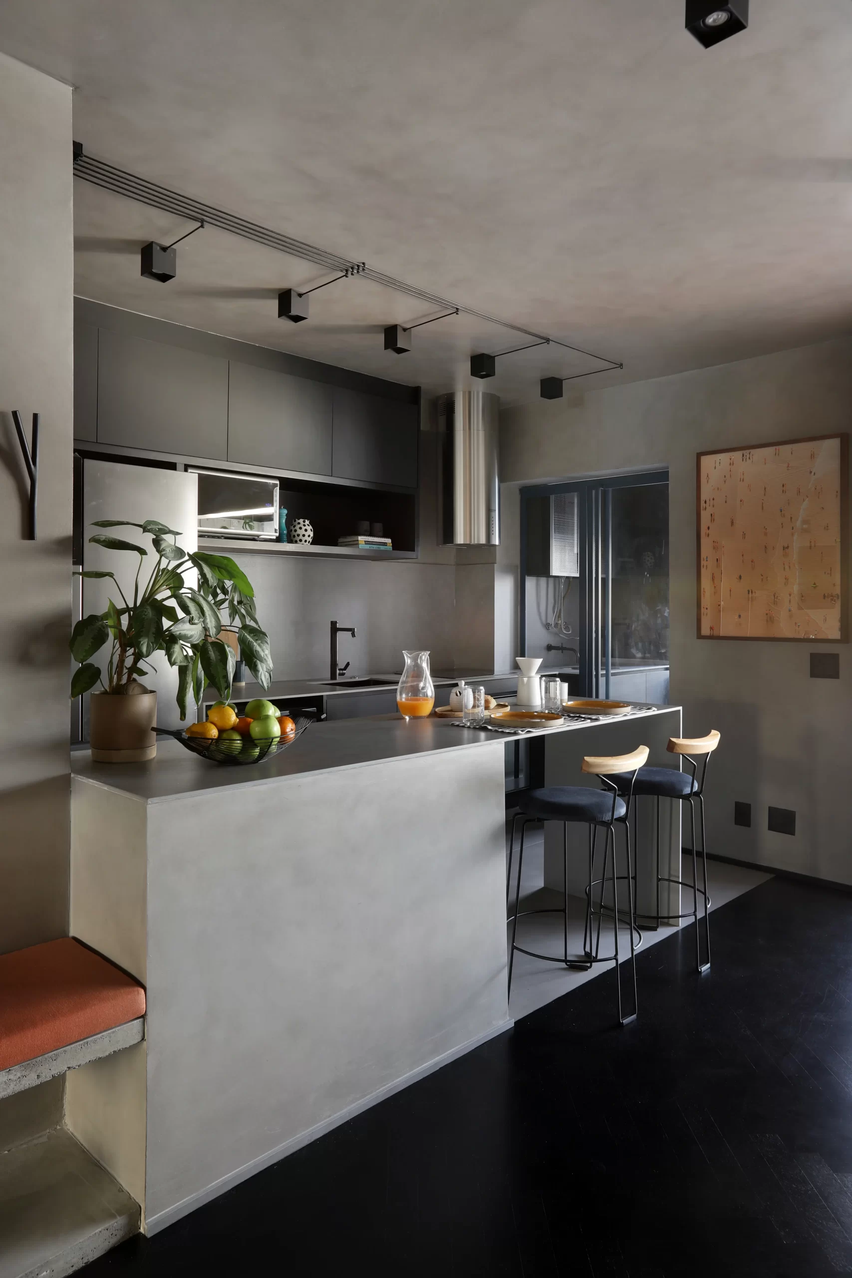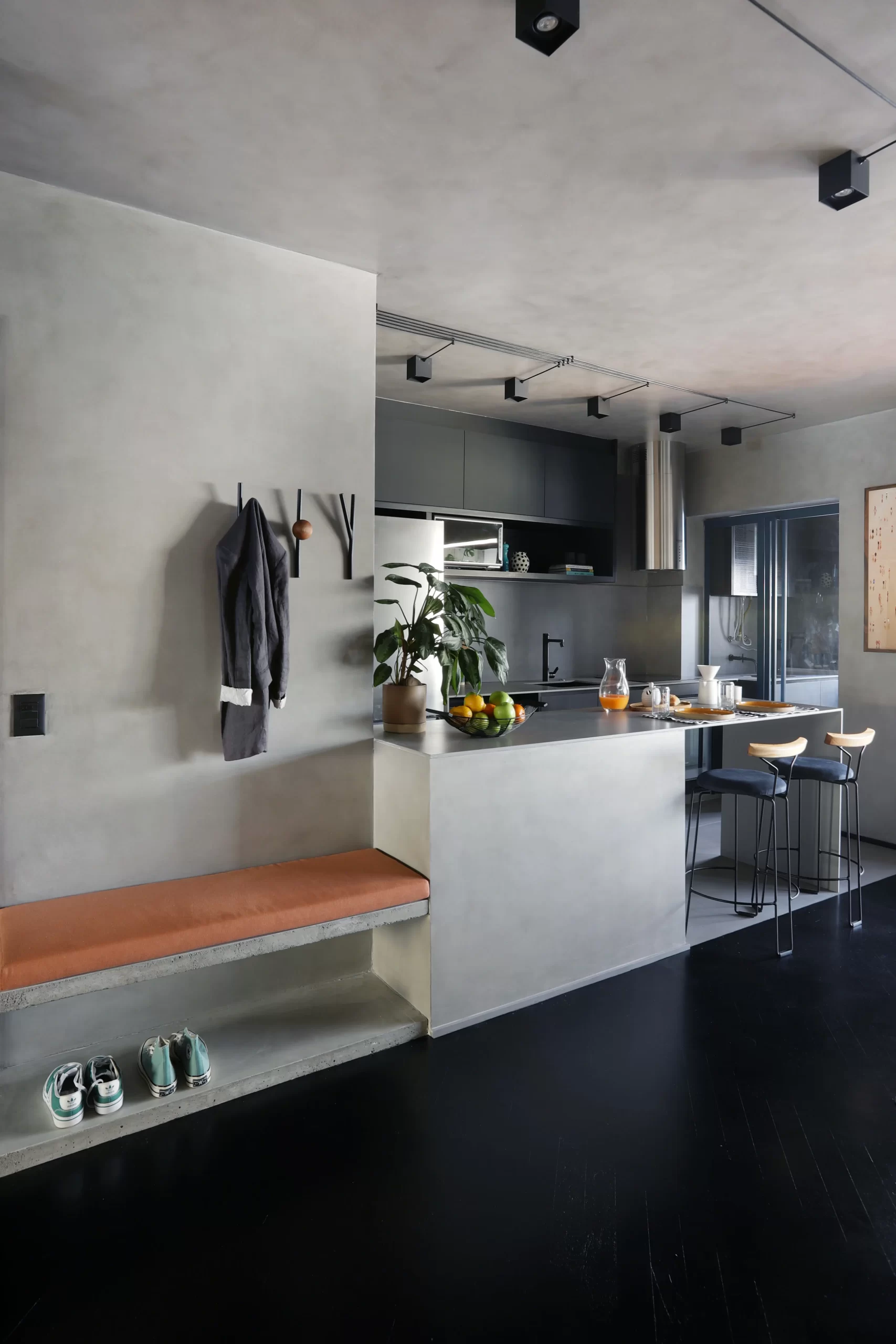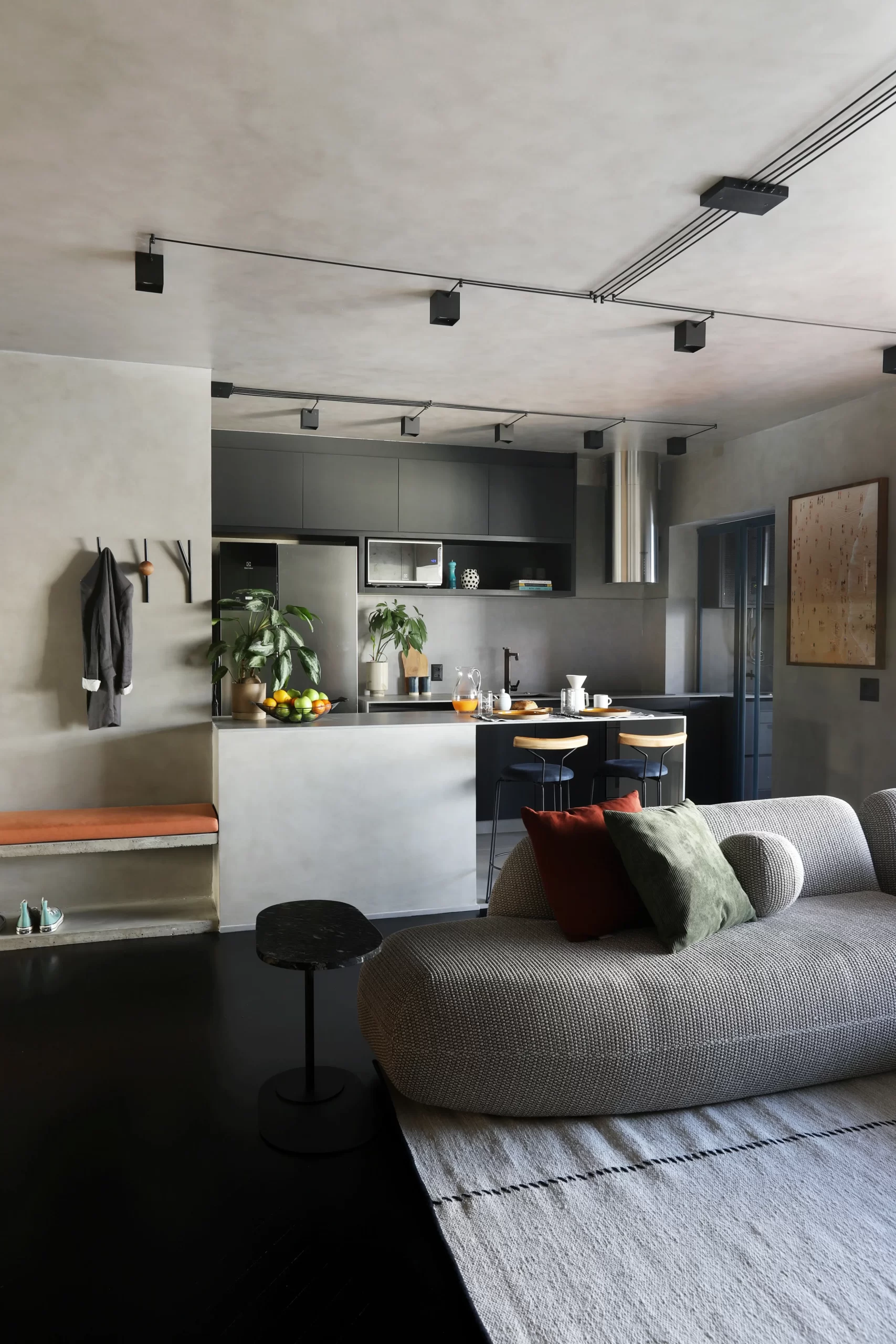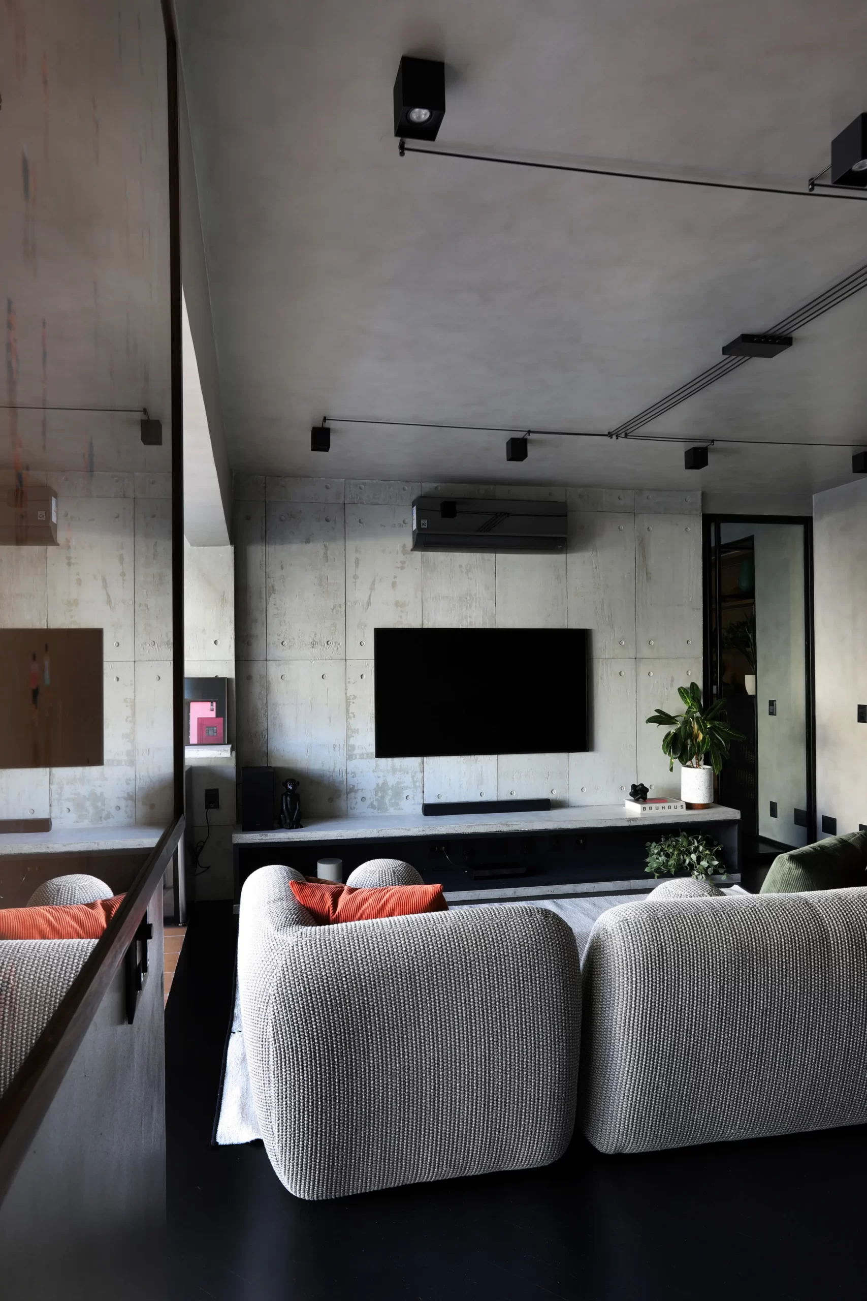 Com 98m, localizado em Pinheiros, o Apê Ébano explora o estilo industrial de forma contemporânea, valorizando o uso da serralheria, concreto aparente e tons escuros e sóbrios. O projeto partiu do pedido do cliente por um ambiente minimalista e funcional, com destaque para a marcenaria escura, estruturas metálicas e texturas que criam identidade sem excessos.