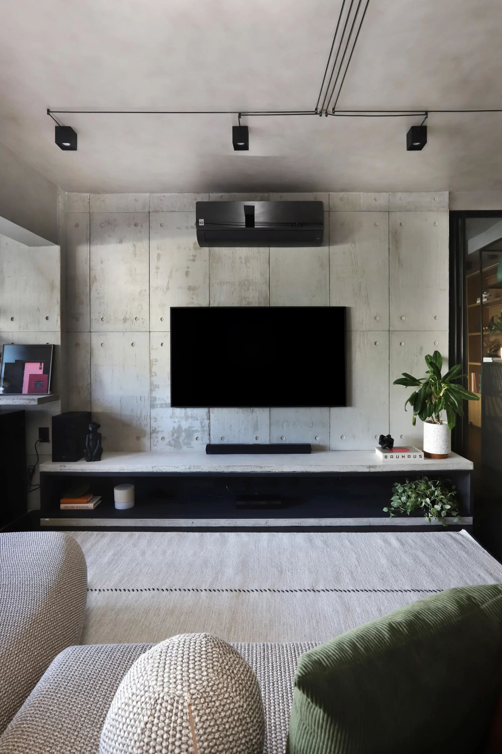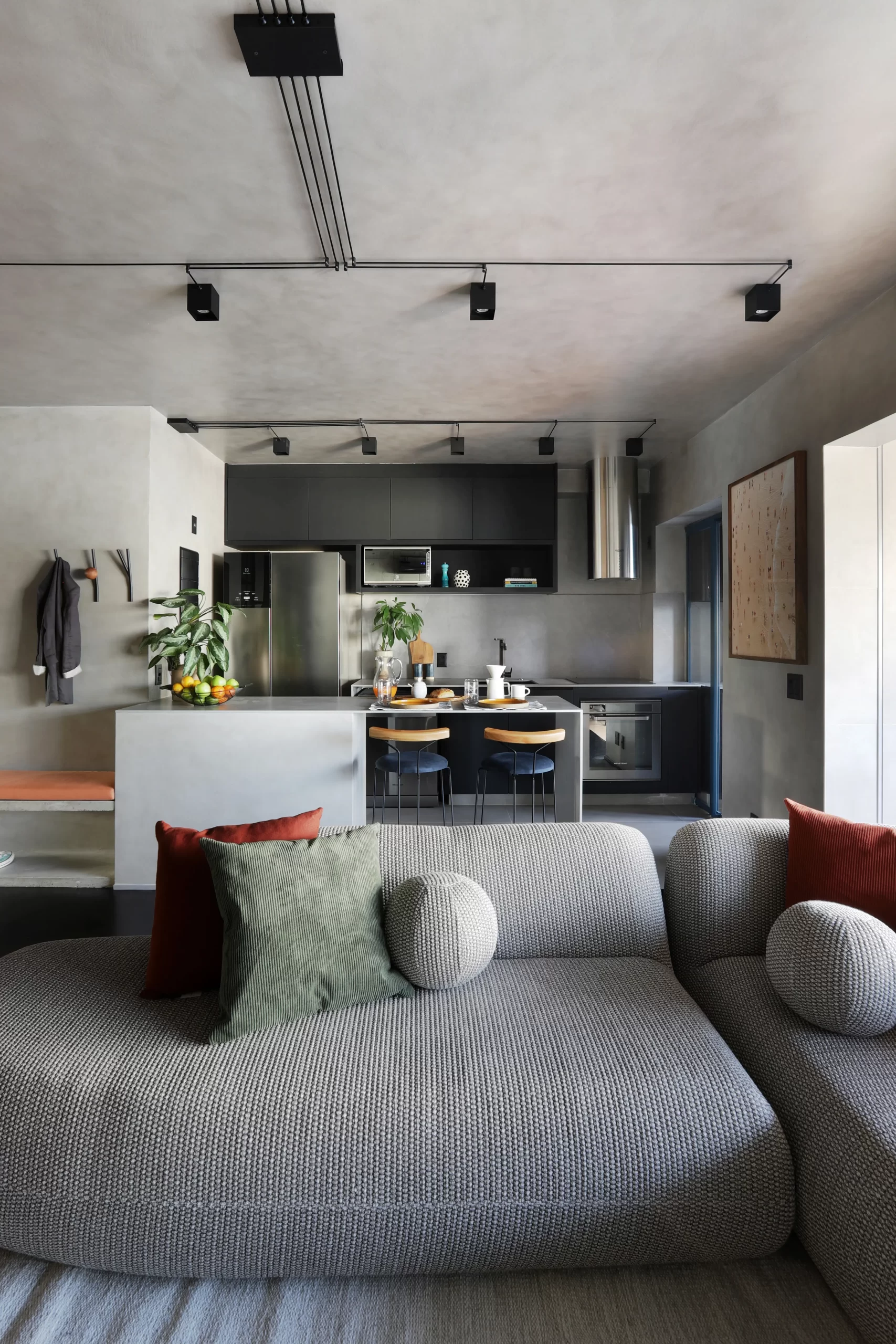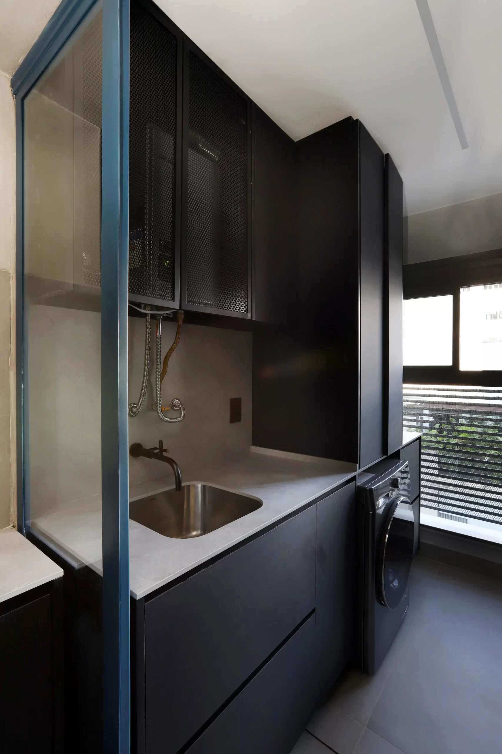 A parede da TV, revestida com placas que imitam concreto perfurado, se estende até a varanda, criando continuidade visual. A cozinha segue o mesmo tom, com bancadas e armários em cinza, metais pretos e backsplash alinhado à paleta. A separação entre cozinha e lavanderia é feita por uma porta de serralheria azul com vidro, garantindo luz e mantendo a linguagem do restante do projeto.