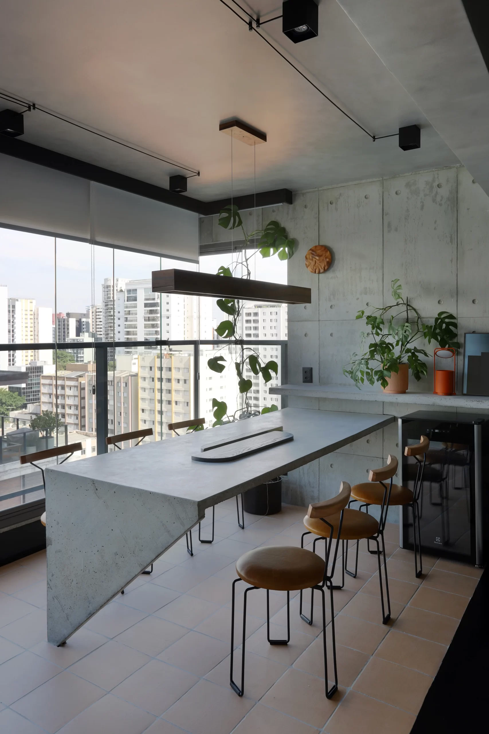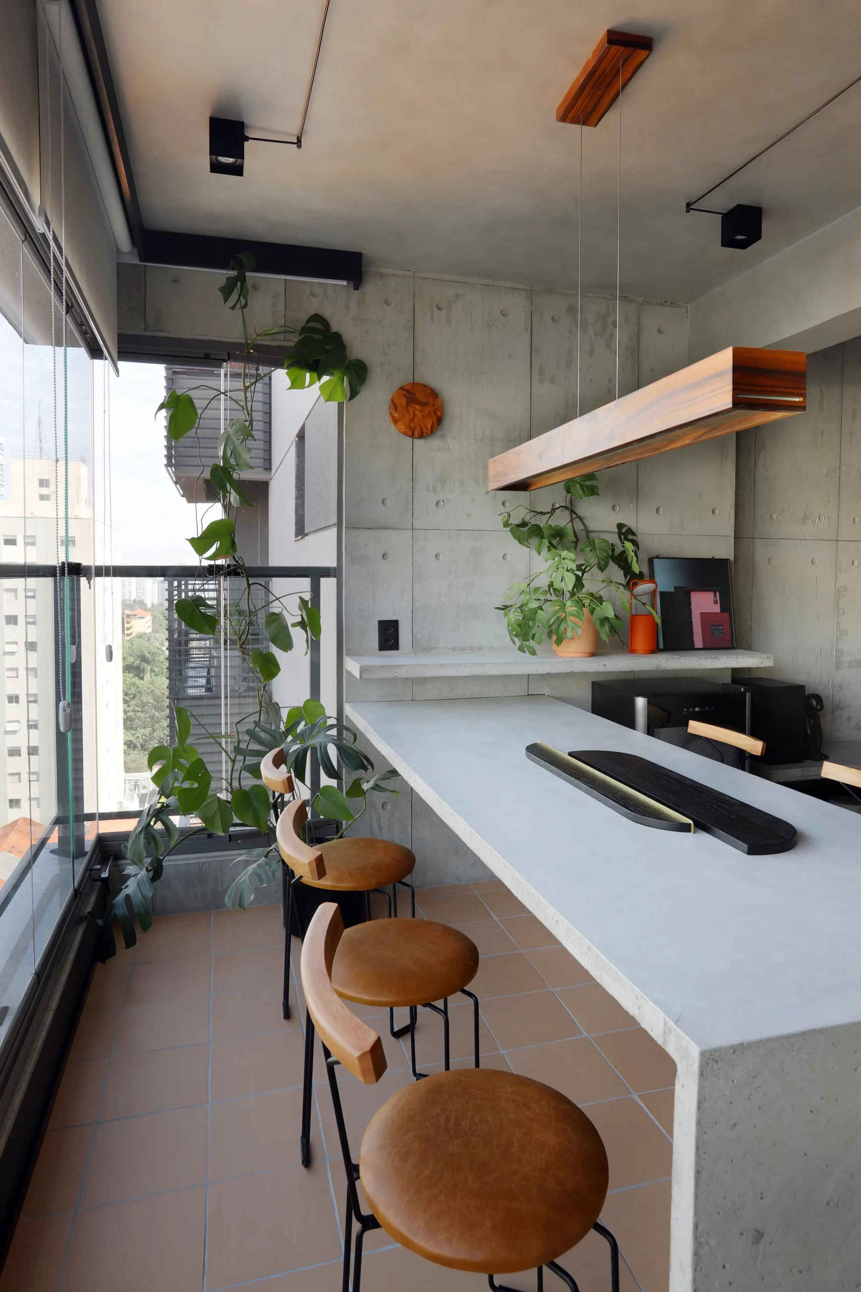 Na área social, o piso de madeira ebanizado dita o tom, literalmente. Ele contrasta com a cerâmica terracota da varanda, delimitando os espaços integrados após a remoção da antiga porta-balcão. A estrutura de iluminação de fios aparentes e os revestimentos placas de concreto reforçam a atmosfera urbana.