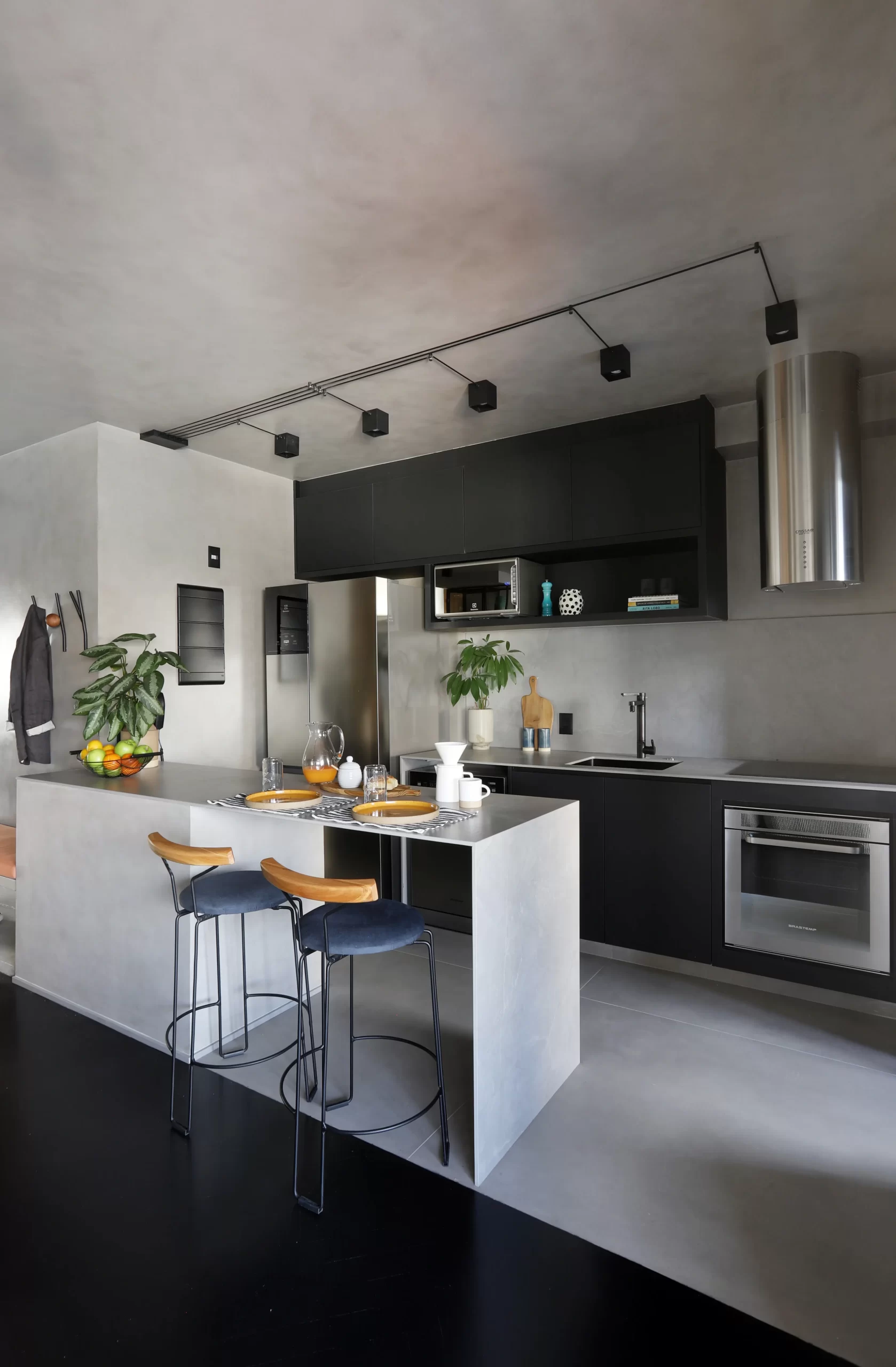O projeto partiu do pedido do cliente por um ambiente minimalista e funcional, com destaque para a marcenaria escura, estruturas metálicas e texturas que criam identidade sem excessos.