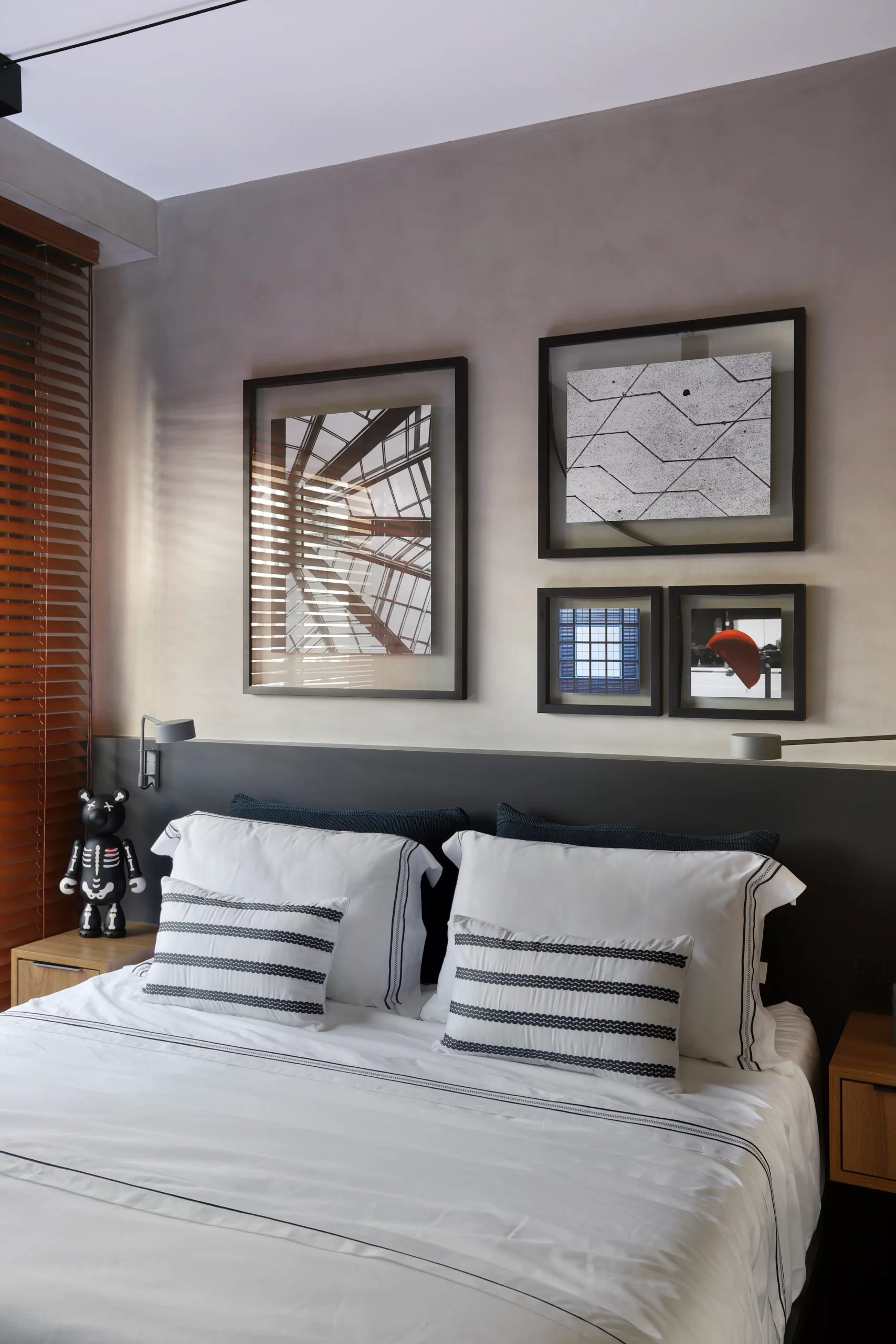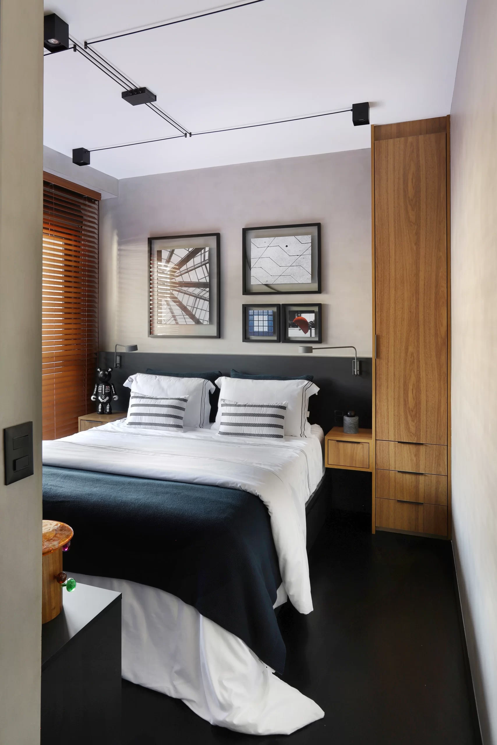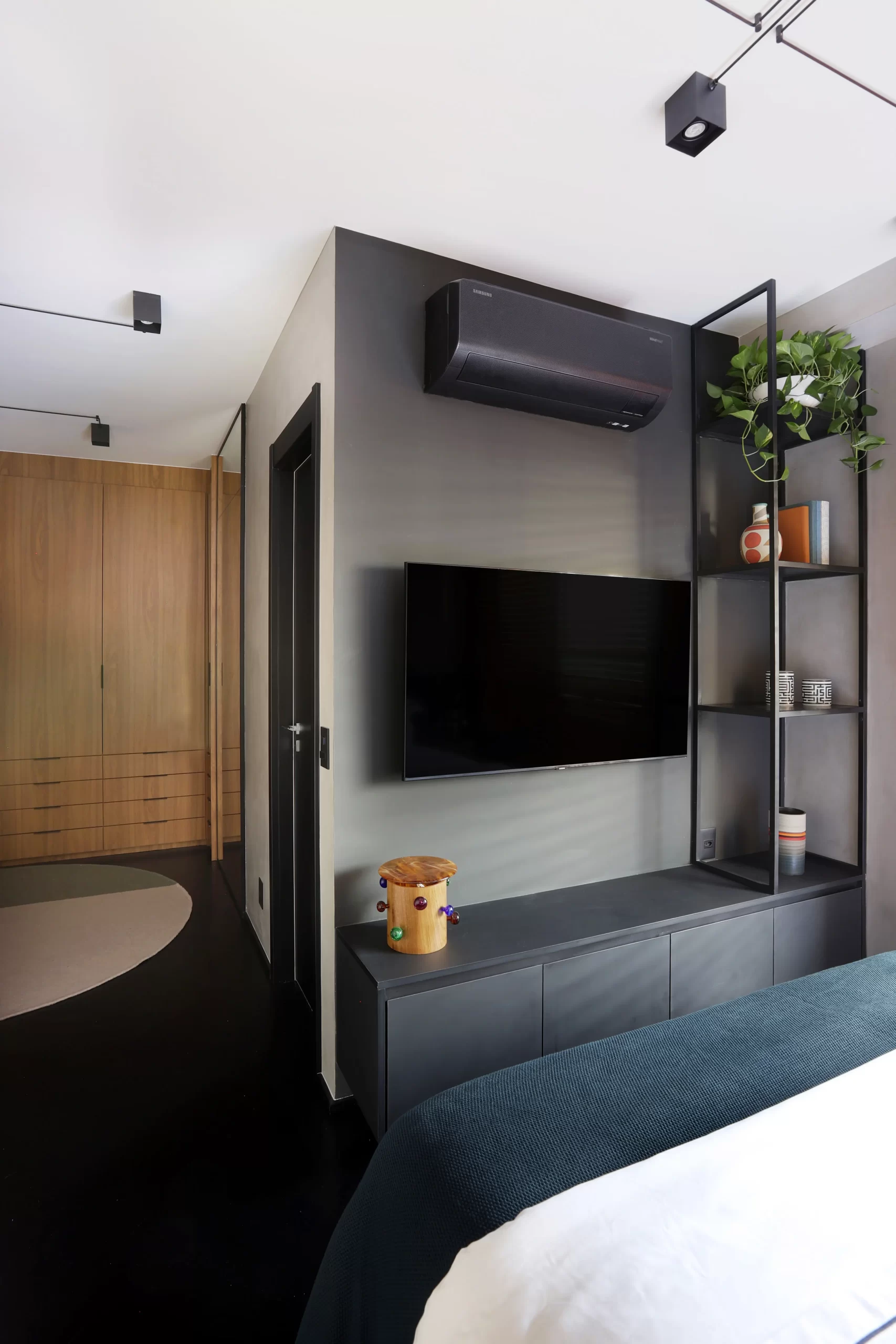 O home office conta com bancada em fórmica preta, nichos com iluminação e tomadas embutidas. Já a área da cama tem cabeceira em MDF preto com profundidade para objetos, mesas laterais suspensas e base com gavetões. Um banco sob a janela e o armário lateral em serralheria reforçam a estética industrial. Todas as portas foram laqueadas em preto, garantindo unidade ao projeto.