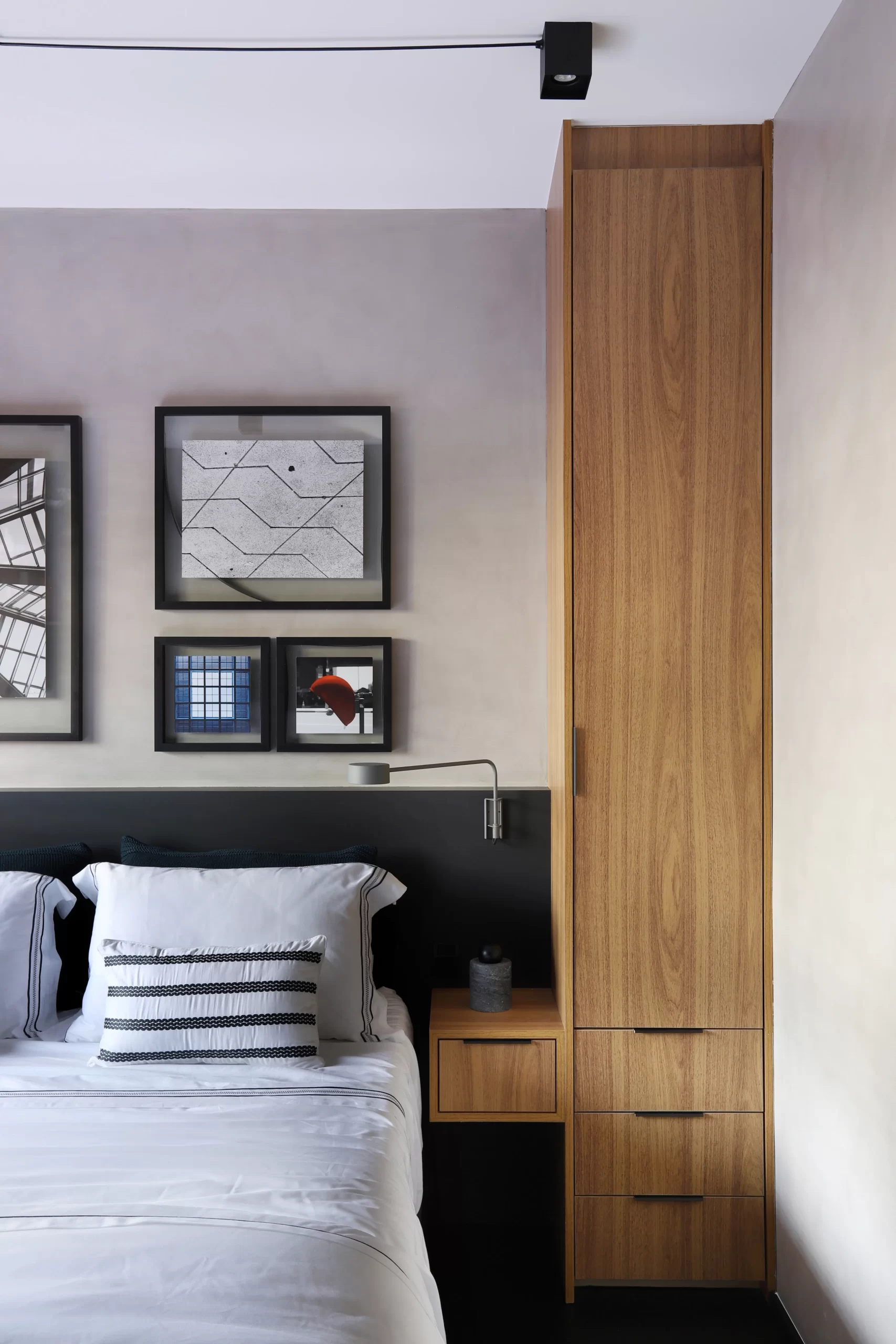 Na área íntima, os dois quartos foram unificados para criar um ambiente multifuncional, dividido por armários profundos que organizam o espaço entre descanso, closet e home office. Cada centímetro foi aproveitado com marcenaria sob medida, mantendo a mesma linguagem visual da área social.