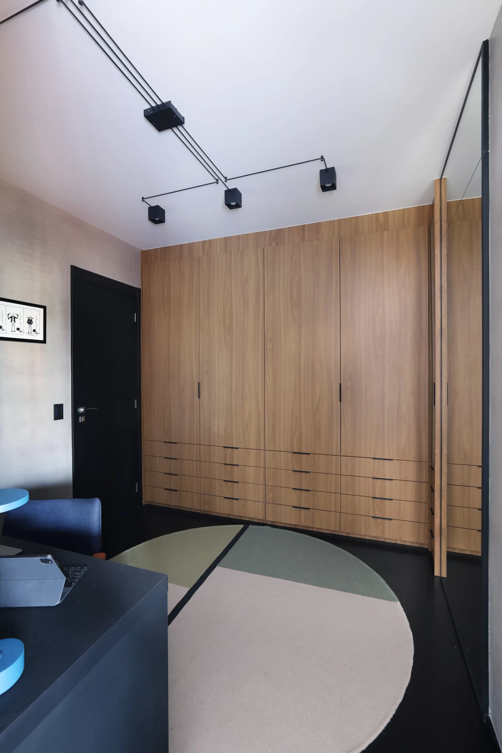 A área íntima do Apê Ébano concentra quarto, closet e home office em um único ambiente, com organização definida pela marcenaria. Armários em MDF amadeirado, com puxadores metálicos delicados, delimitam usos e aproveitam cada canto com soluções discretas de armazenamento.