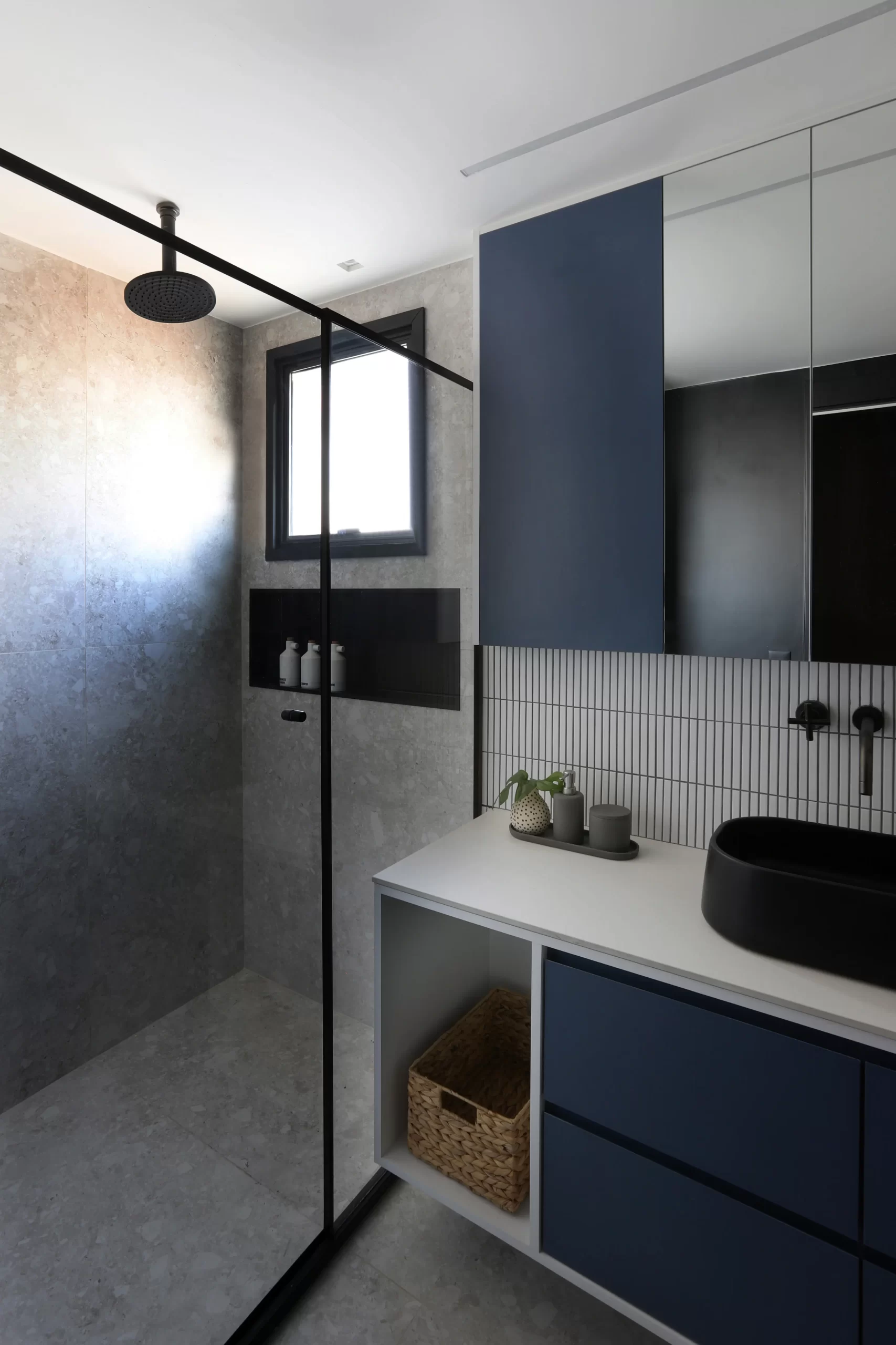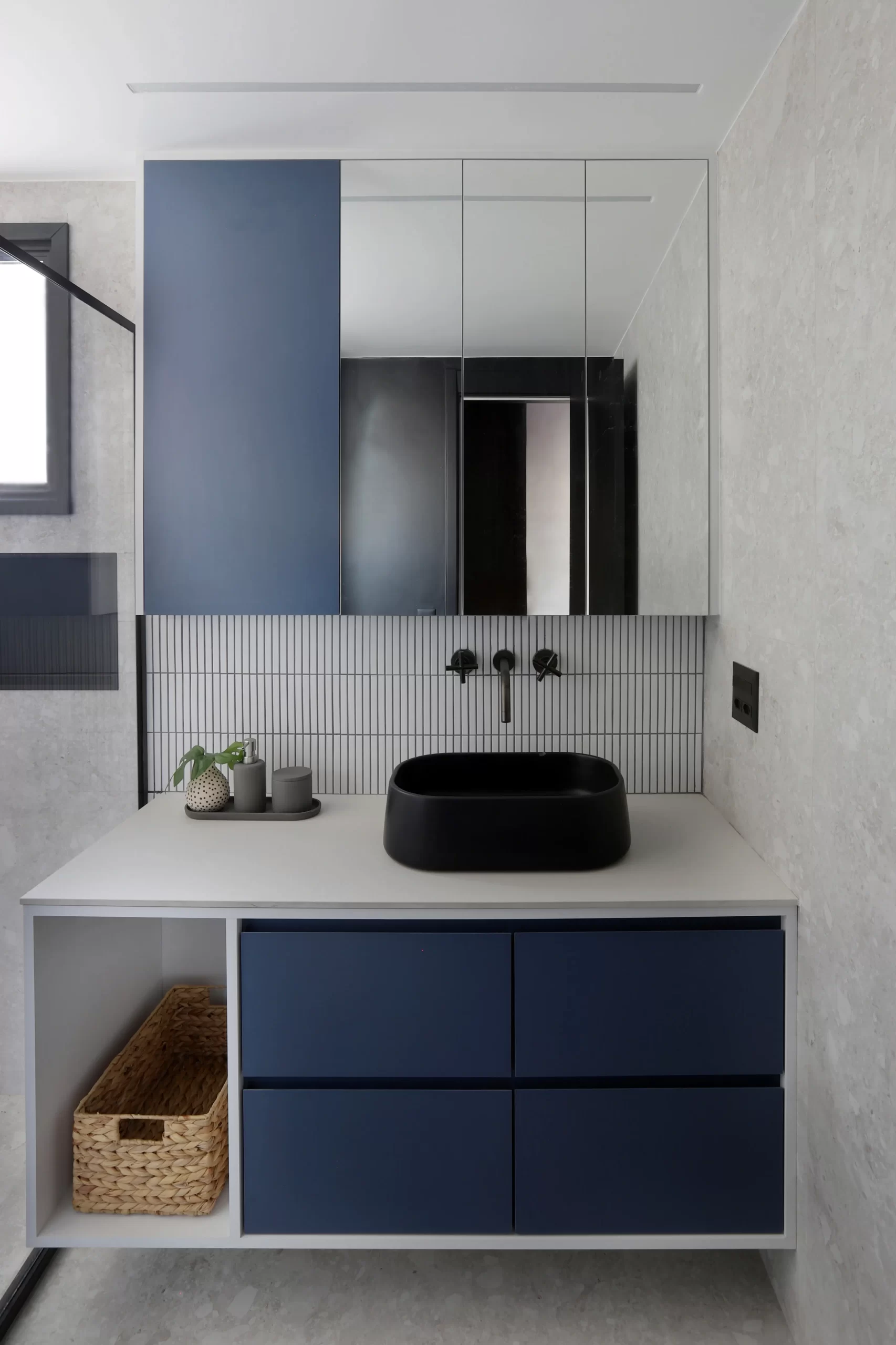 No banheiro da suíte, a cuba em concreto, metais pretos e armários azuis compõem um ambiente funcional e alinhado ao restante do apartamento. O lavabo traz revestimento com textura rústica no piso e meia parede, com pintura azul no teto e superior da parede. A bancada esculpida em quartzito finaliza o espaço com contraste e presença.