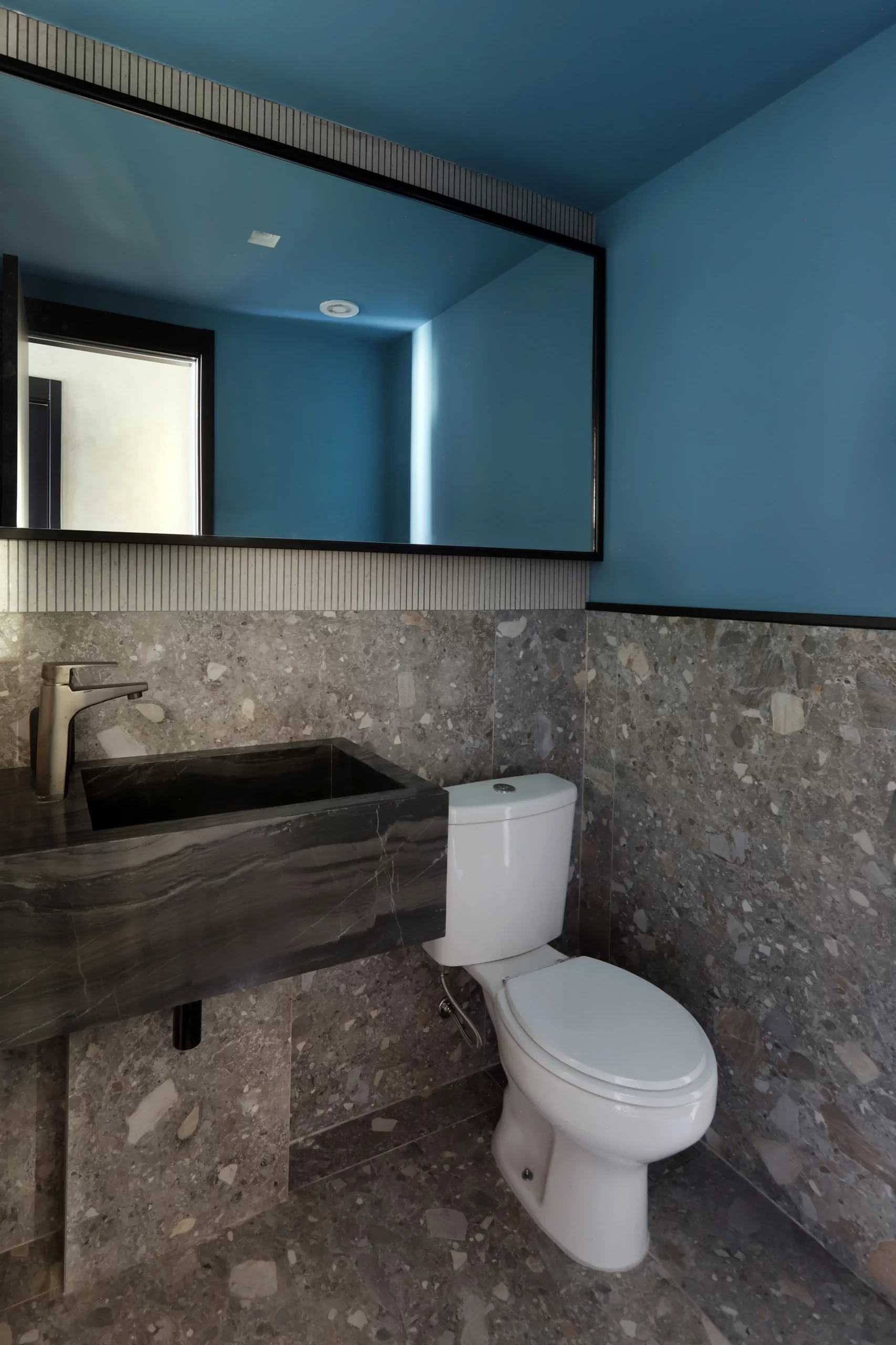 O banheiro da suíte combina bancada em concreto, metais pretos e armários azuis, equilibrando tons frios com textura. No lavabo, o revestimento rústico no piso e meia parede contrasta com a pintura azul no teto e parede superior. A bancada em quartzito esculpido dá acabamento com protagonismo e personalidade.