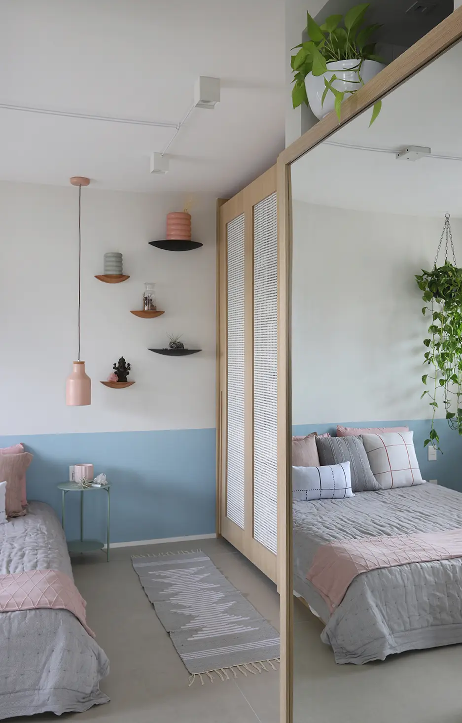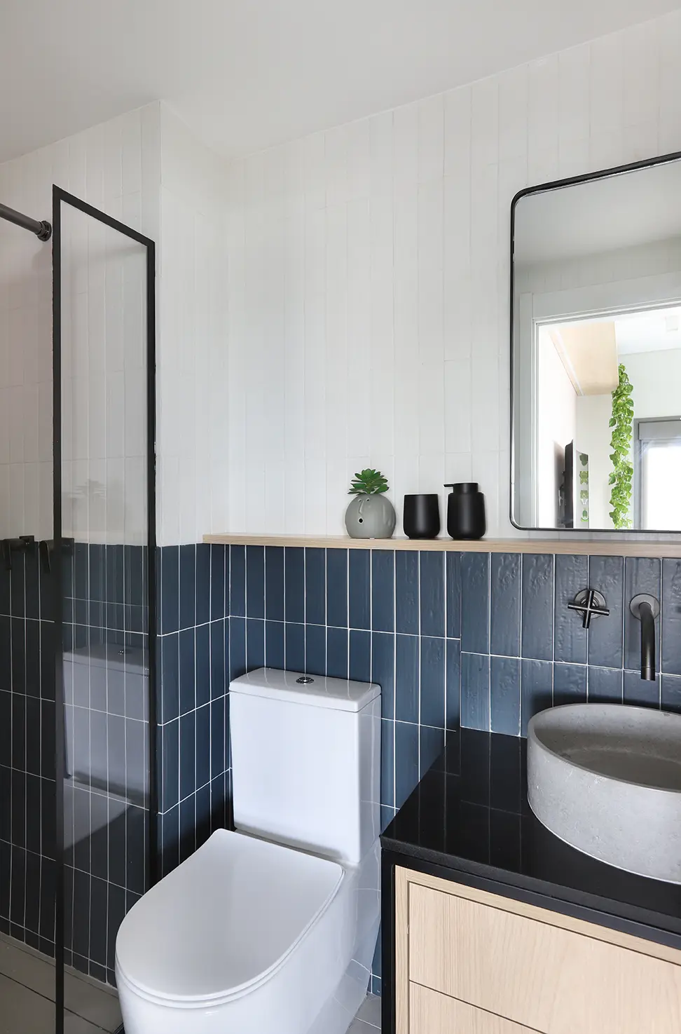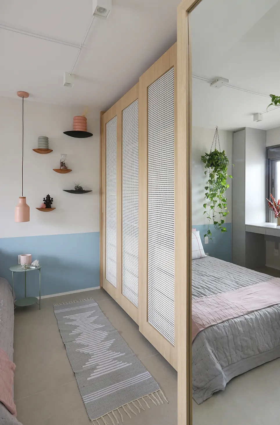 Na área íntima, a suíte principal destaca uma cabeceira feita com ladrilho hidráulico podotátil em azul, unindo textura e originalidade. O armário em L, com portas em vidro reflexivo e maleiros ventilados, aproveita cada centímetro sem comprometer o visual. O banheiro da suíte acompanha a linguagem contemporânea com porcelanato em textura de cimento queimado, bancada em MDF carvalho e cuba de concreto.
