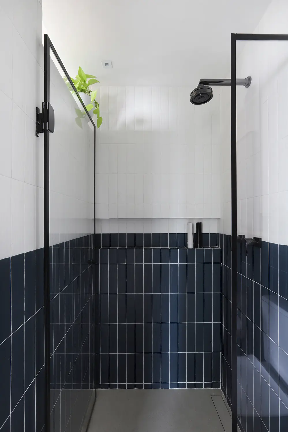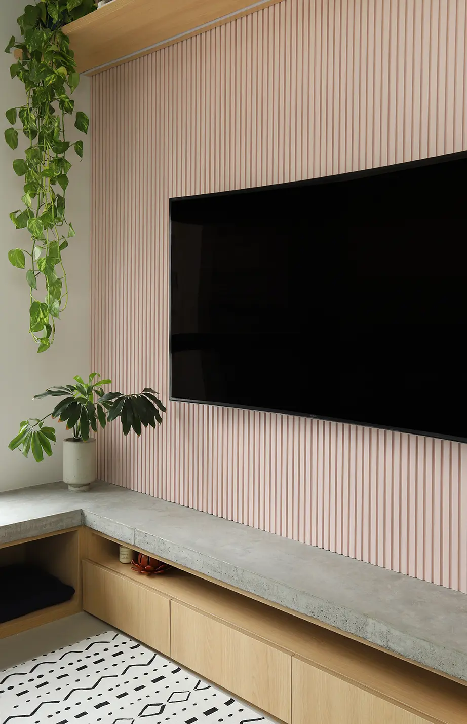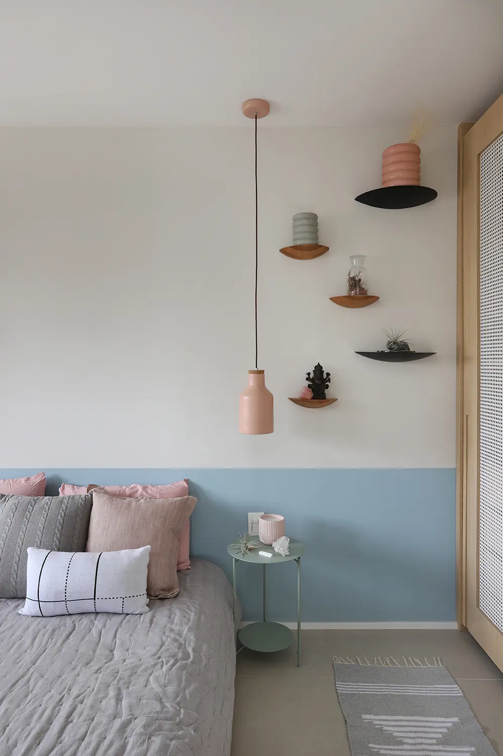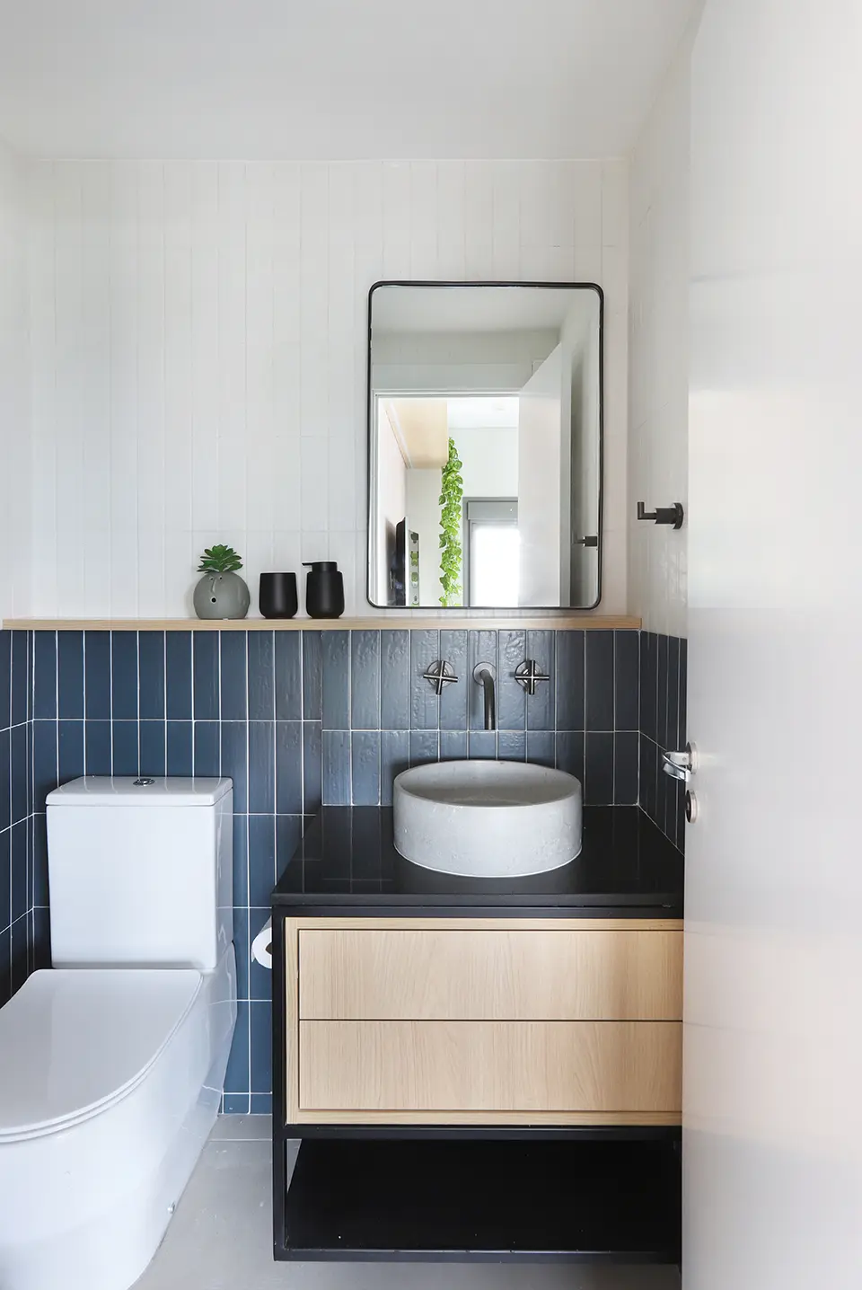 Na área íntima, a suíte principal destaca uma cabeceira feita com ladrilho hidráulico podotátil em azul, unindo textura e originalidade. O armário em L, com portas em vidro reflexivo e maleiros ventilados, aproveita cada centímetro sem comprometer o visual. O banheiro da suíte acompanha a linguagem contemporânea com porcelanato em textura de cimento queimado, bancada em MDF carvalho e cuba de concreto.