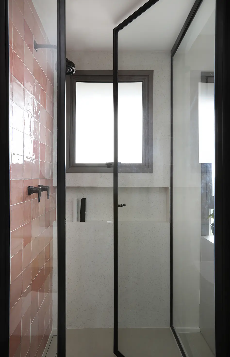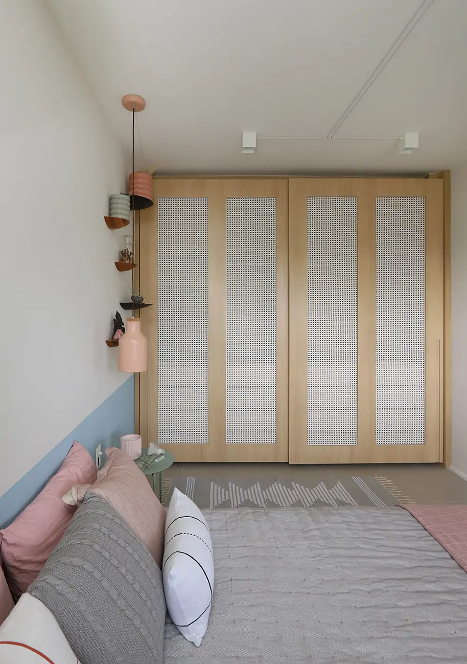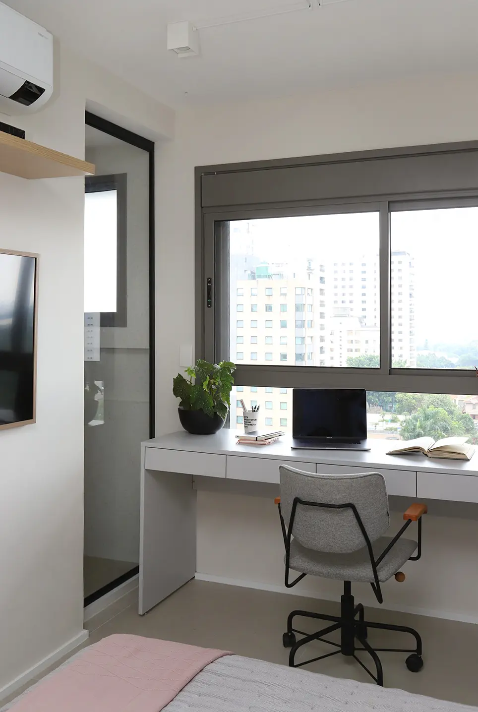A planta foi reorganizada para abrigar dois dormitórios. Um deles é a suíte principal e o outro, é o quarto de hóspedes, que ganhou uma cama de casal retrátil e também funciona como home office/ateliê de costura. O home office foi planejado para ser versátil e bem iluminado, separado por uma porta camarão em vidro jateado com estrutura em marcenaria, solução que traz leveza, permite a entrada de luz natural e garante privacidade quando necessário.