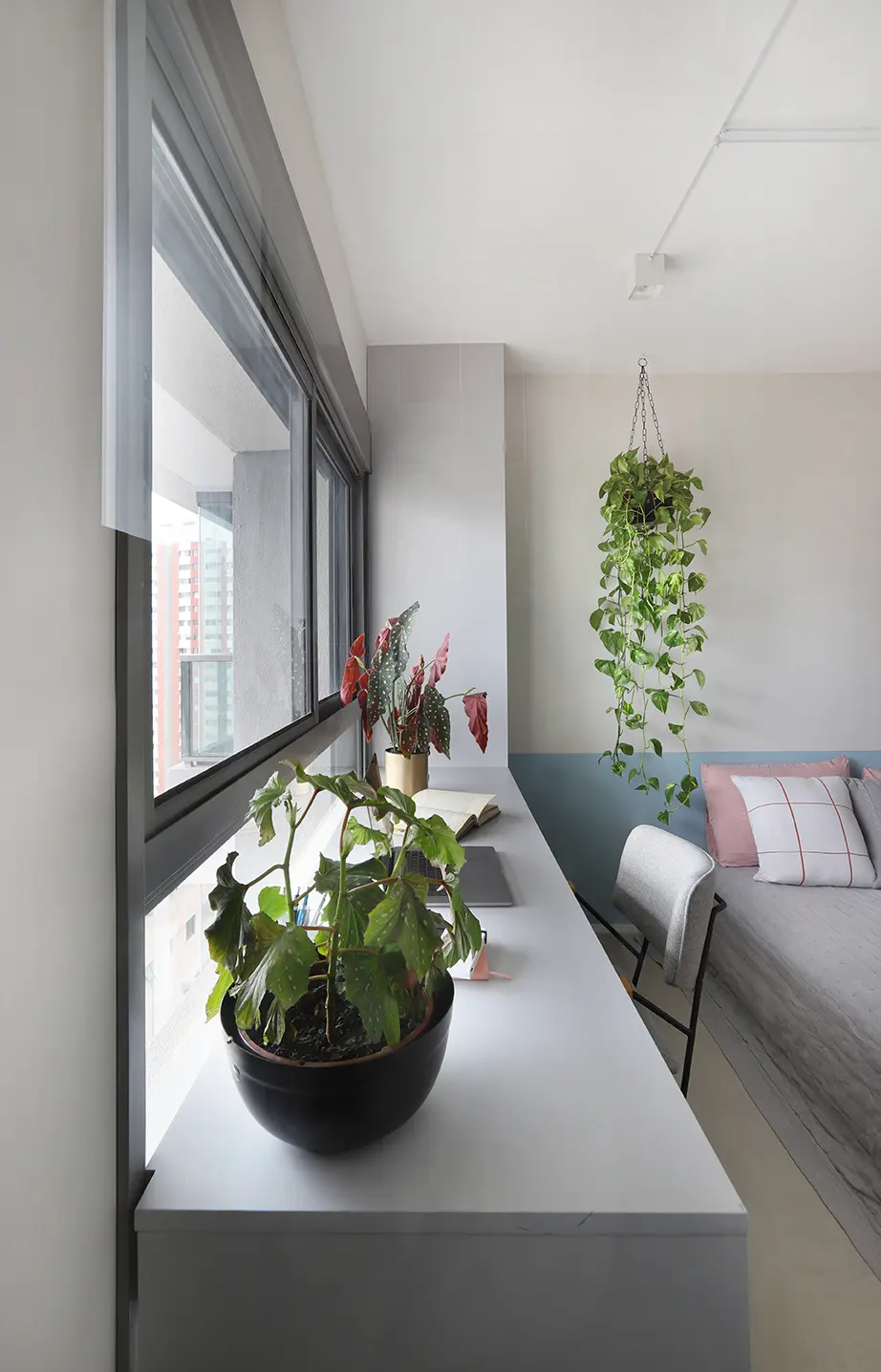 No home office, criado na varanda com acesso pela suíte, uma divisória em chapa perfurada garante leveza e ventilação. A bancada desenhada em tom carvalho e serralheria preta, junto de prateleiras e vegetação, transforma o espaço em um refúgio funcional.