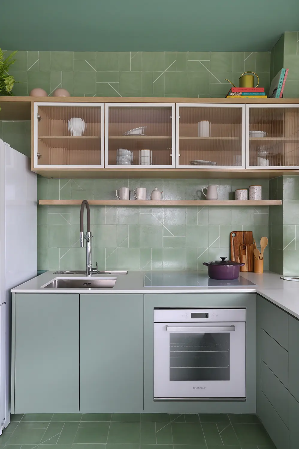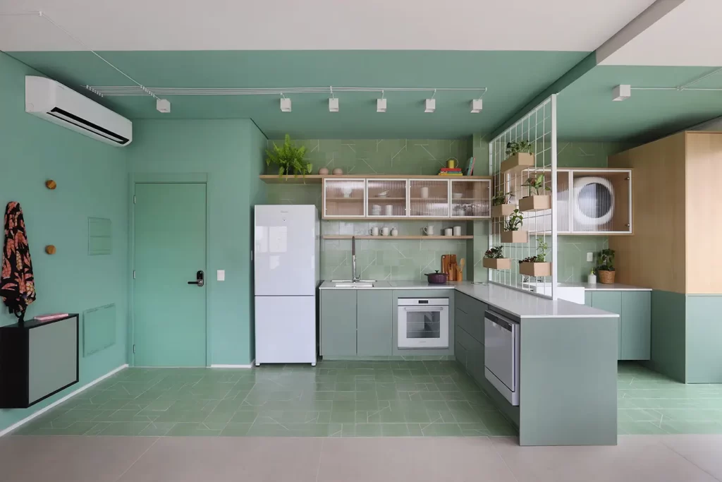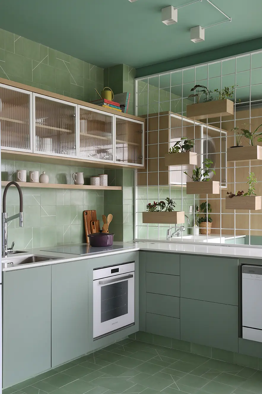 Elementos como cristaleira em serralheria com vidro canelado, prateleiras com LED embutido e armários com dupla função aparecem como soluções práticas para o dia a dia.