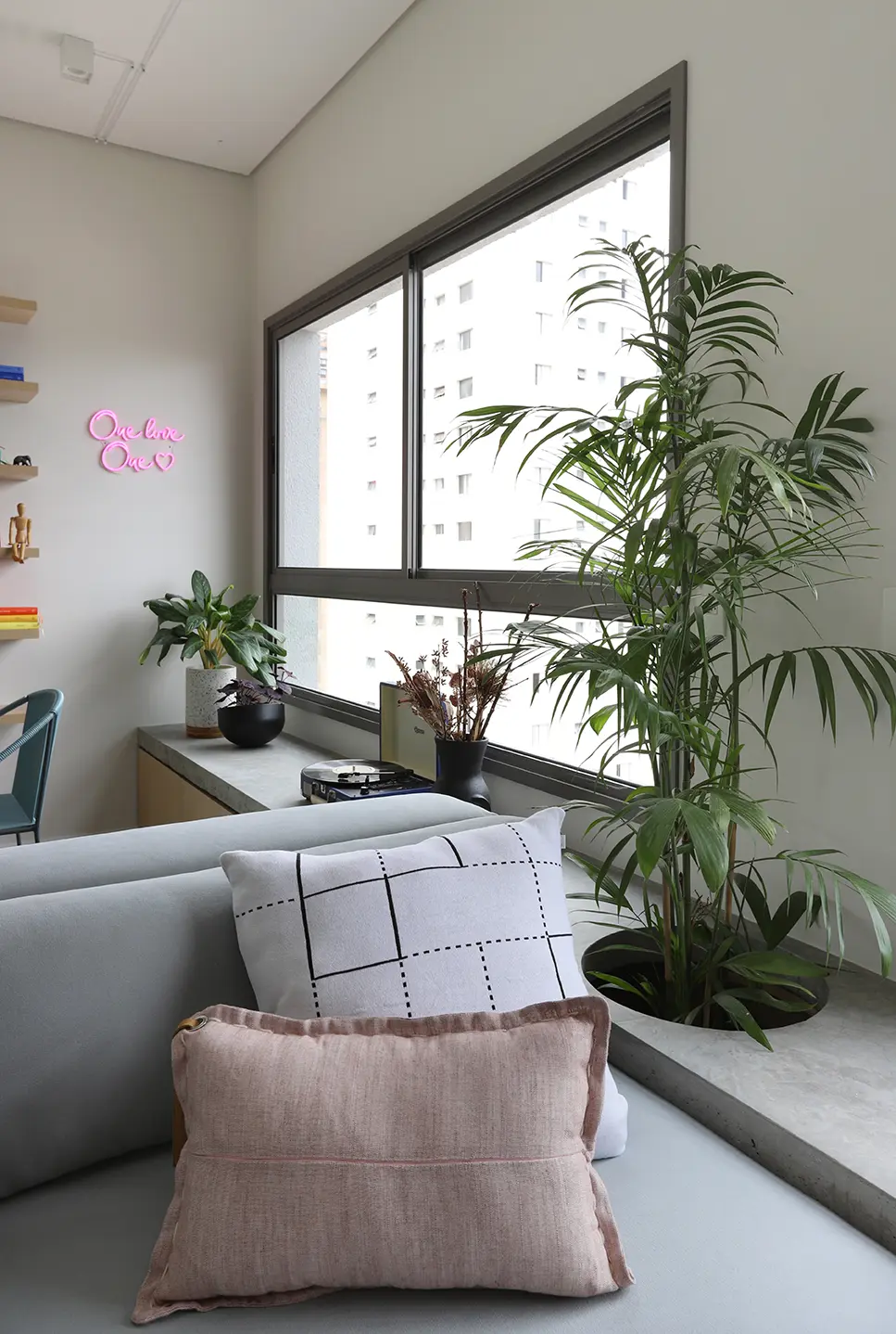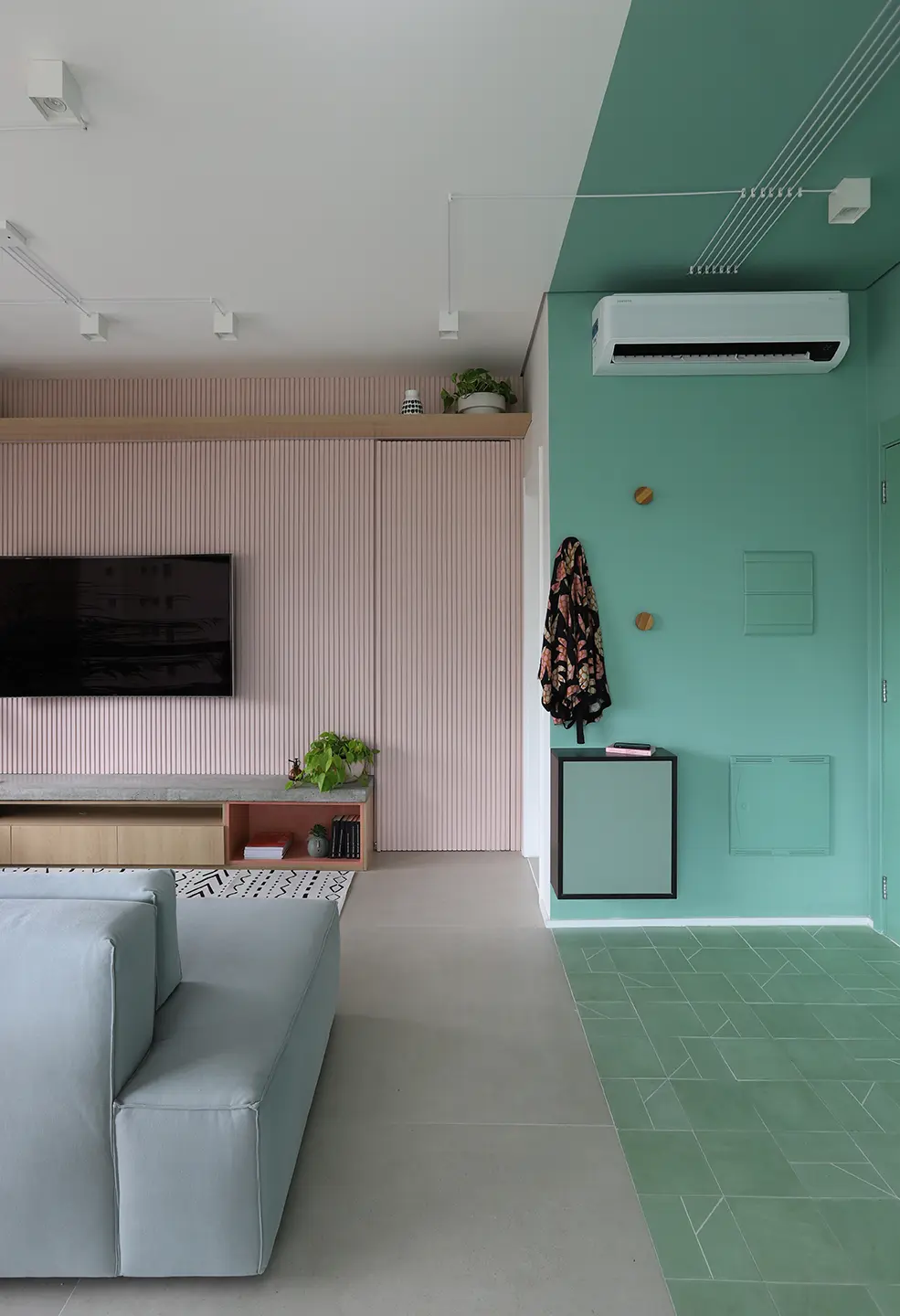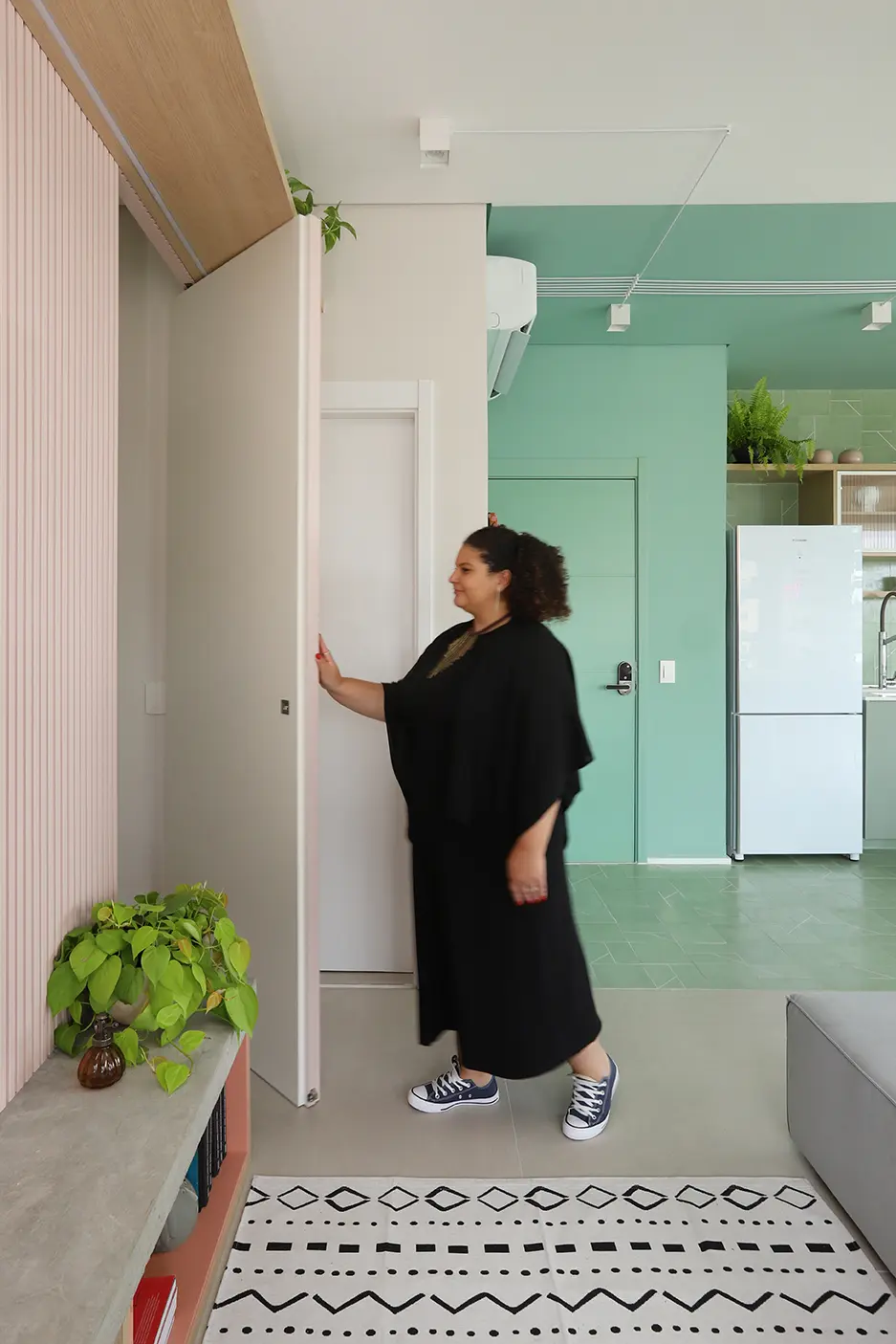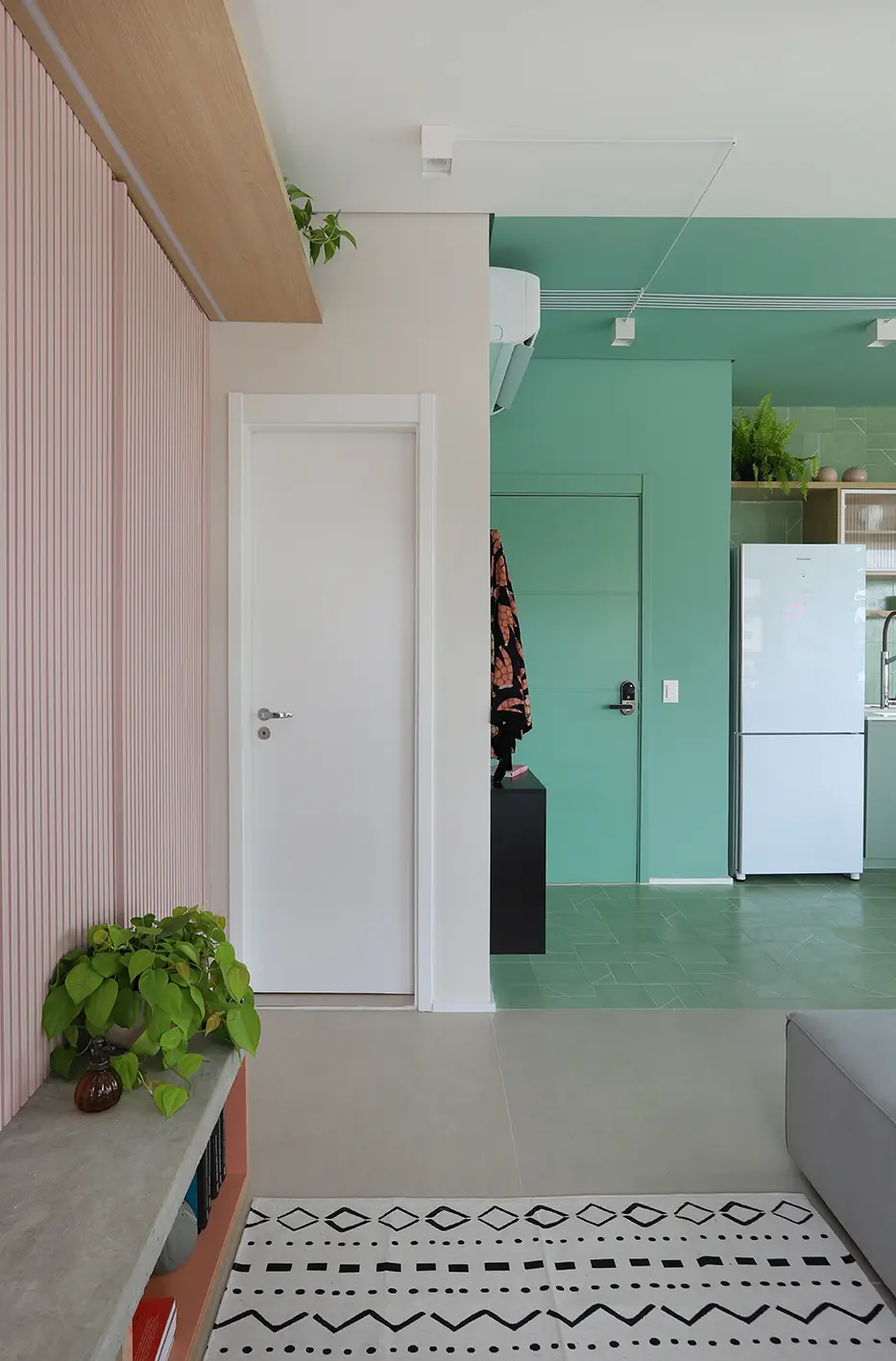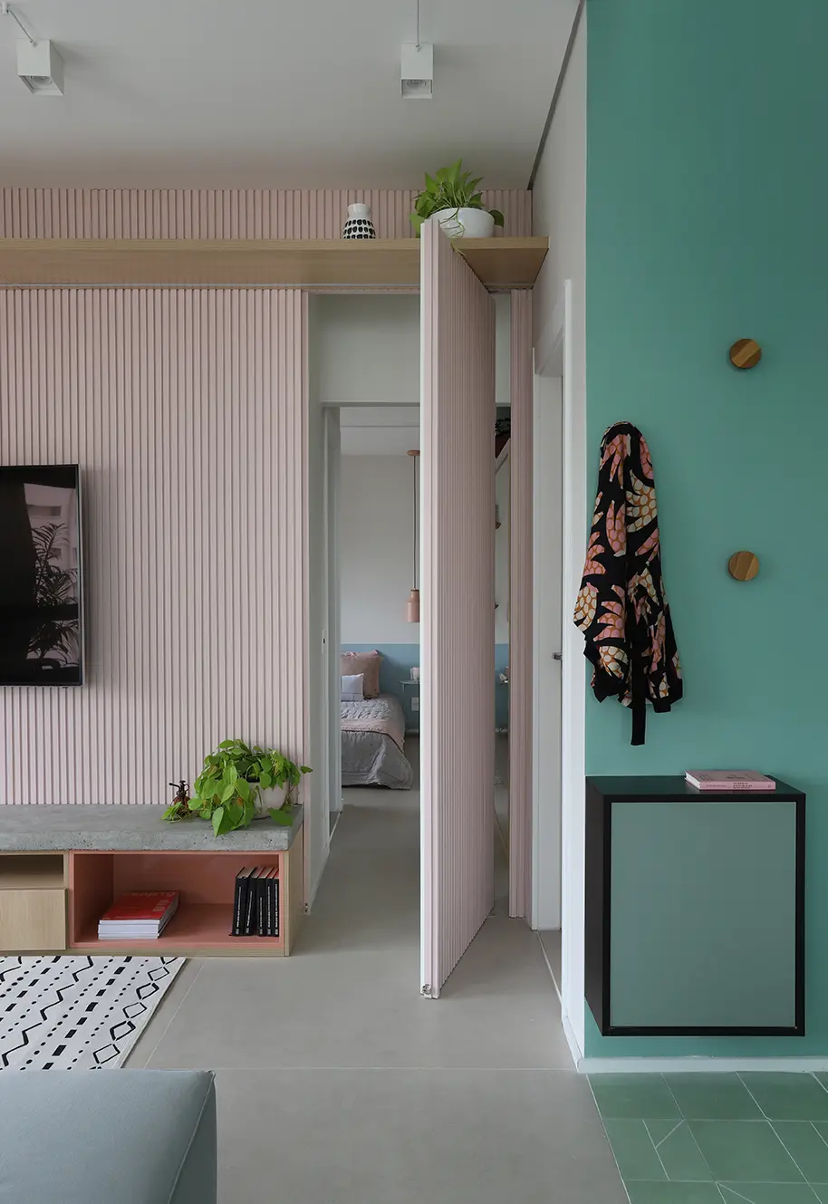 O Apê Camô é resultado de uma reforma completa que transformou inteiramente a planta original para atender às necessidades da moradora, que valoriza equilíbrio, organização e bem-estar. O departamento de 74m² fica localizado no bairro de Pinheiros. O projeto partiu da ideia de criar um espaço fluido, funcional e leve, capaz de acompanhar uma rotina dinâmica sem abrir mão do conforto e da estética.