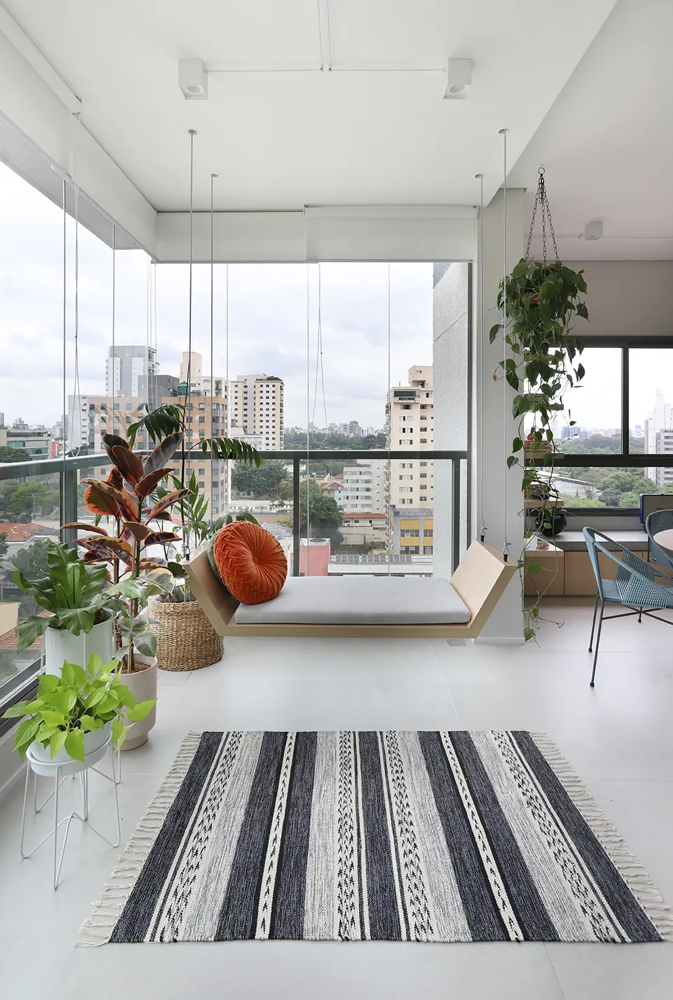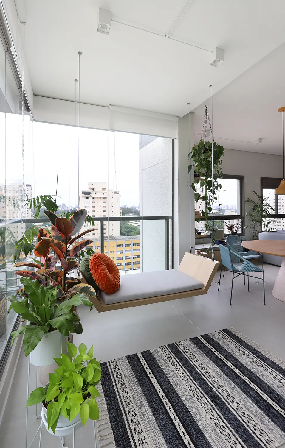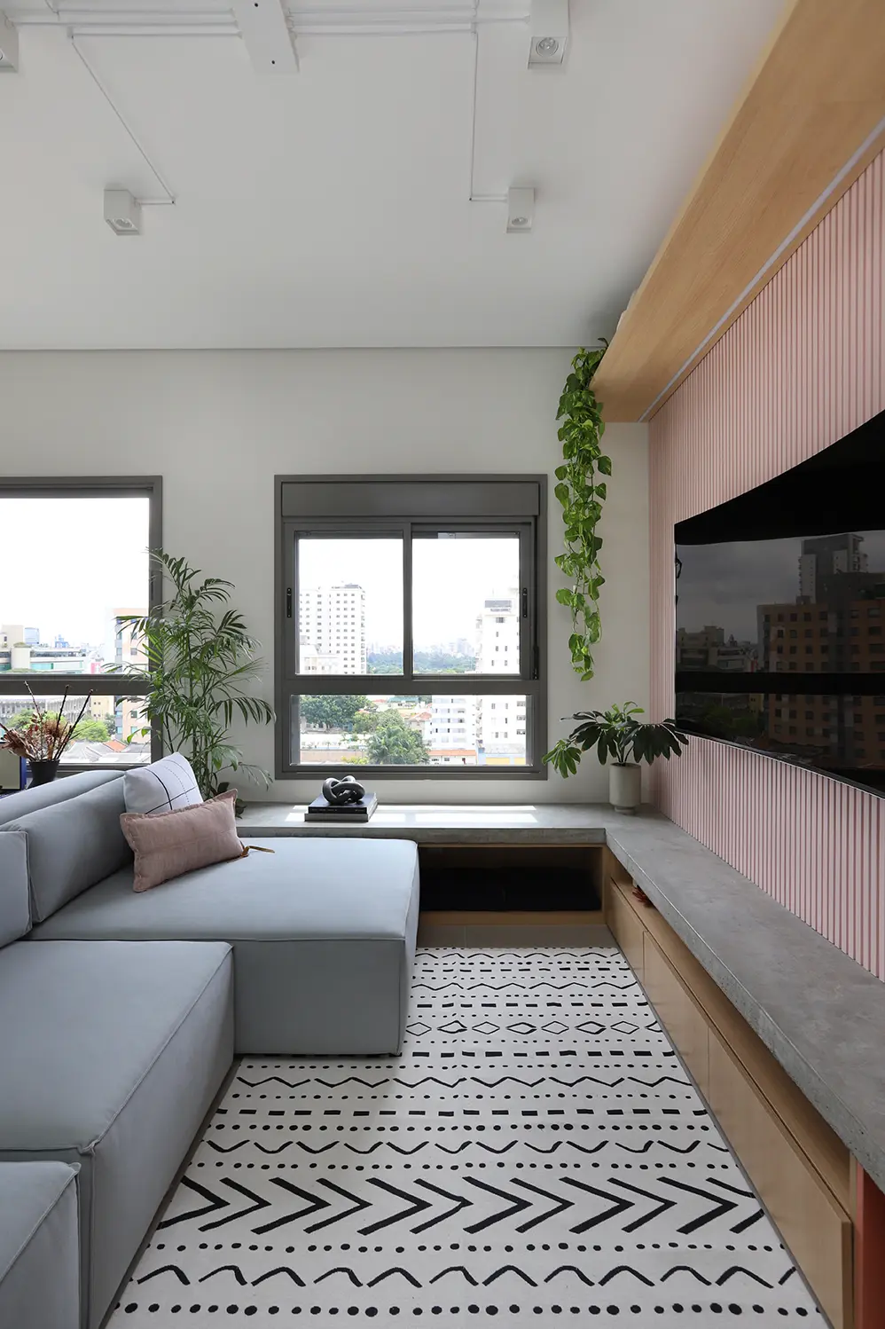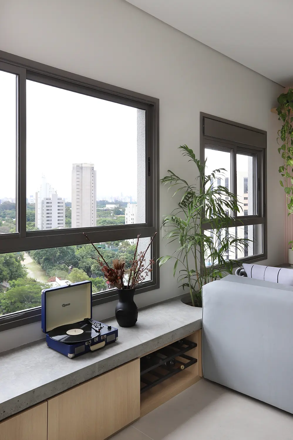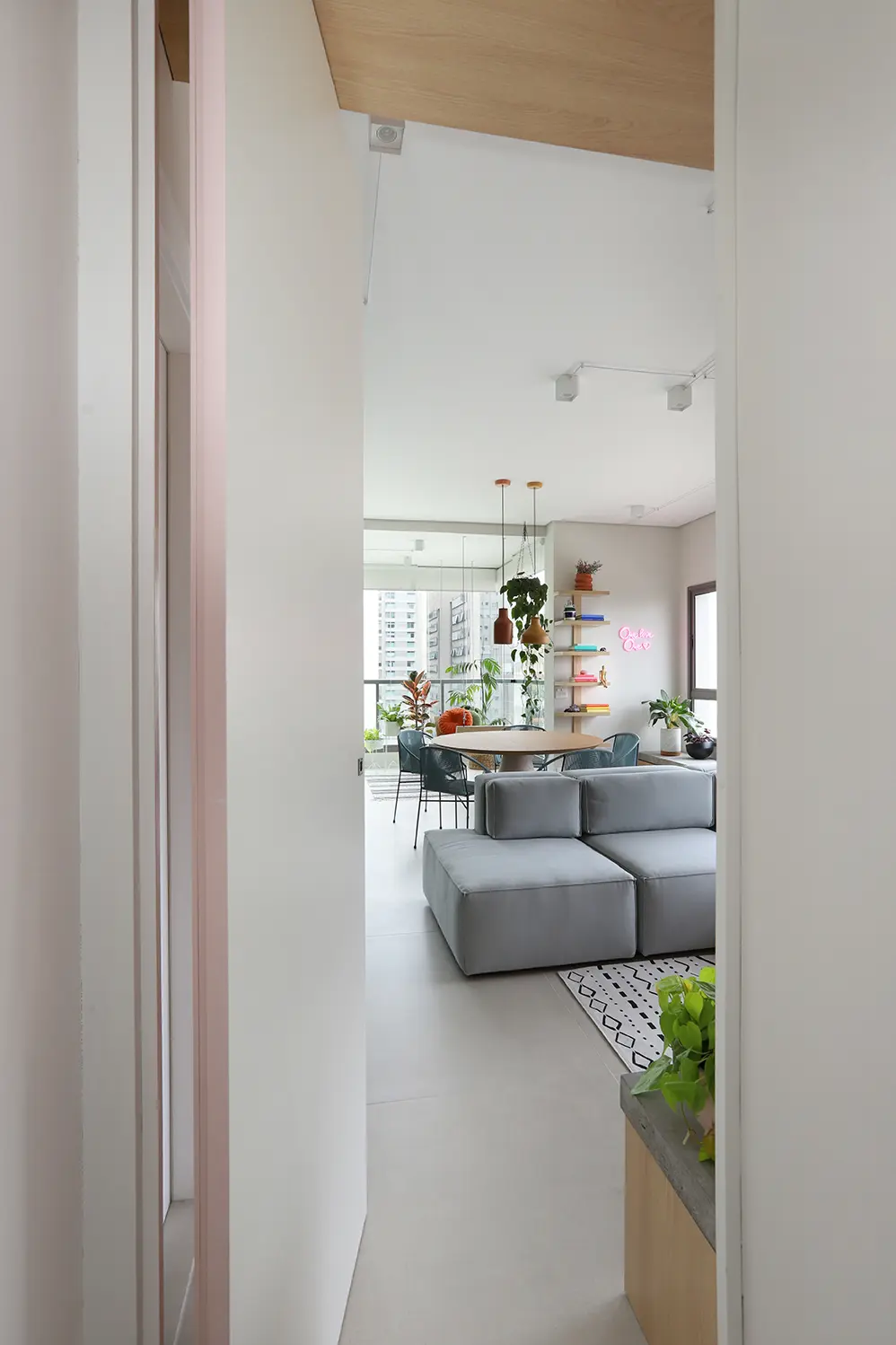A principal intervenção estrutural foi a remoção do requadro e da esquadria da porta entre sala e varanda, integrando os ambientes e ampliando a sensação de espaço.