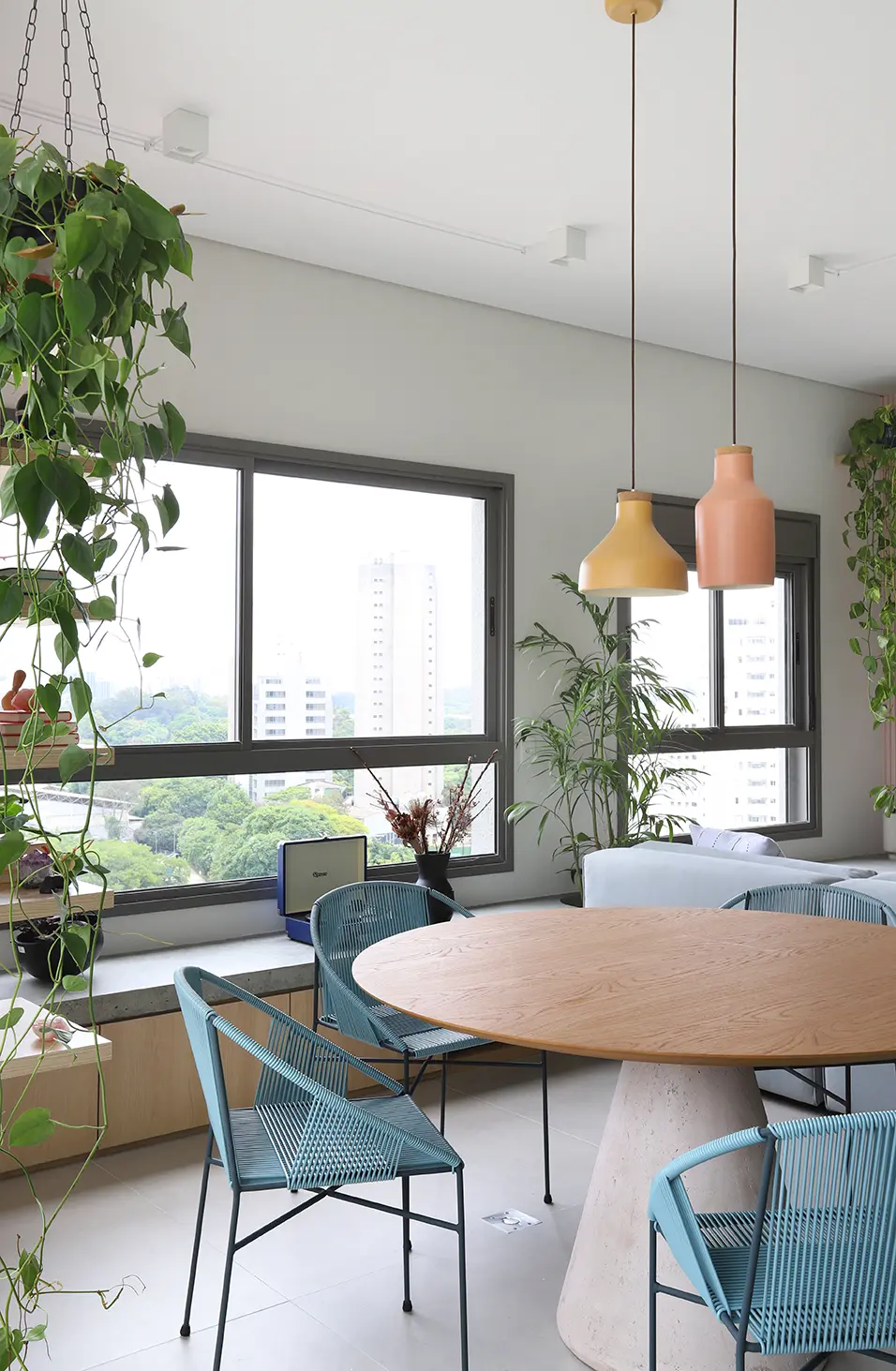 A área social, marcada por um sofá modular em azul cobalto, piso vinílico e paleta de tons frios com toques pontuais de preto e madeira, revela um layout versátil e cheio de aconchego. A mesa de jantar encostada na parede otimiza a circulação, enquanto o banco e as cadeiras em couro adicionam textura e personalidade.