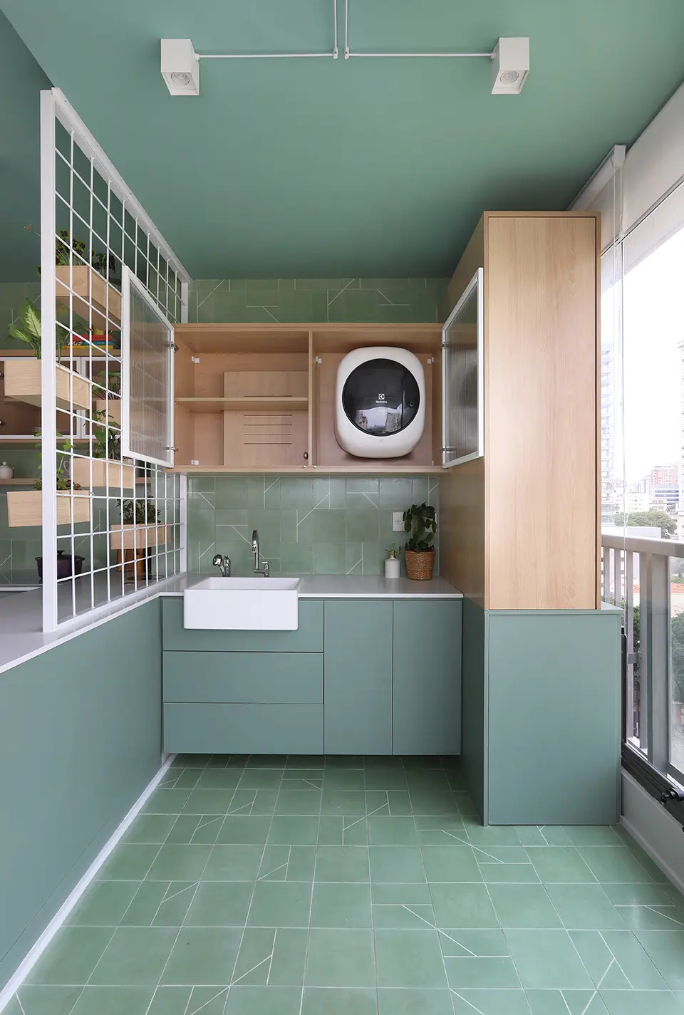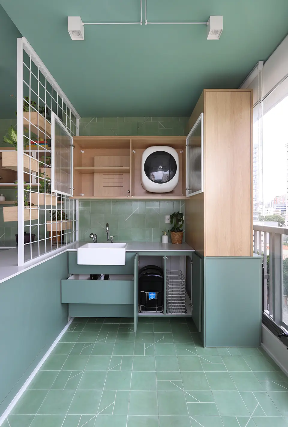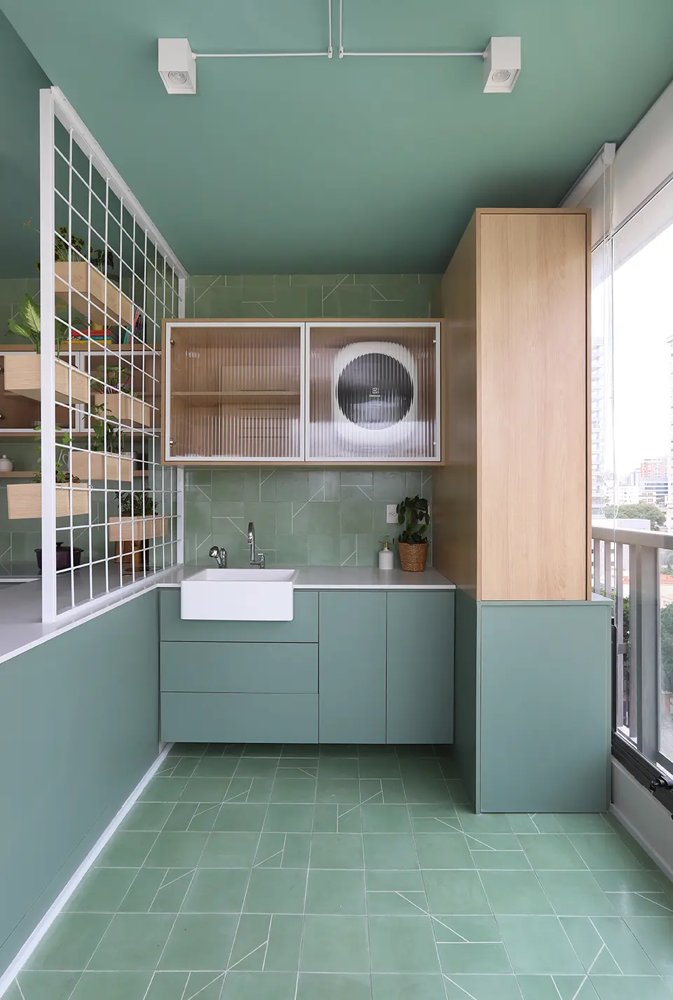 A cozinha se estende visualmente até a lavanderia, com bancada e armários no mesmo acabamento, reforçando a fluidez entre os ambientes.
