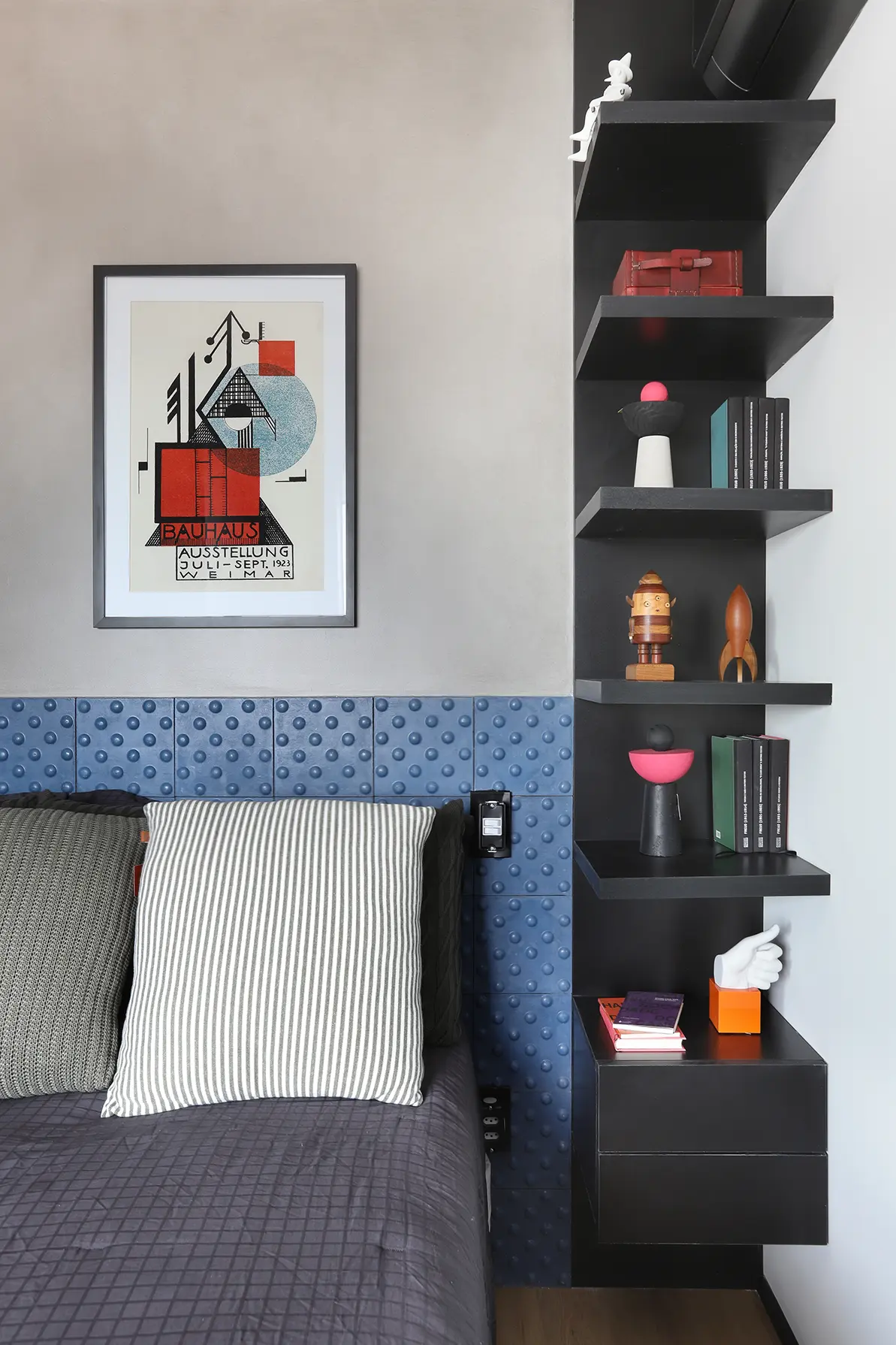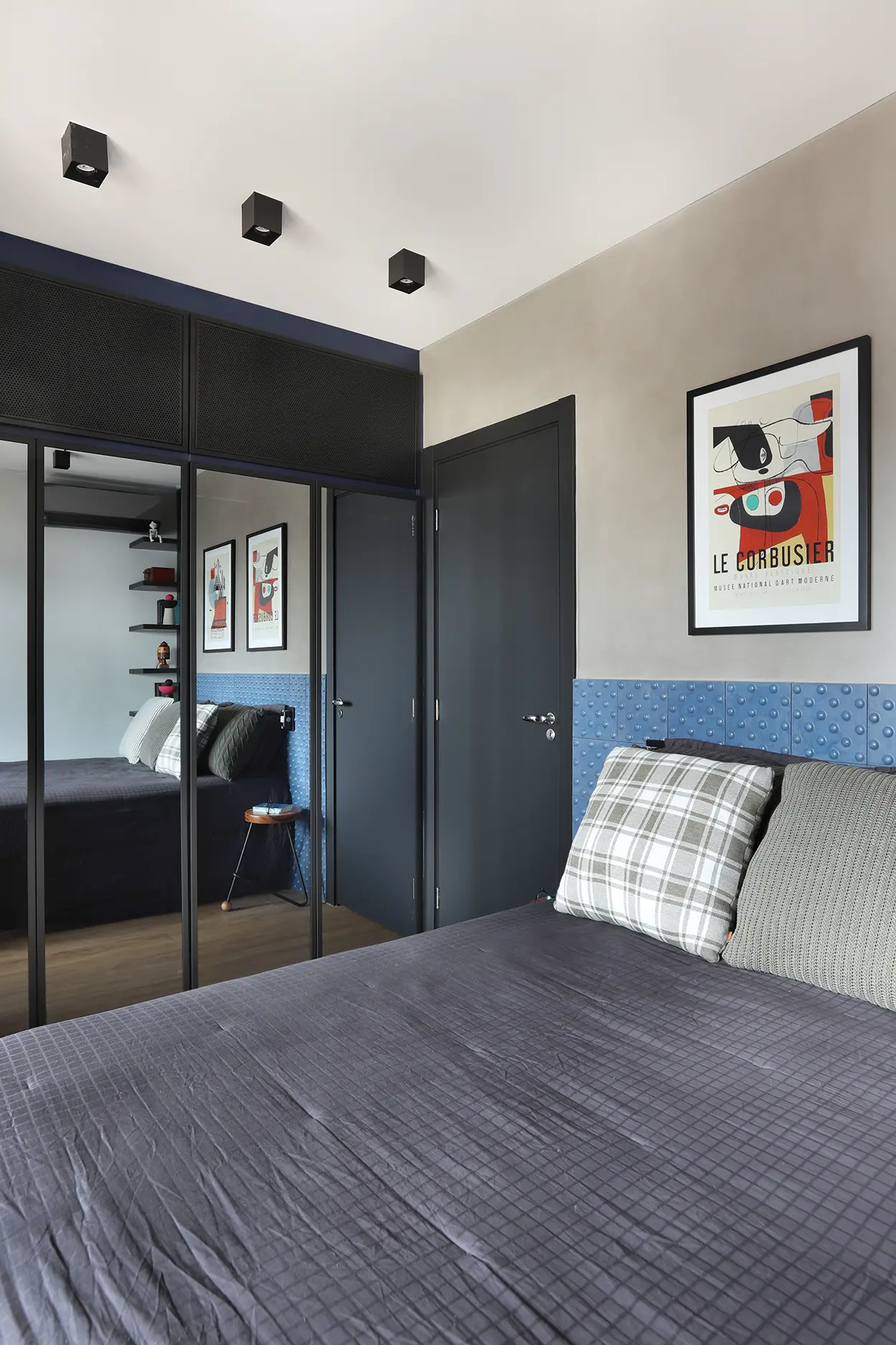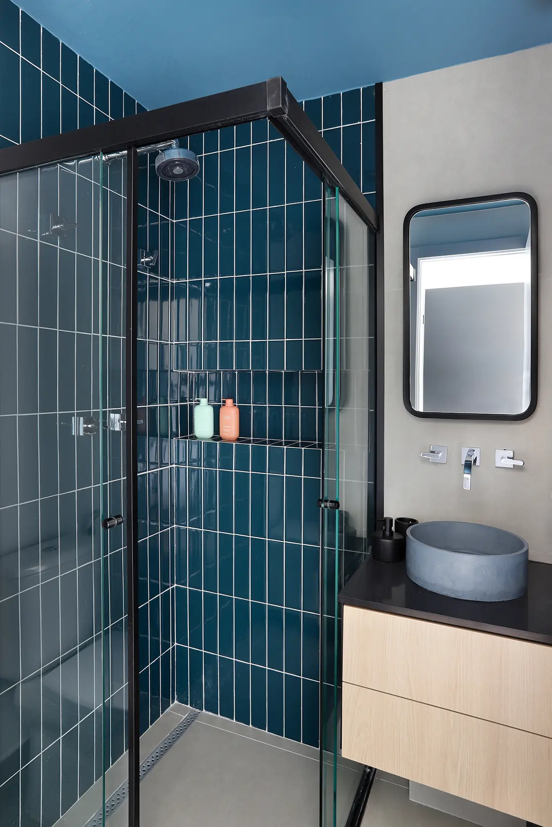 Na área íntima, a suíte principal destaca uma cabeceira feita com ladrilho hidráulico podotátil em azul, unindo textura e originalidade. O armário em L, com portas em vidro reflexivo e maleiros ventilados, aproveita cada centímetro sem comprometer o visual. O banheiro da suíte acompanha a linguagem contemporânea com porcelanato em textura de cimento queimado, bancada em MDF carvalho e cuba de concreto.