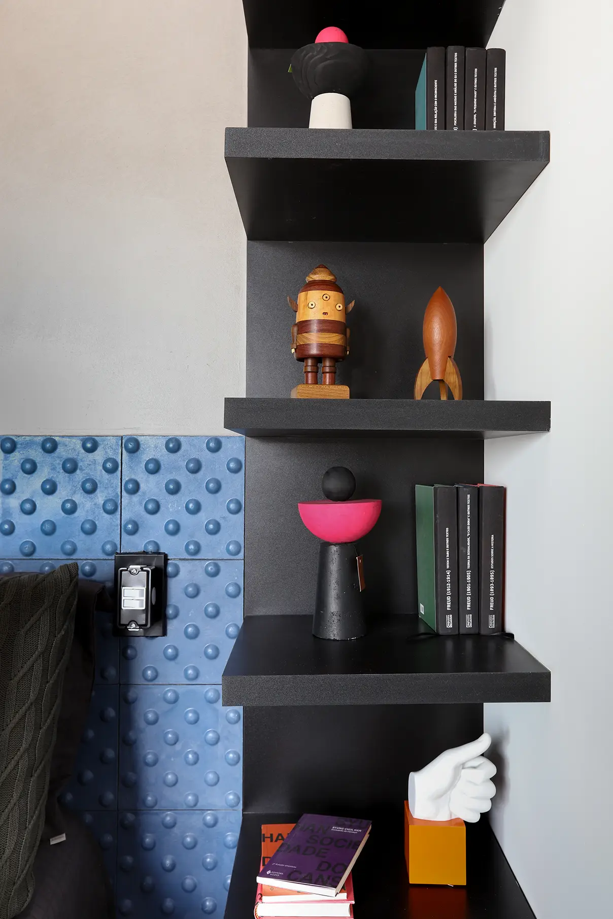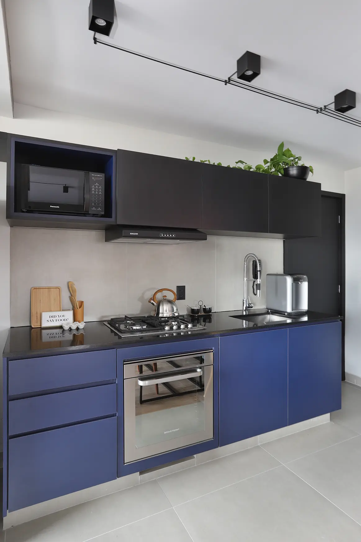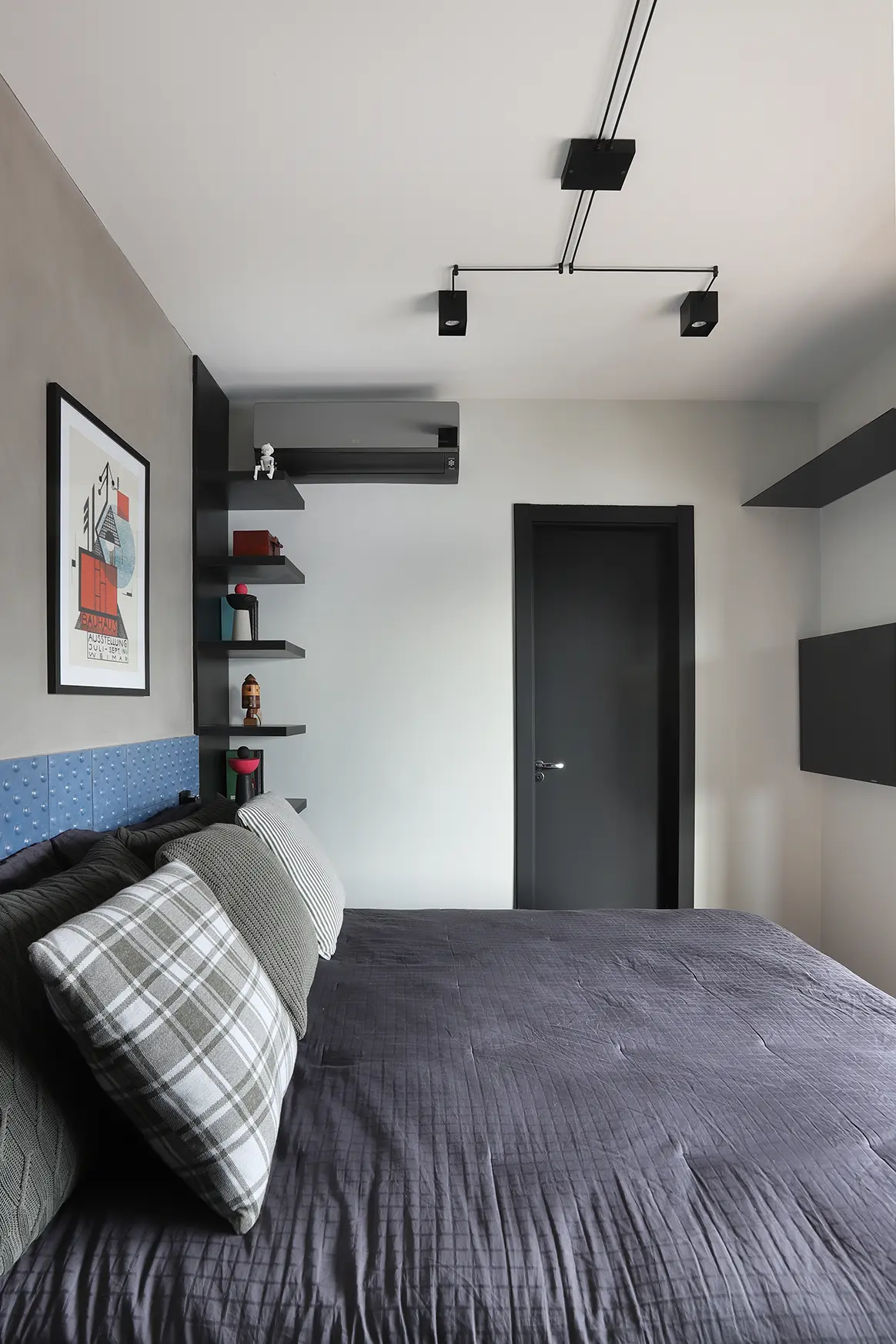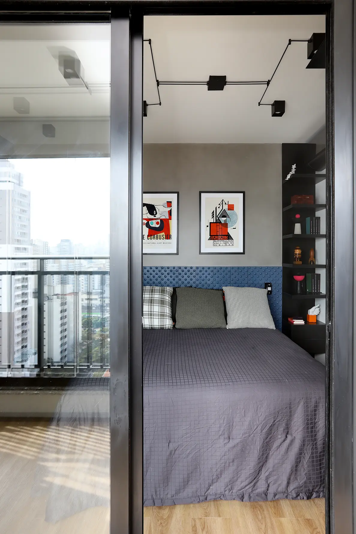 Na área íntima, a suíte principal destaca uma cabeceira feita com ladrilho hidráulico podotátil em azul, unindo textura e originalidade. O armário em L, com portas em vidro reflexivo e maleiros ventilados, aproveita cada centímetro sem comprometer o visual. O banheiro da suíte acompanha a linguagem contemporânea com porcelanato em textura de cimento queimado, bancada em MDF carvalho e cuba de concreto.