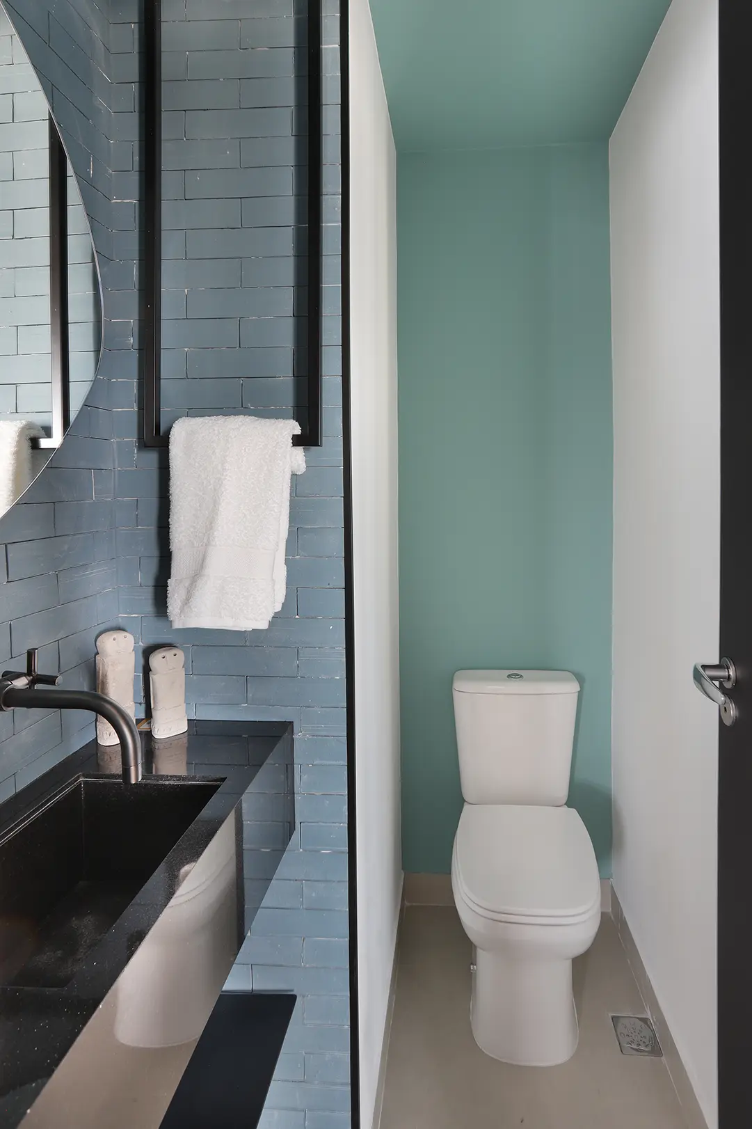 O segundo quarto foi adaptado como quarto de hóspedes com bicama e marcenaria sob medida. O banheiro social e o lavabo mantêm o contraste de materiais e o uso de revestimentos com cores fortes e marcantes, reforçando a personalidade jovem e despretensiosa do projeto.