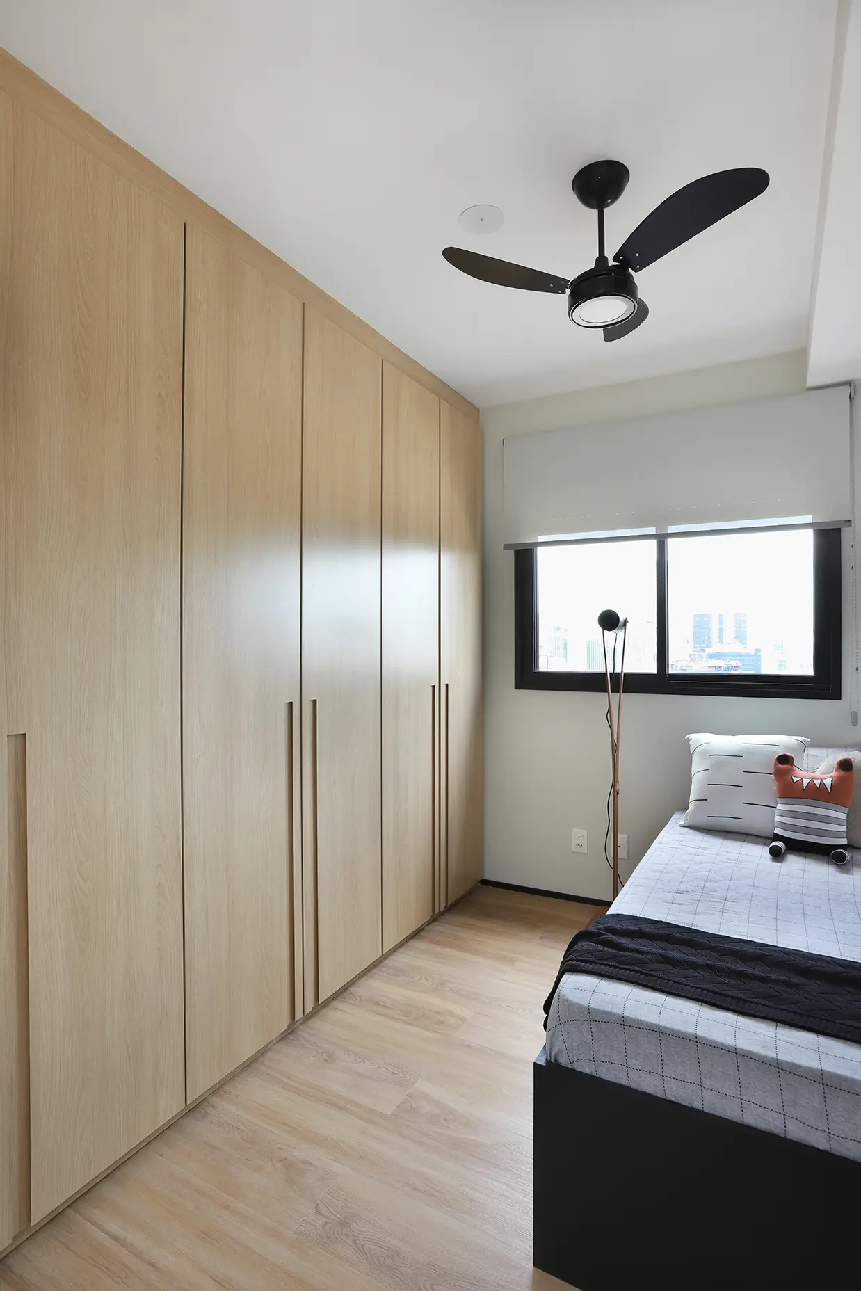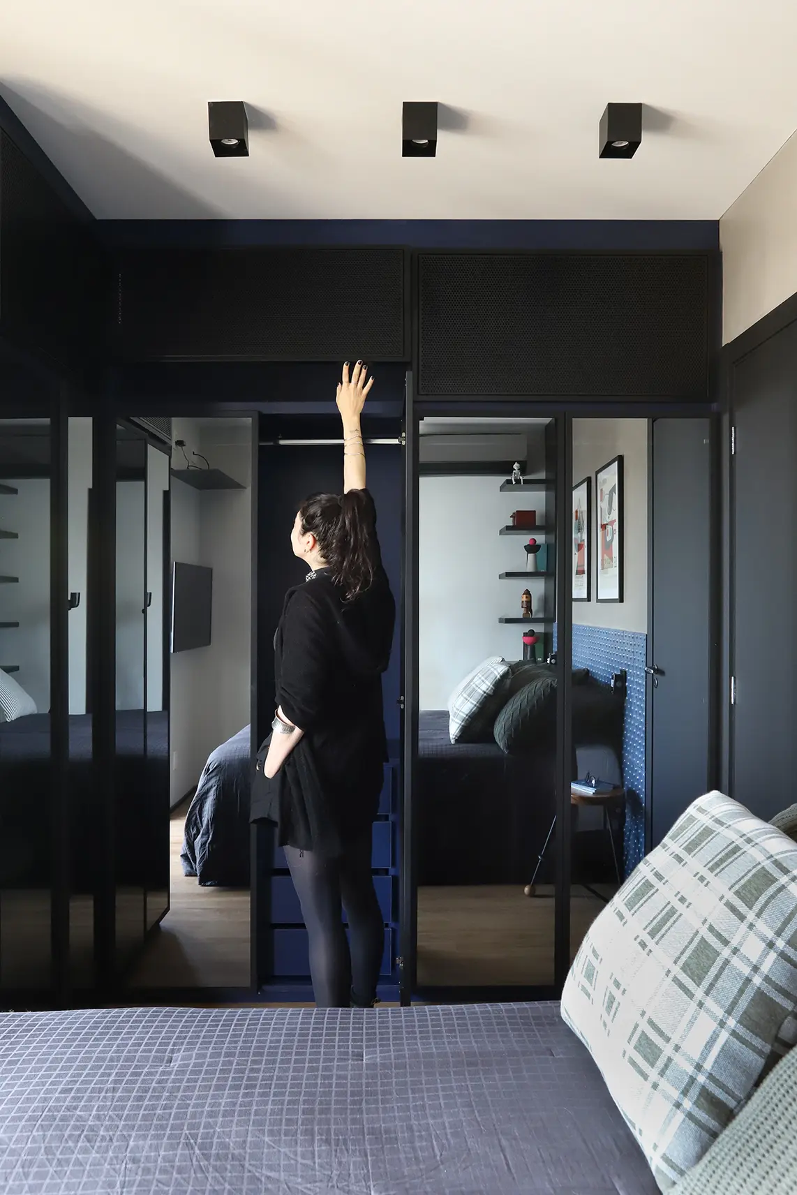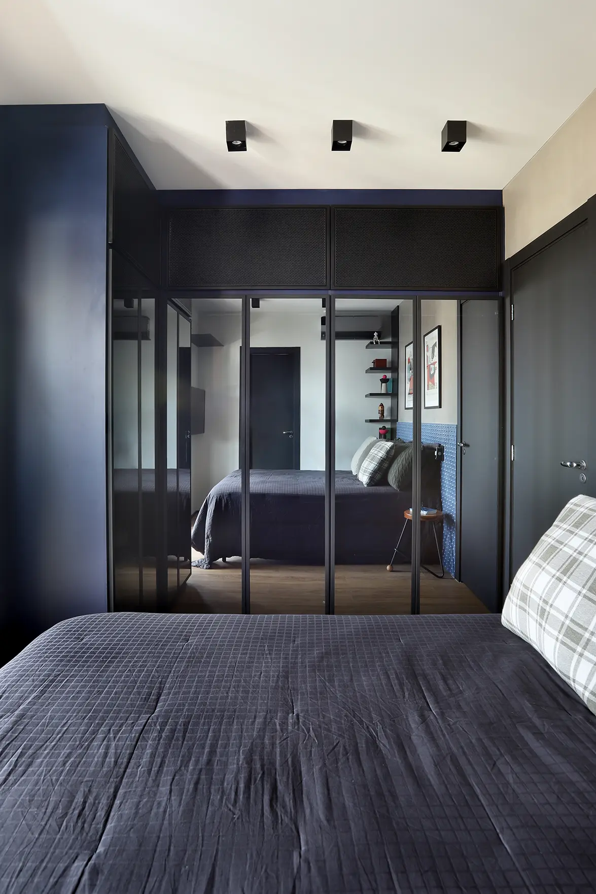 A planta foi reorganizada para abrigar dois dormitórios. Um deles é a suíte principal e o outro, é o quarto de hóspedes, que ganhou uma cama de casal retrátil e também funciona como home office/ateliê de costura. O home office foi planejado para ser versátil e bem iluminado, separado por uma porta camarão em vidro jateado com estrutura em marcenaria, solução que traz leveza, permite a entrada de luz natural e garante privacidade quando necessário.