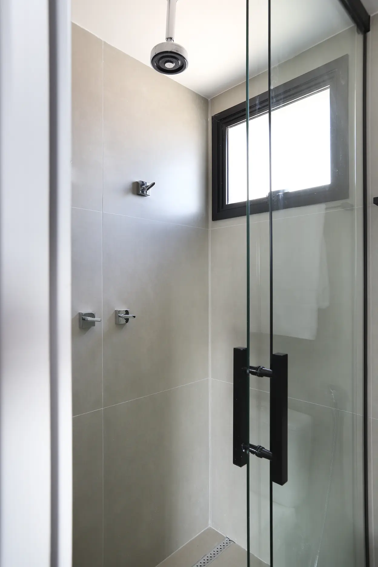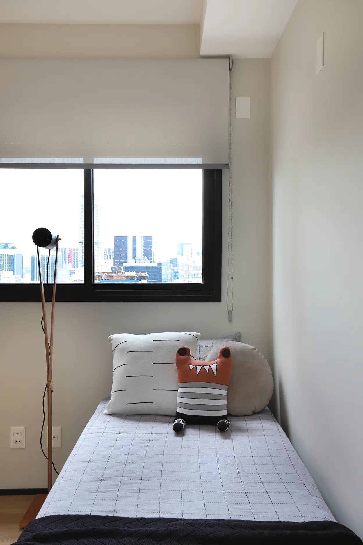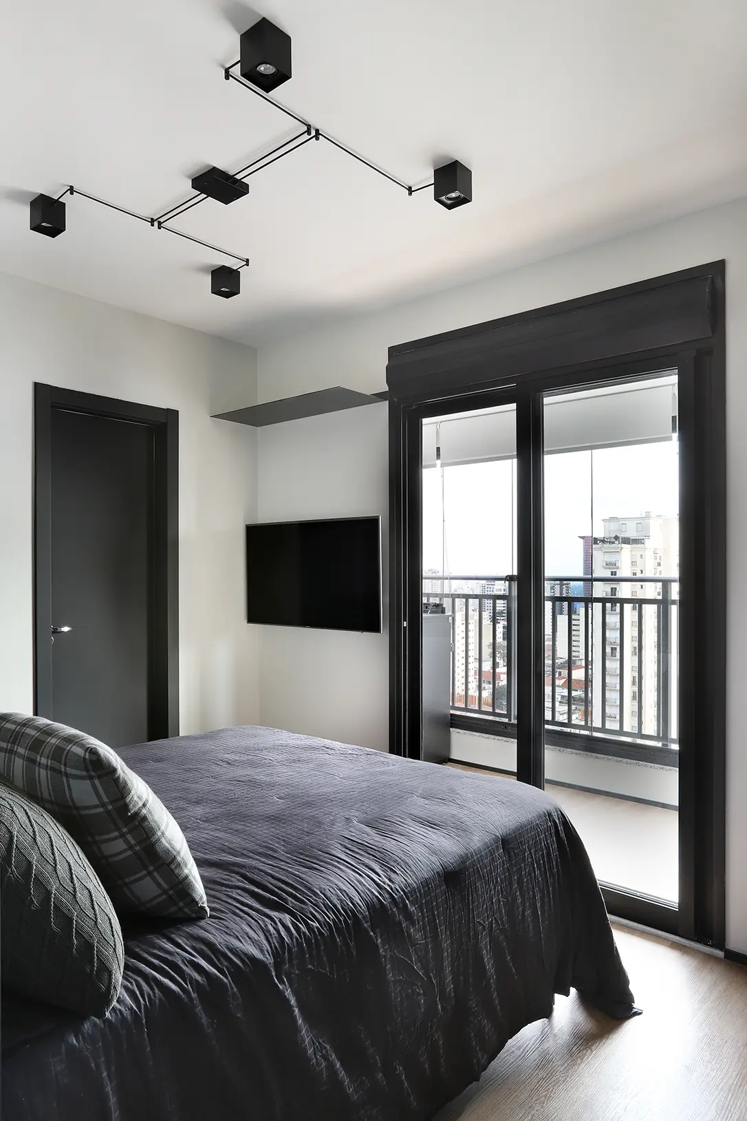 A planta foi reorganizada para abrigar dois dormitórios. Um deles é a suíte principal e o outro, é o quarto de hóspedes, que ganhou uma cama de casal retrátil e também funciona como home office/ateliê de costura. O home office foi planejado para ser versátil e bem iluminado, separado por uma porta camarão em vidro jateado com estrutura em marcenaria, solução que traz leveza, permite a entrada de luz natural e garante privacidade quando necessário.