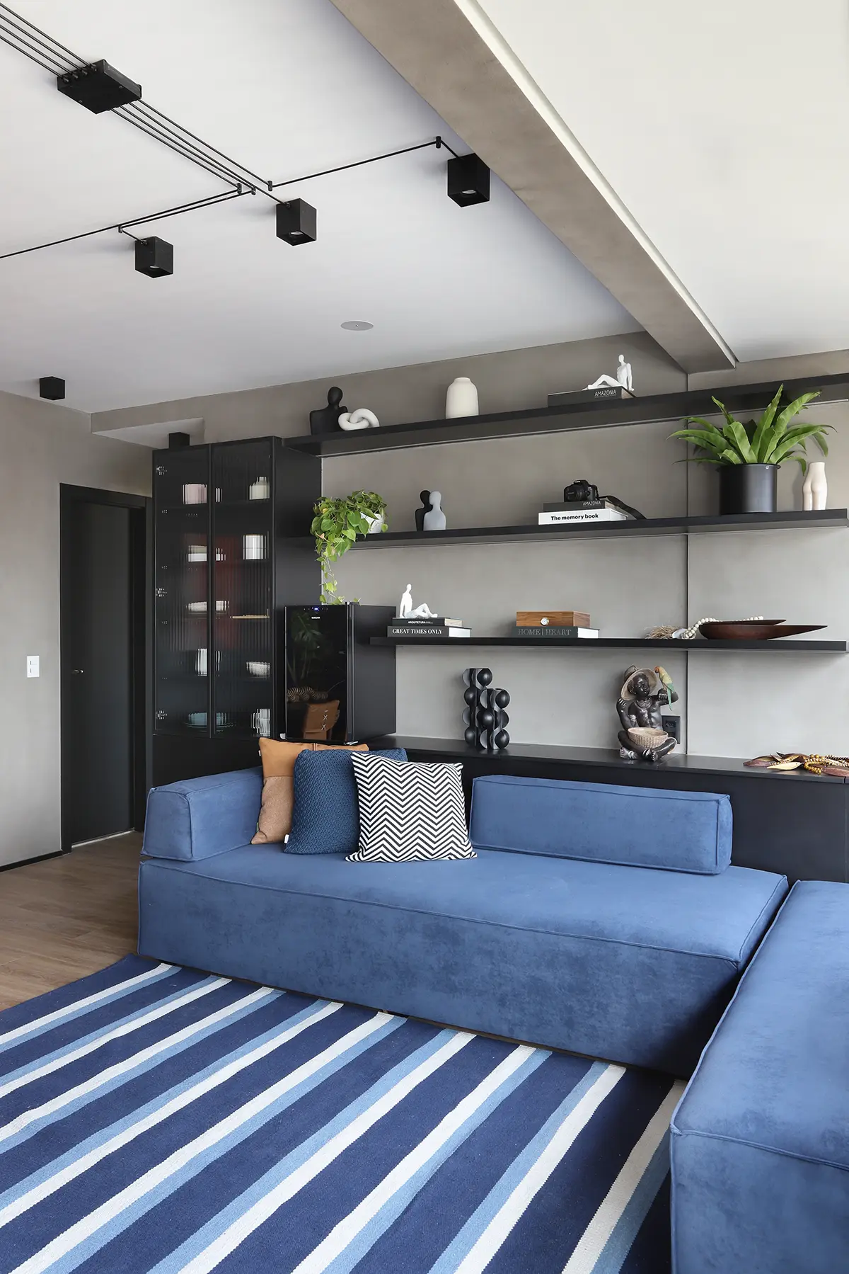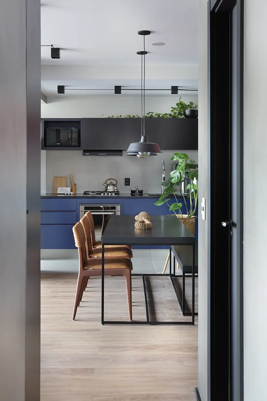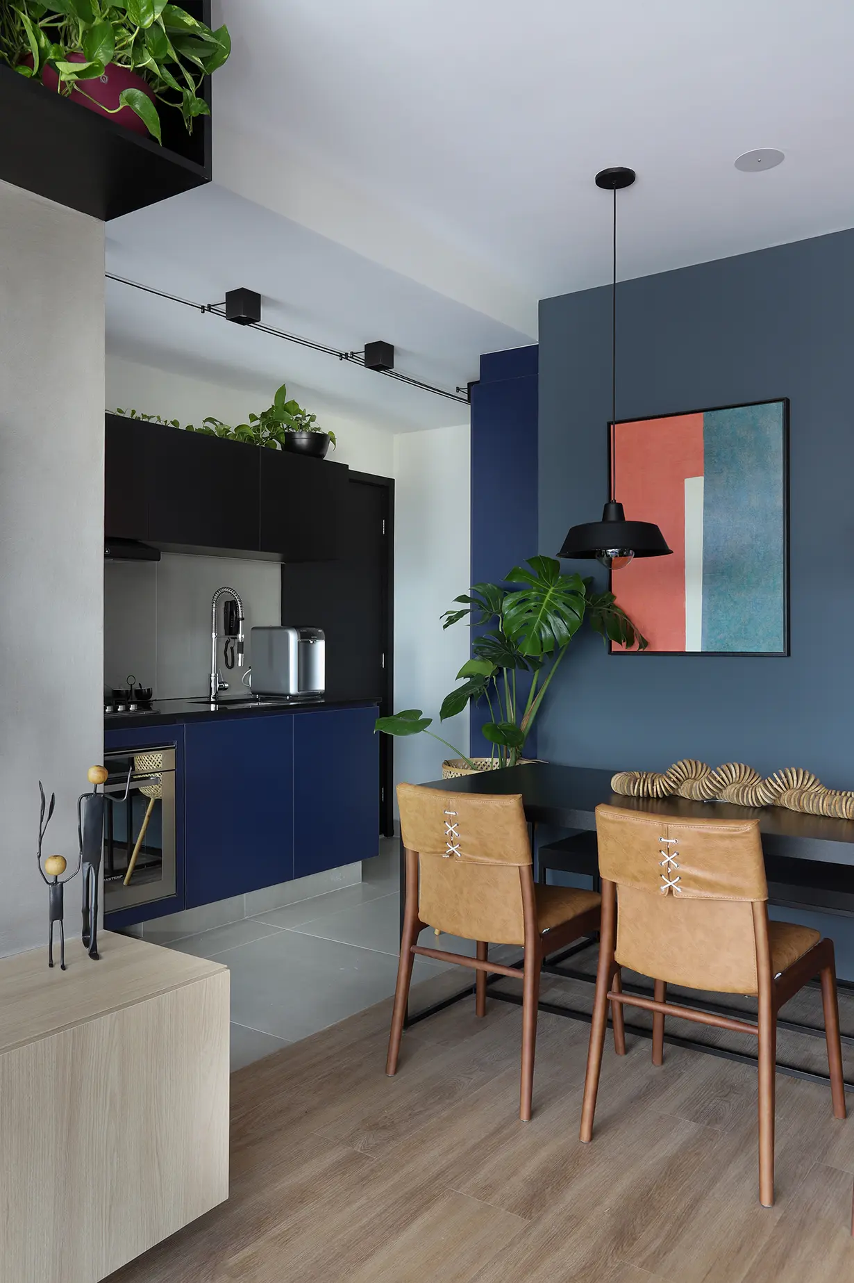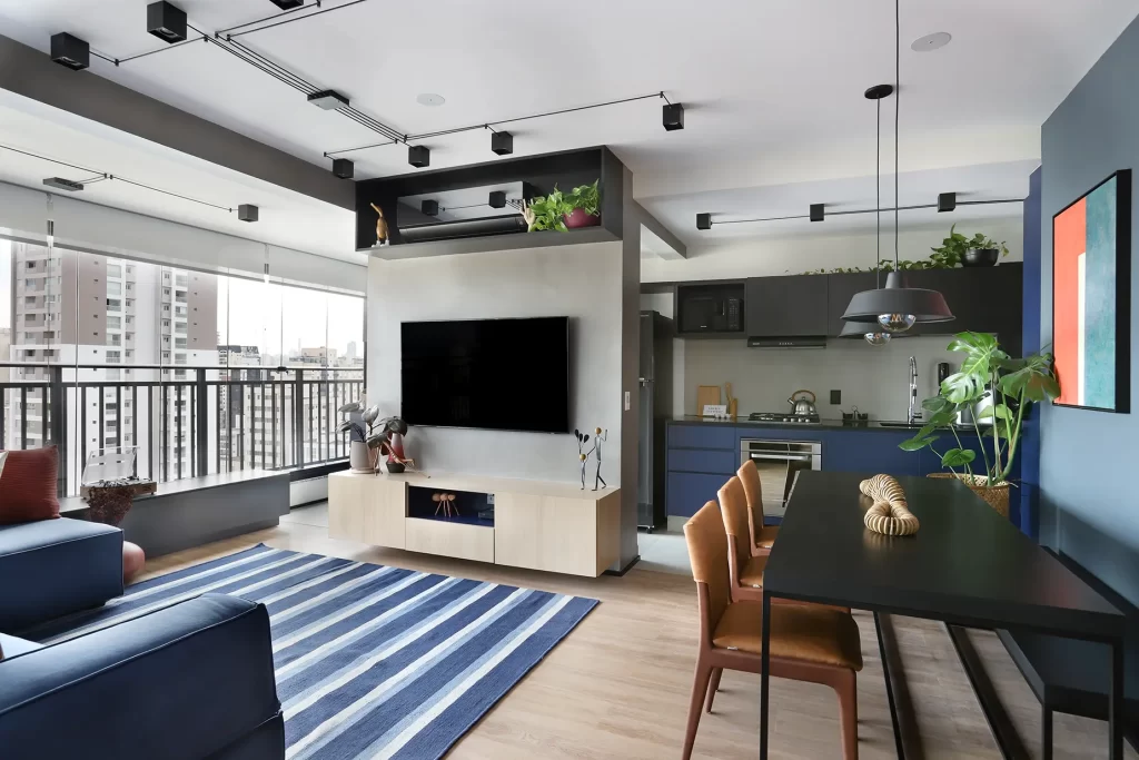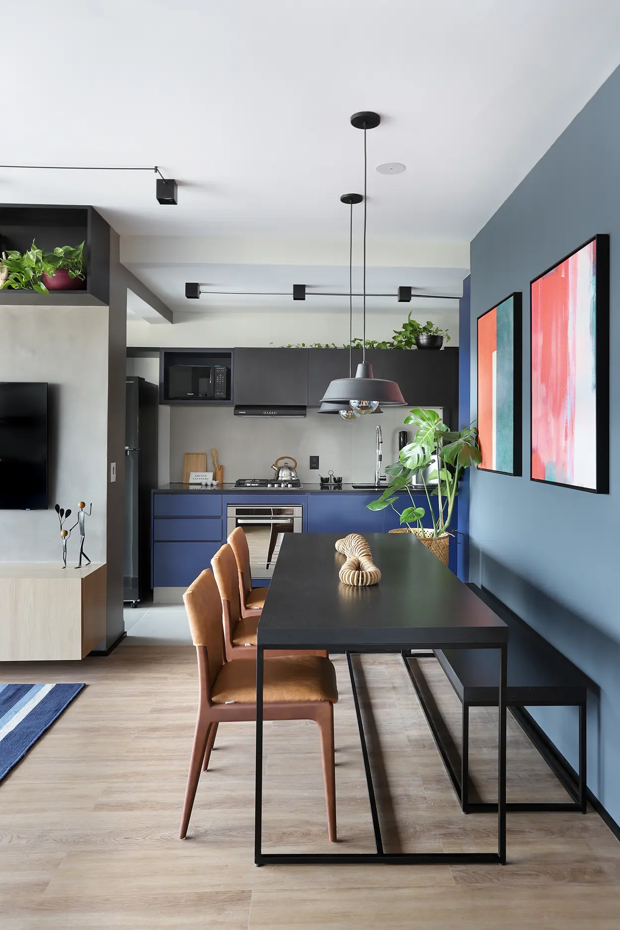 A área social, marcada por um sofá modular em azul cobalto, piso vinílico e paleta de tons frios com toques pontuais de preto e madeira, revela um layout versátil e cheio de aconchego. A mesa de jantar encostada na parede otimiza a circulação, enquanto o banco e as cadeiras em couro adicionam textura e personalidade.