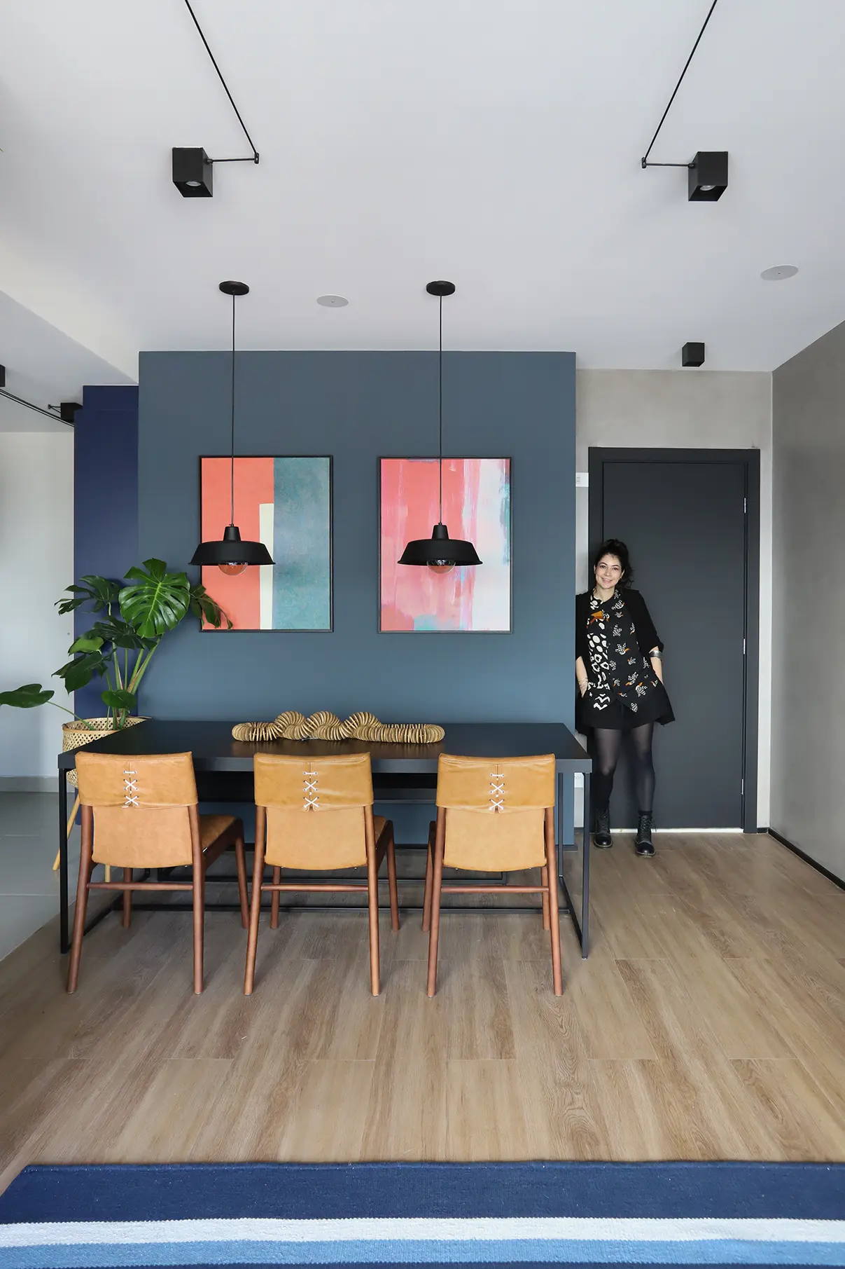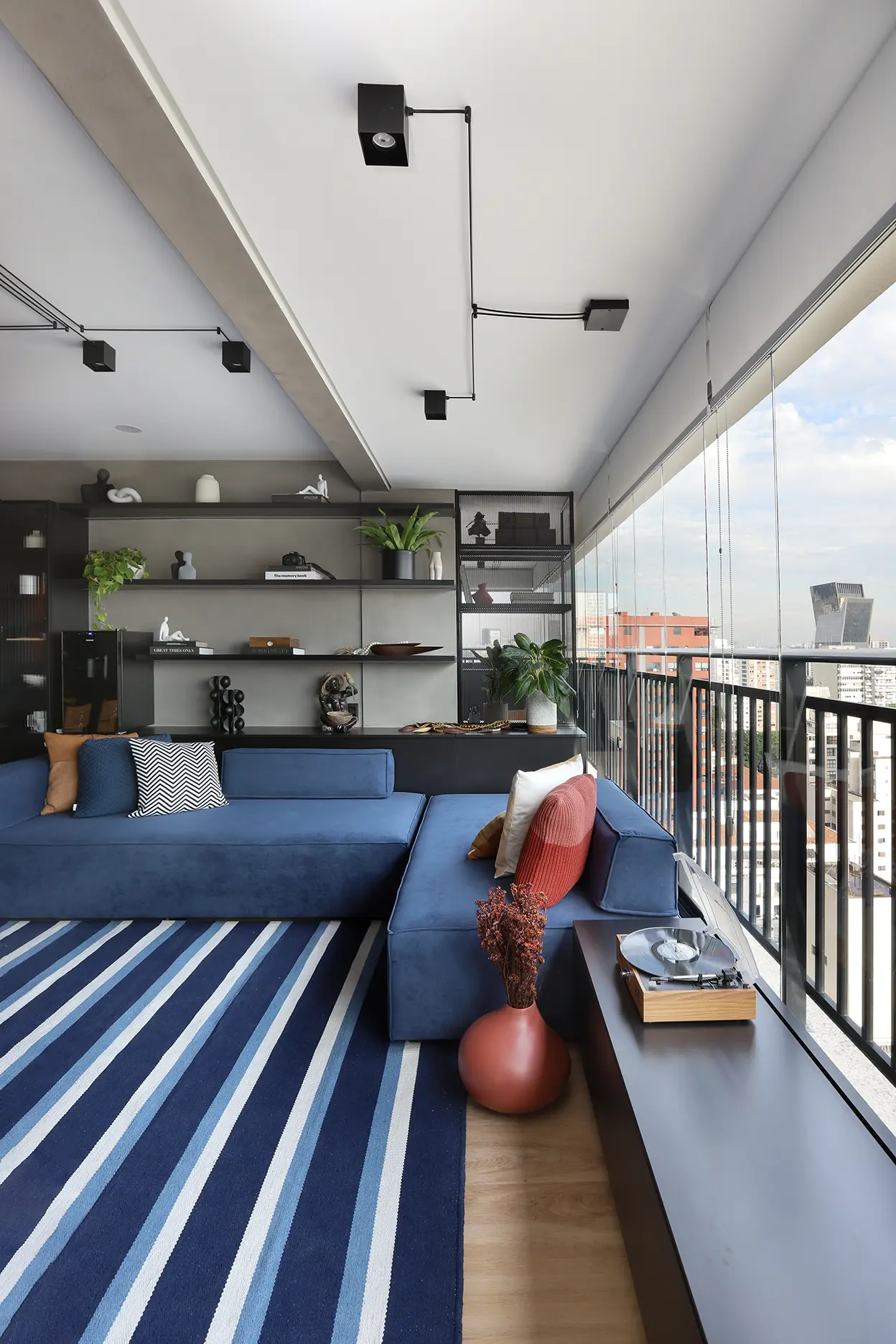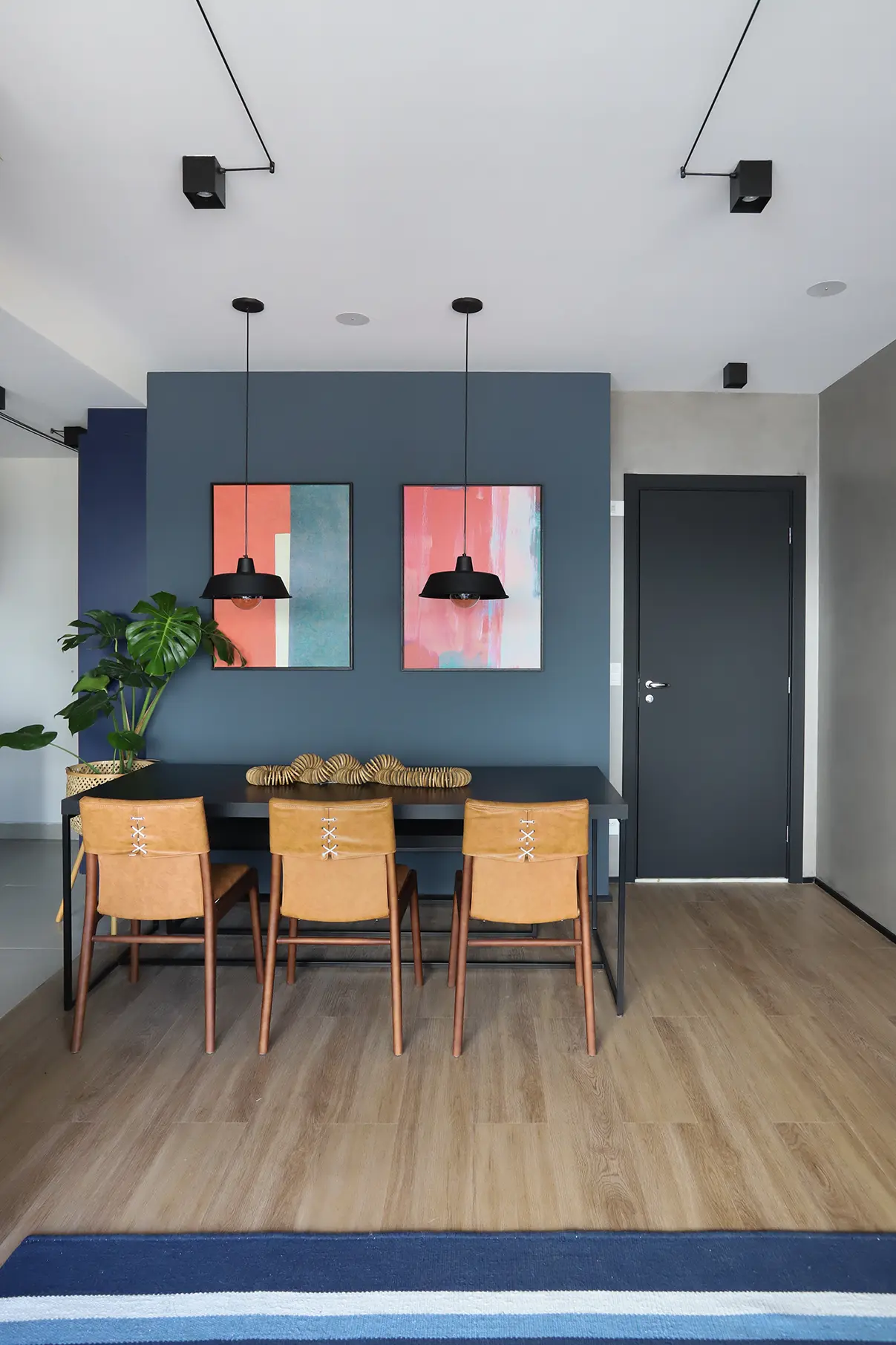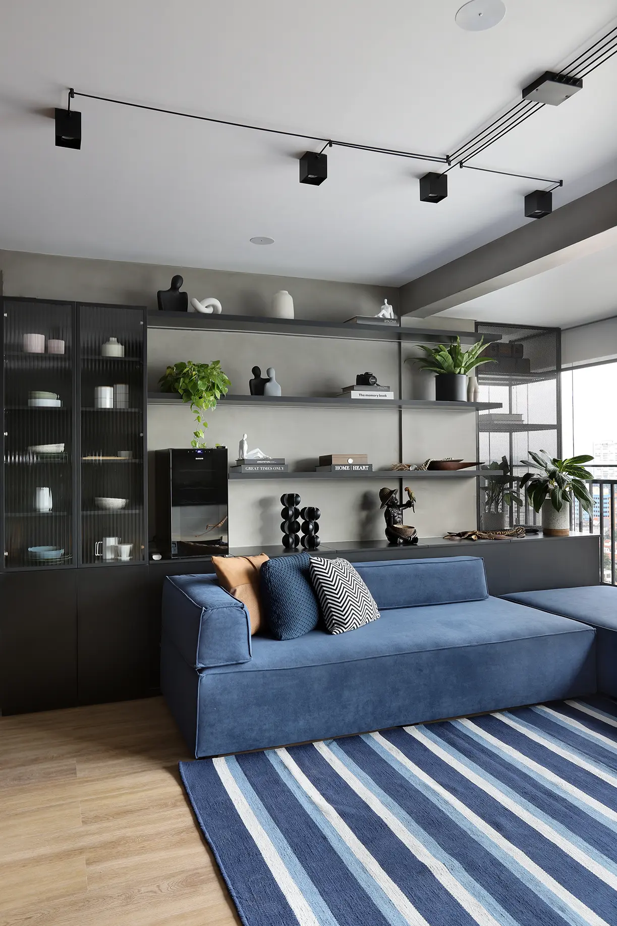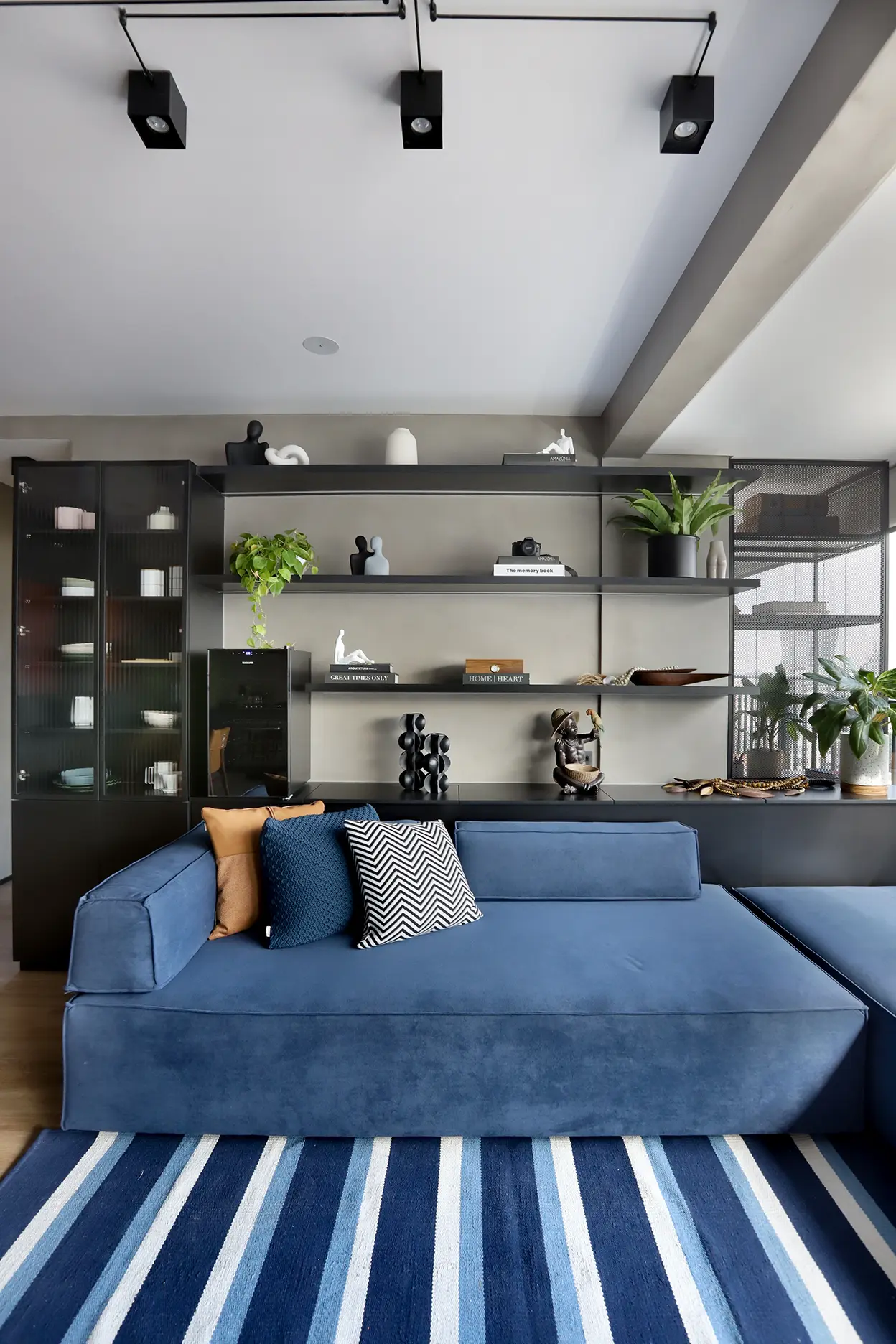 A área social, marcada por um sofá modular em azul cobalto, piso vinílico e paleta de tons frios com toques pontuais de preto e madeira, revela um layout versátil e cheio de aconchego. A mesa de jantar encostada na parede otimiza a circulação, enquanto o banco e as cadeiras em couro adicionam textura e personalidade.