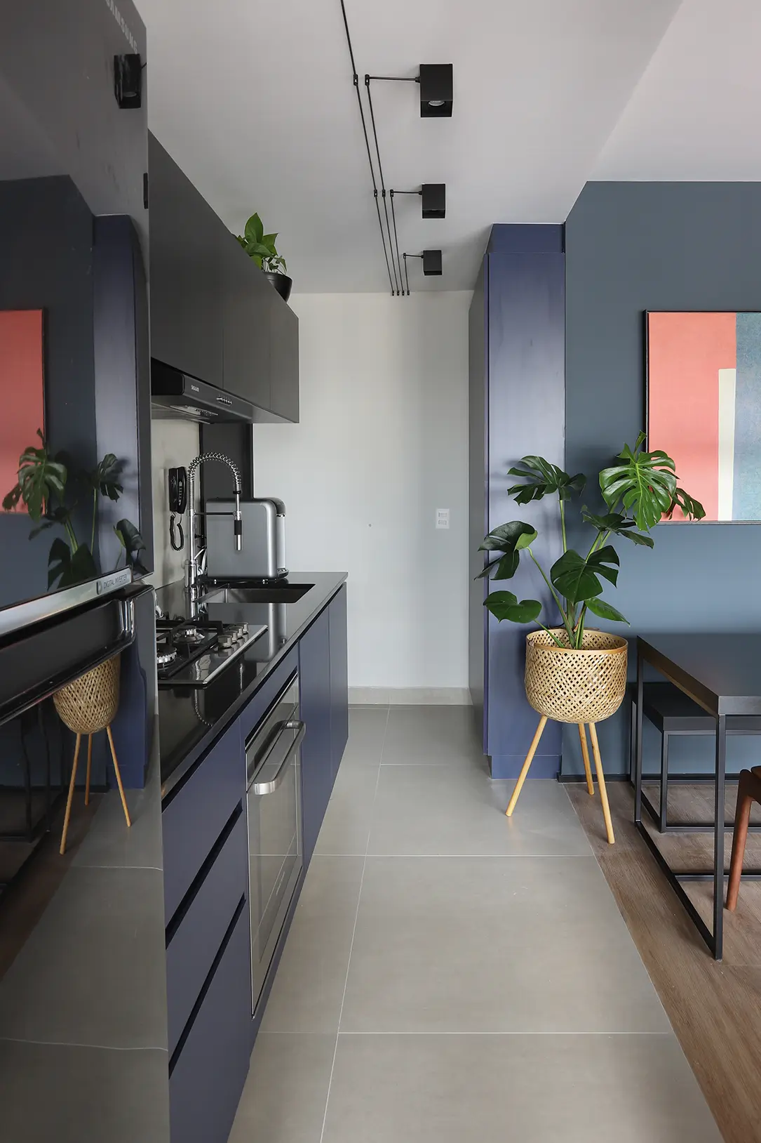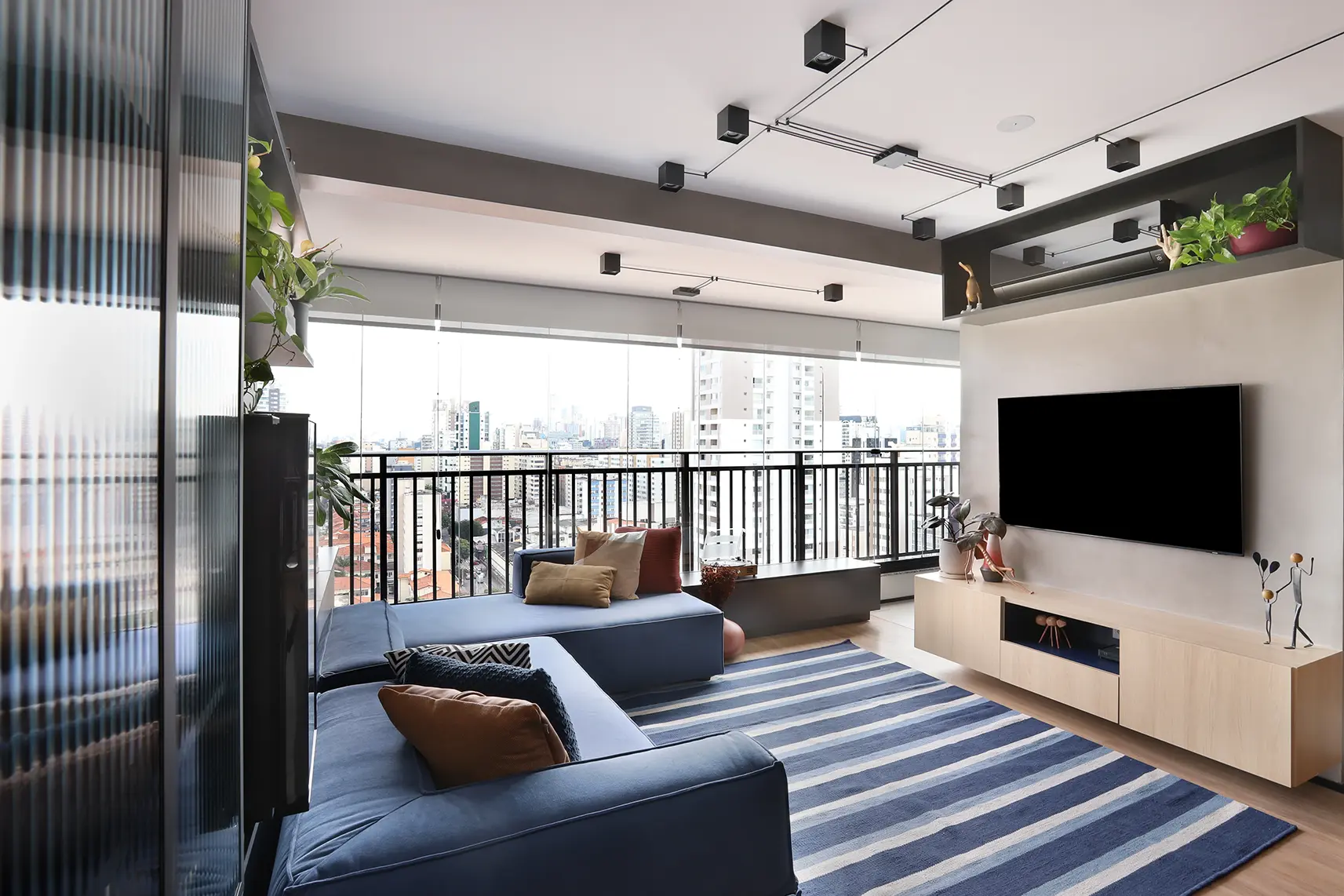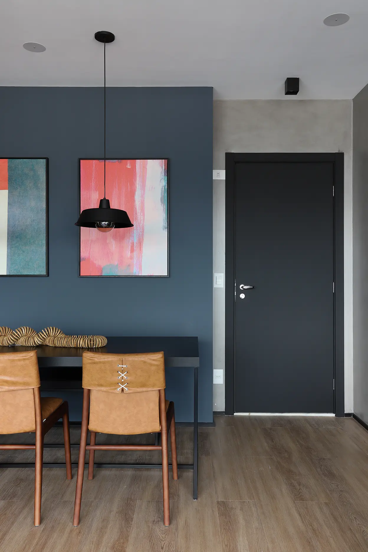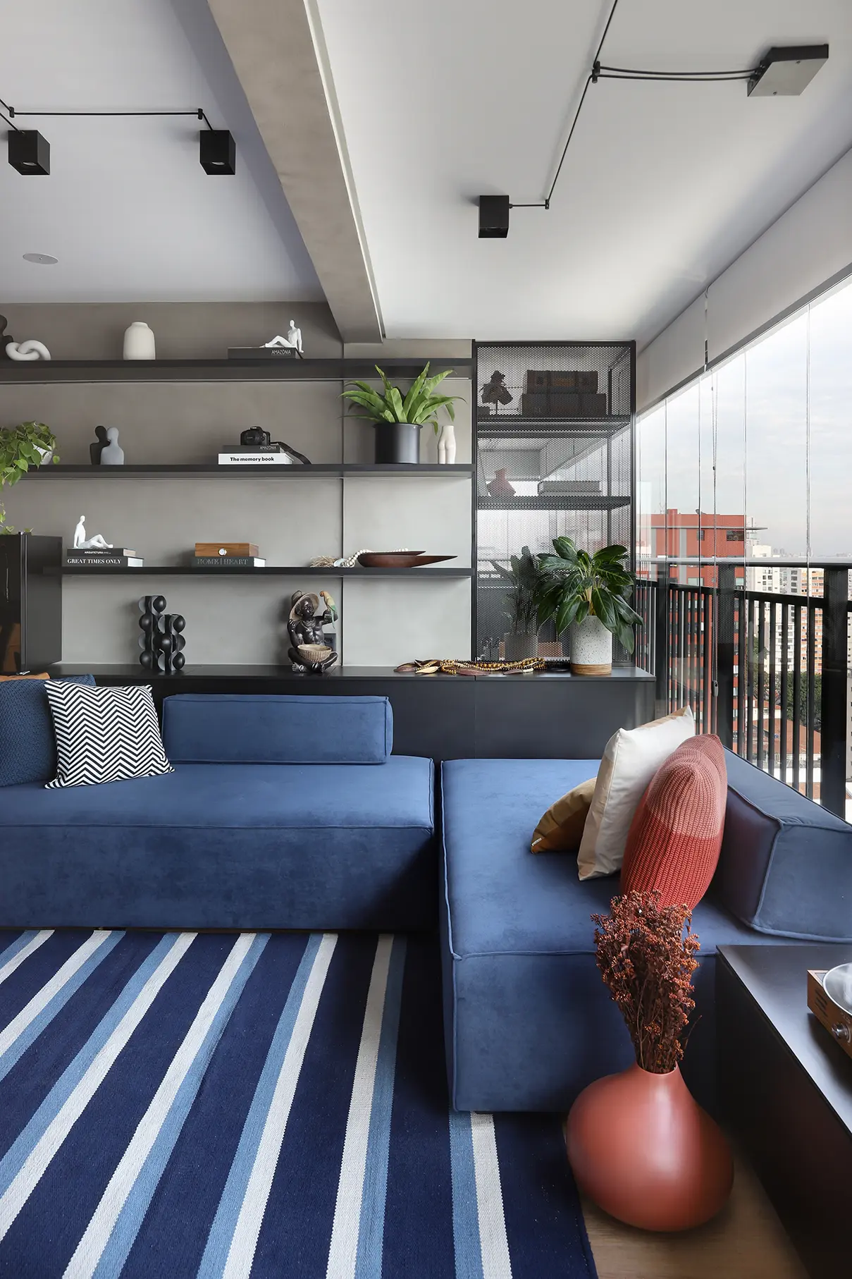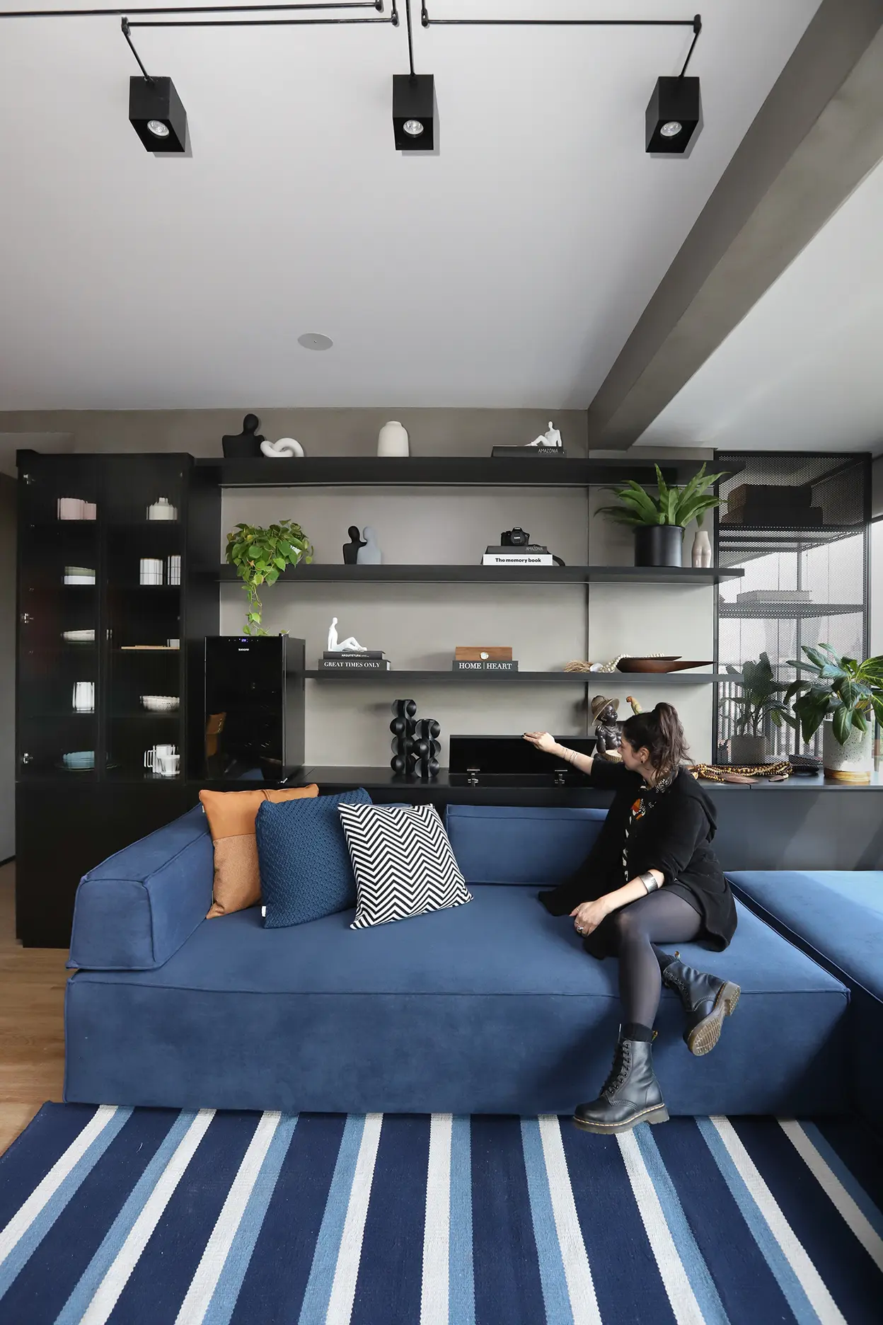 A área social, marcada por um sofá modular em azul cobalto, piso vinílico e paleta de tons frios com toques pontuais de preto e madeira, revela um layout versátil e cheio de aconchego. A mesa de jantar encostada na parede otimiza a circulação, enquanto o banco e as cadeiras em couro adicionam textura e personalidade.