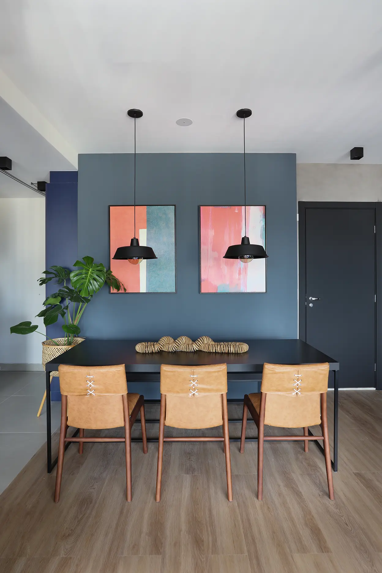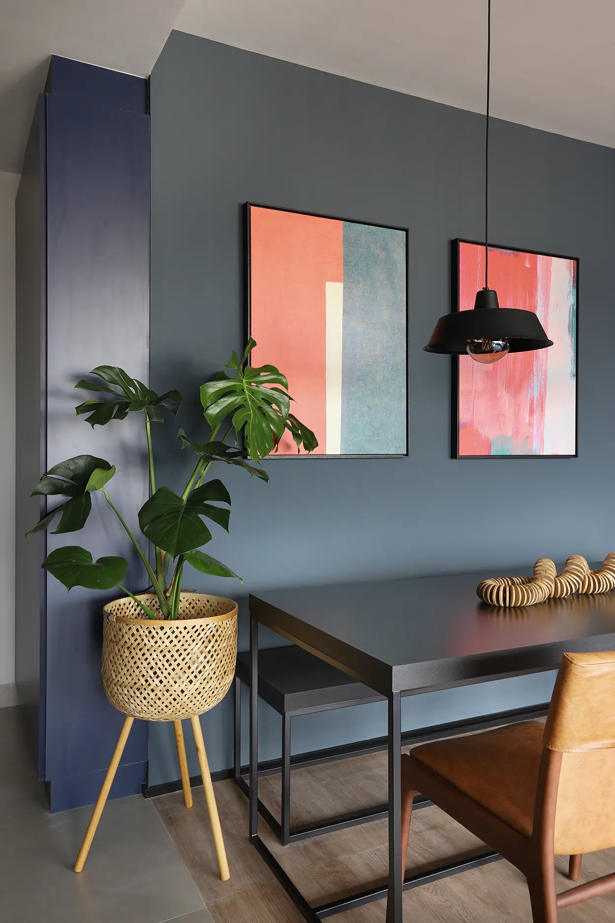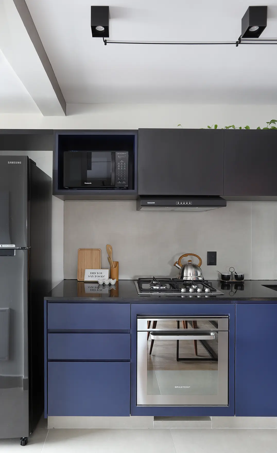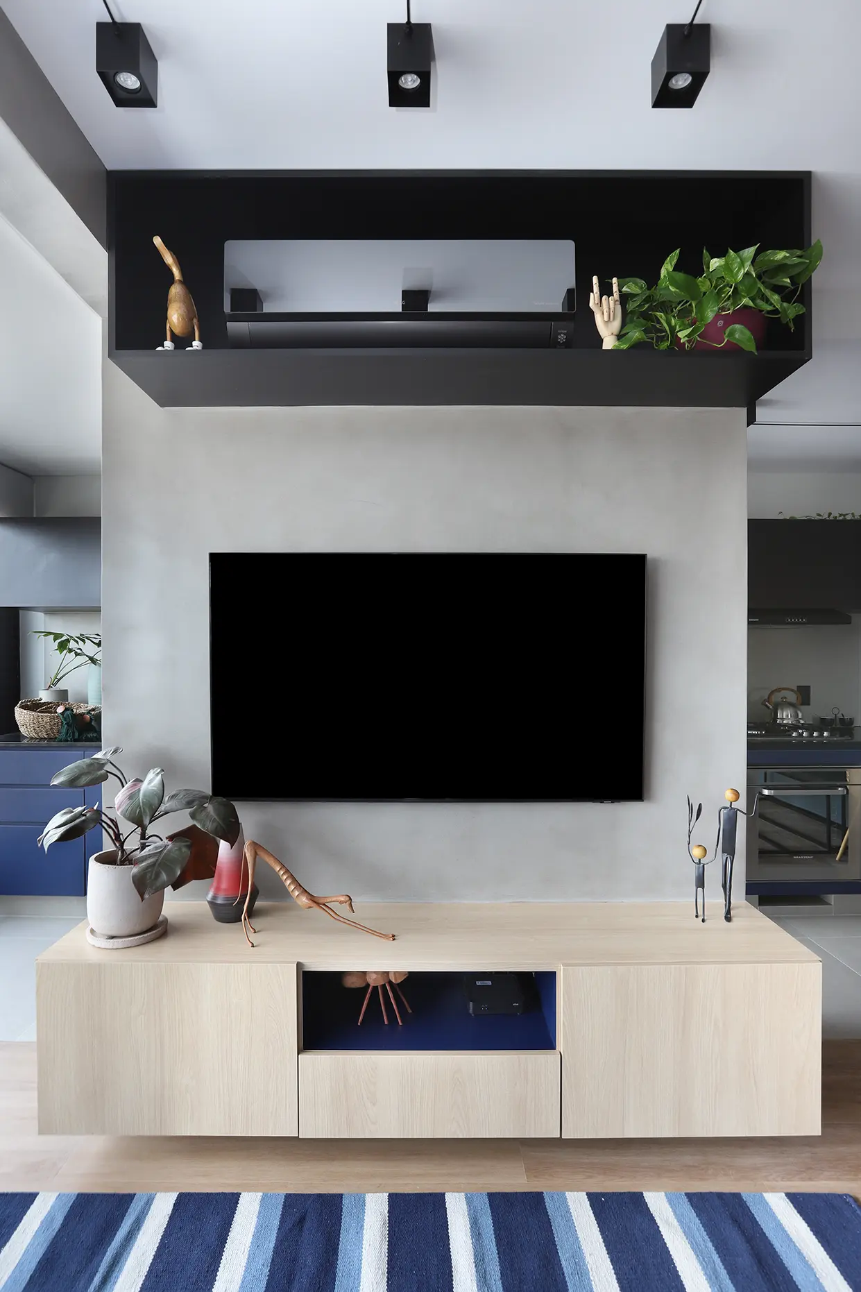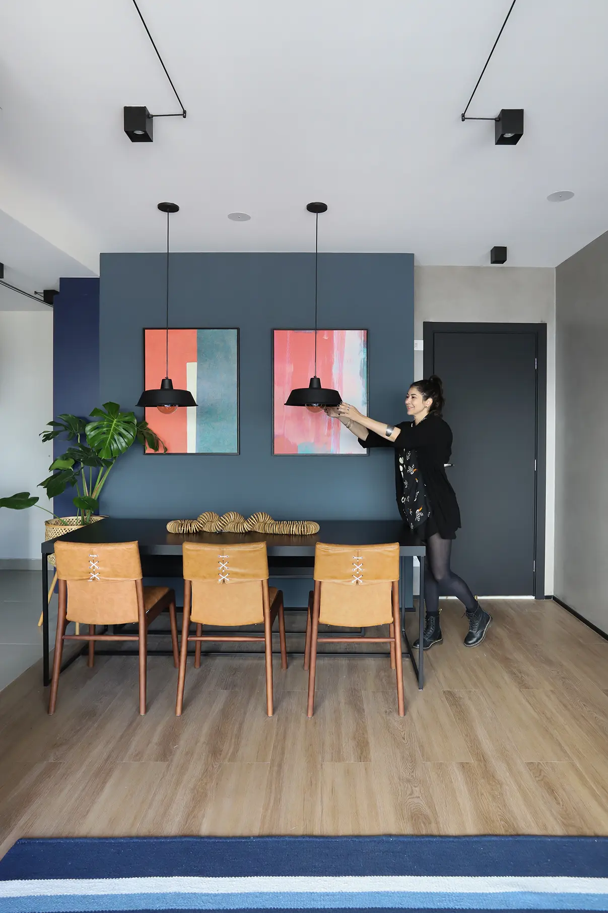 A área social, marcada por um sofá modular em azul cobalto, piso vinílico e paleta de tons frios com toques pontuais de preto e madeira, revela um layout versátil e cheio de aconchego. A mesa de jantar encostada na parede otimiza a circulação, enquanto o banco e as cadeiras em couro adicionam textura e personalidade.