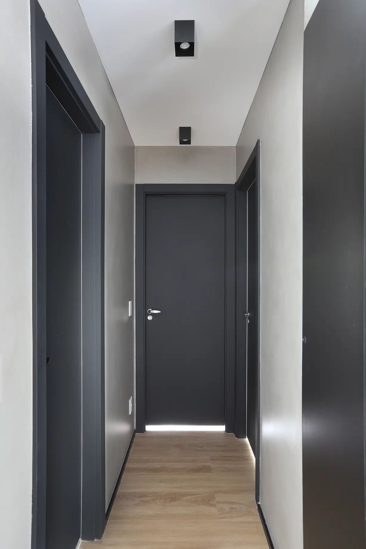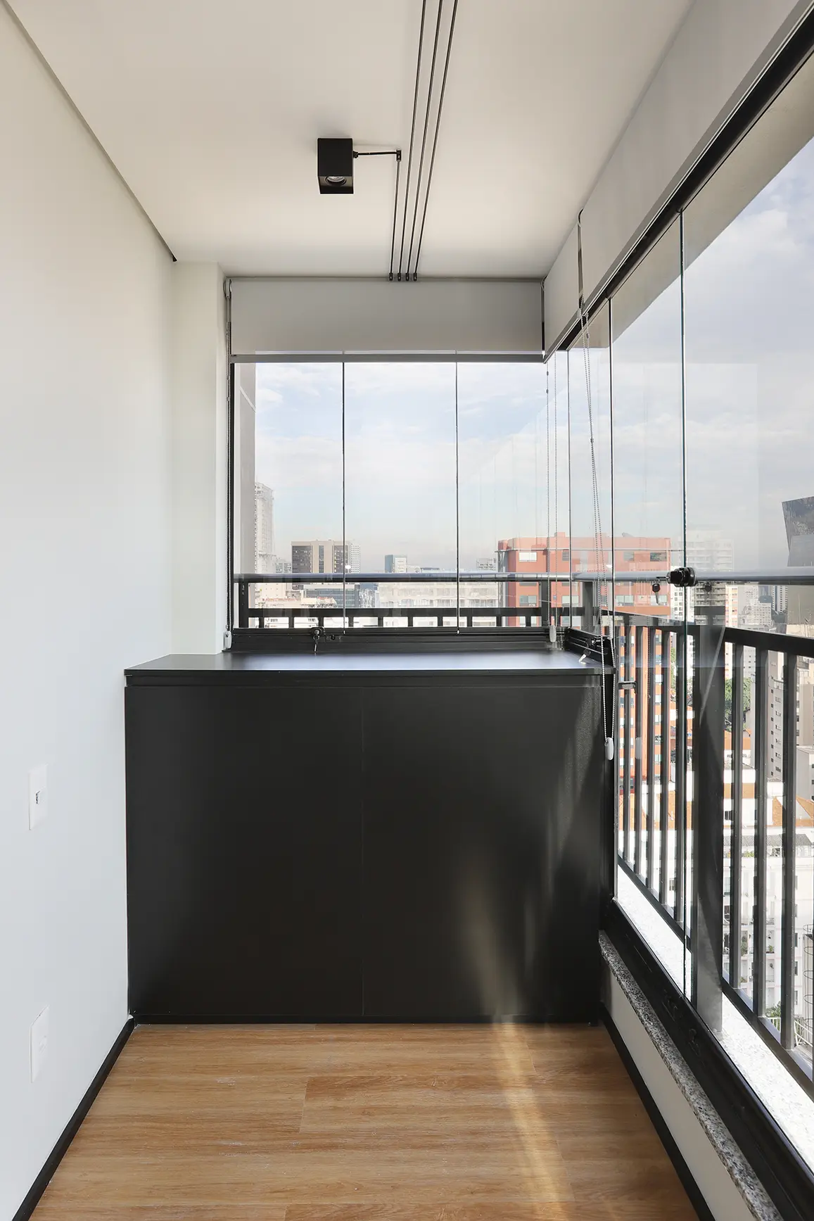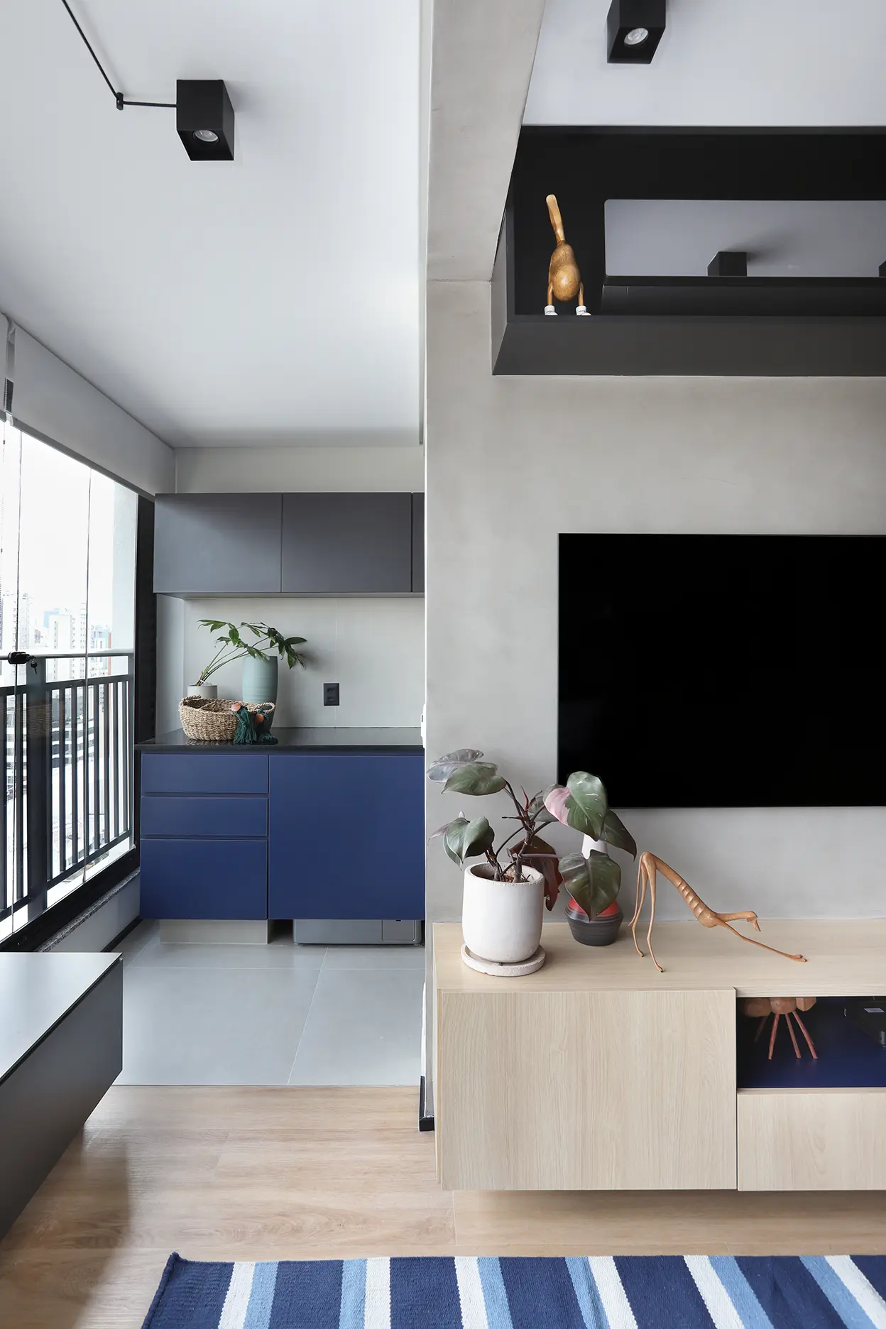 A principal intervenção estrutural foi a remoção do requadro e da esquadria da porta entre sala e varanda, integrando os ambientes e ampliando a sensação de espaço.