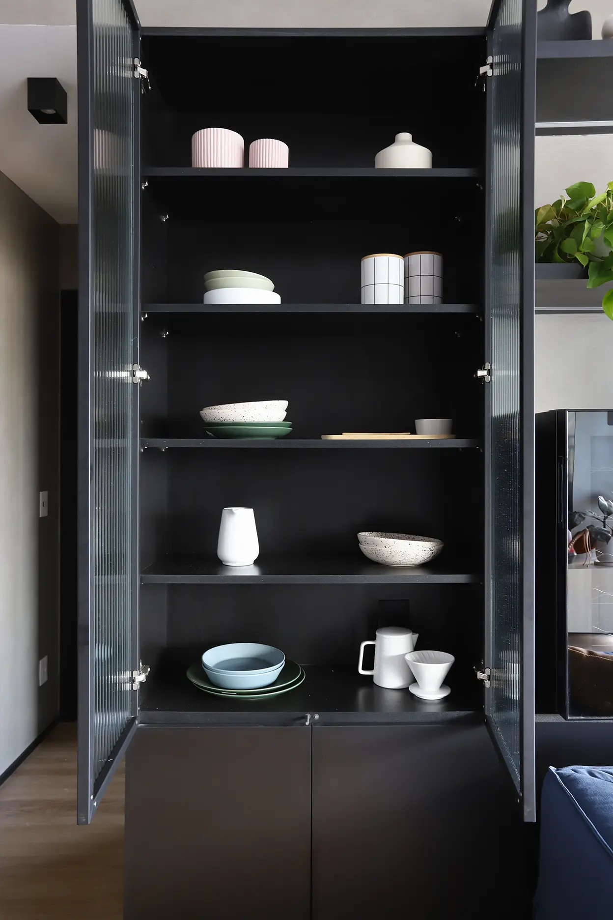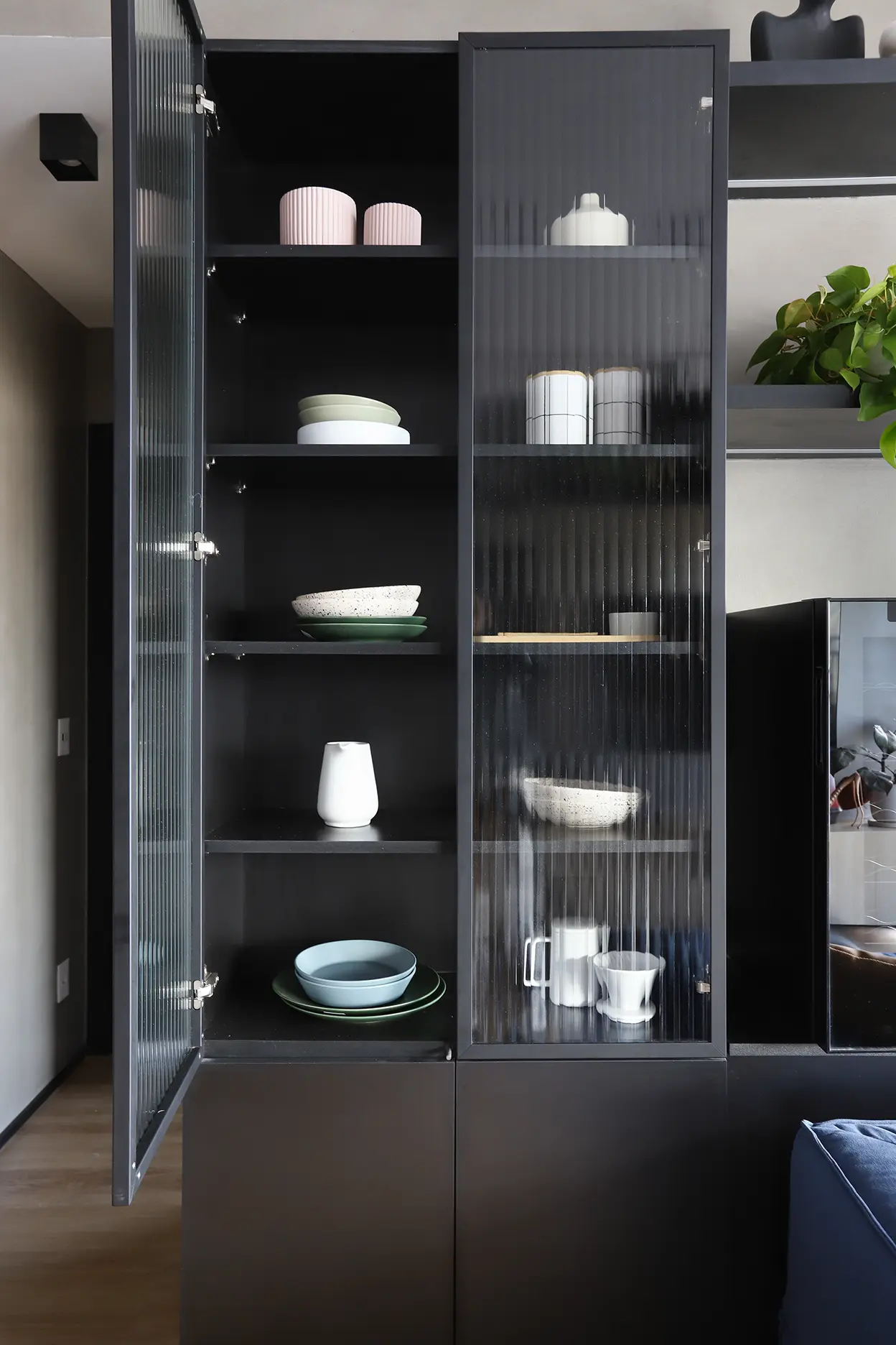 Elementos como cristaleira em serralheria com vidro canelado, prateleiras com LED embutido e armários com dupla função aparecem como soluções práticas para o dia a dia.