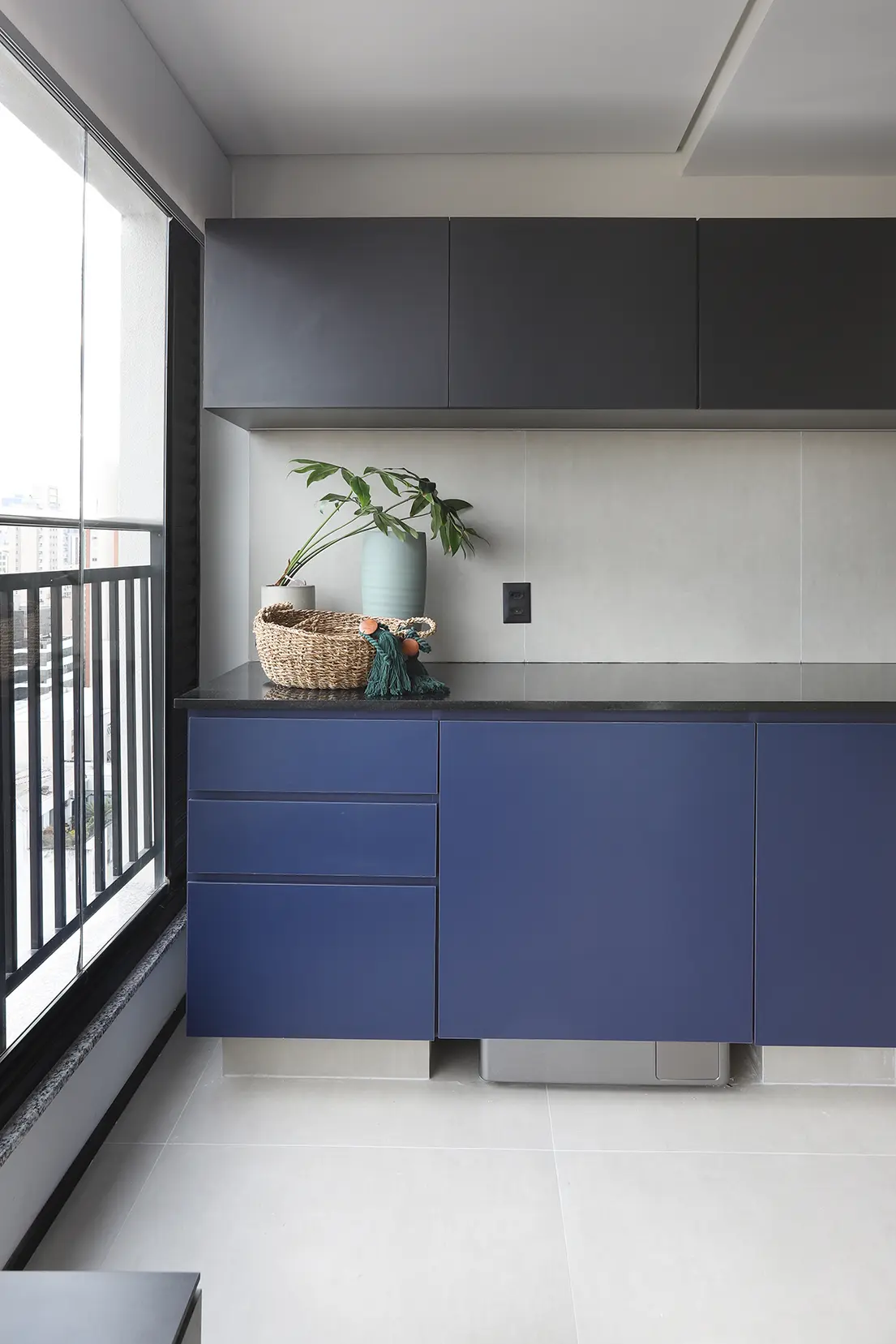 A cozinha se estende visualmente até a lavanderia, com bancada e armários no mesmo acabamento, reforçando a fluidez entre os ambientes.