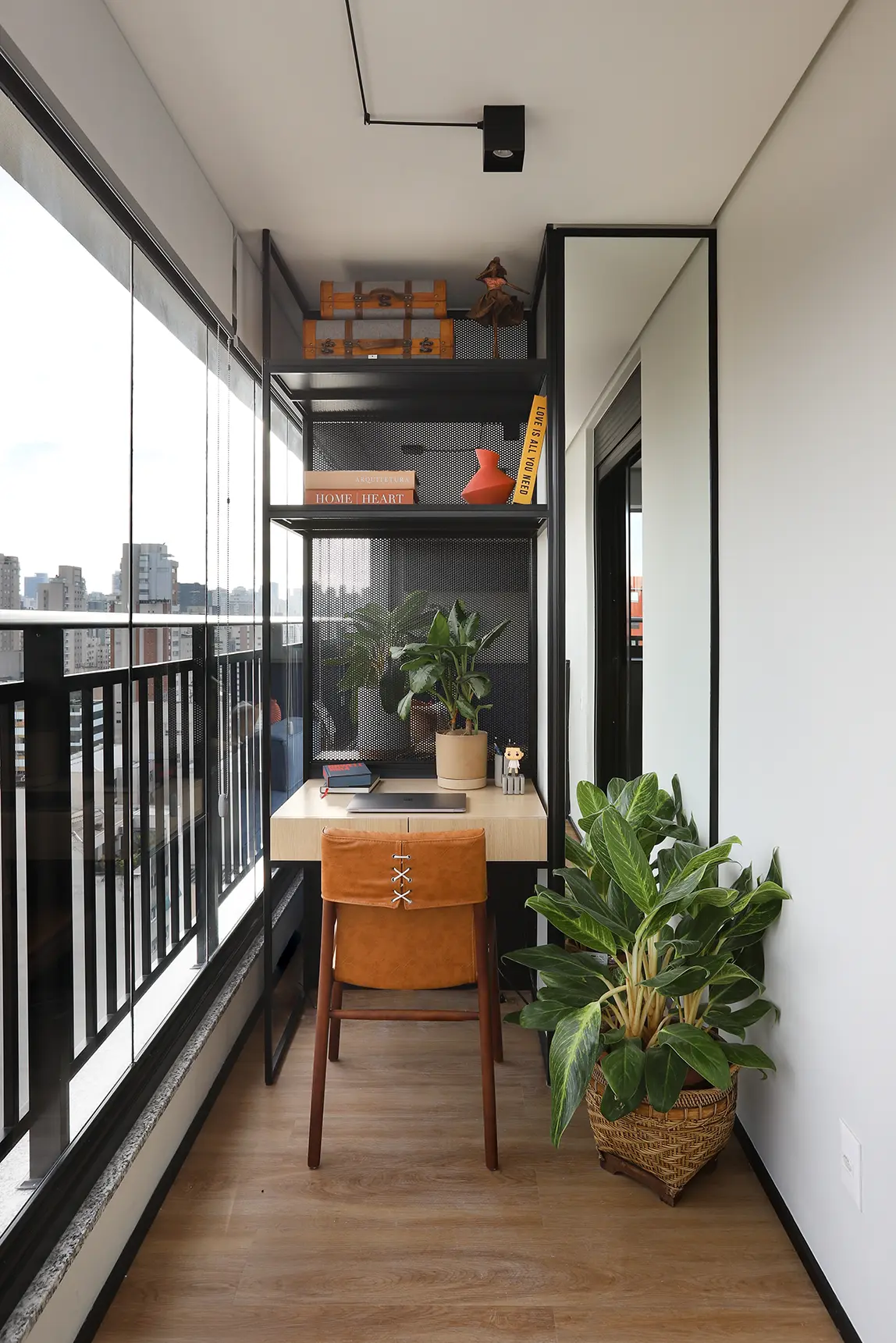 No home office, criado na varanda com acesso pela suíte, uma divisória em chapa perfurada garante leveza e ventilação. A bancada desenhada em tom carvalho e serralheria preta, junto de prateleiras e vegetação, transforma o espaço em um refúgio funcional.