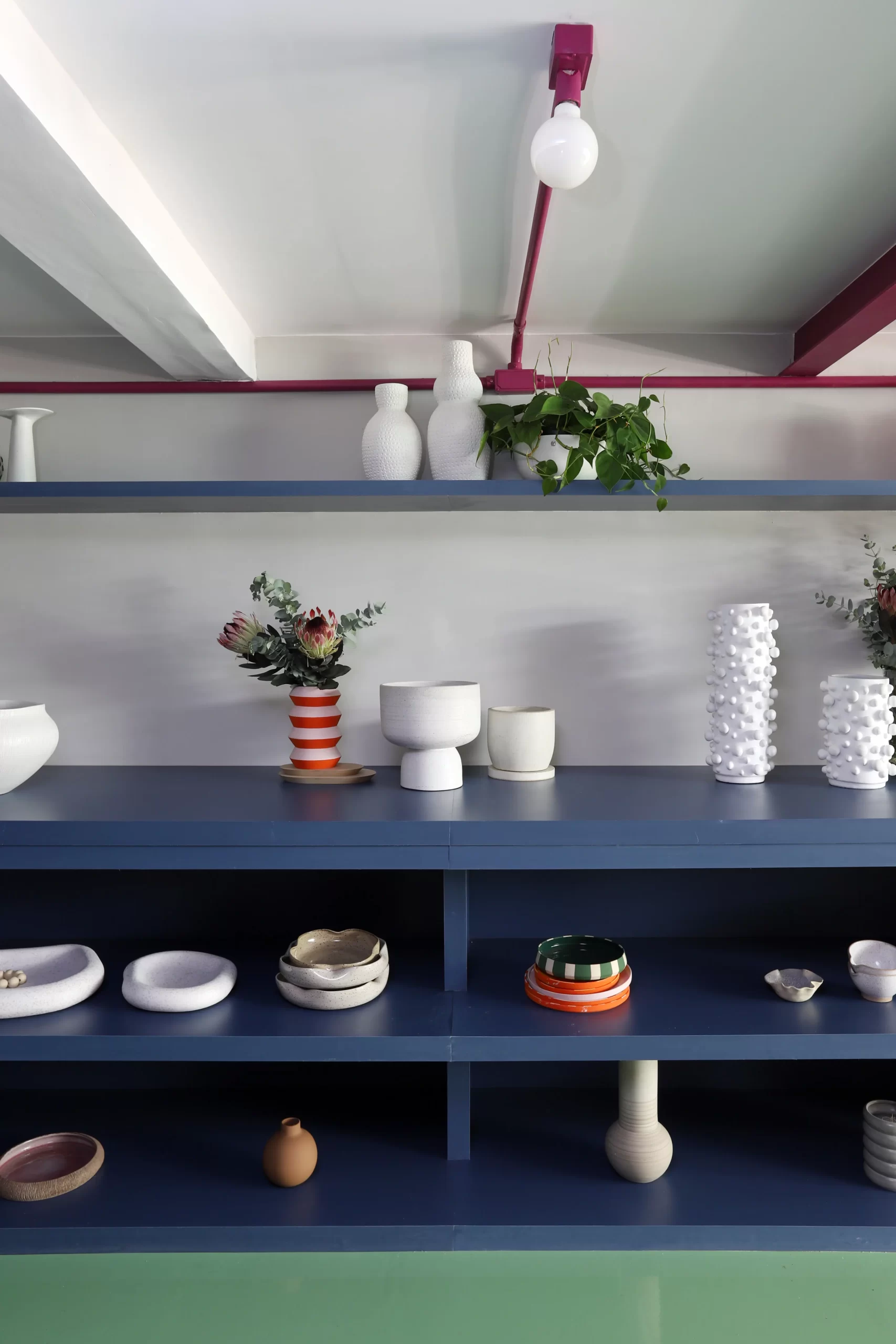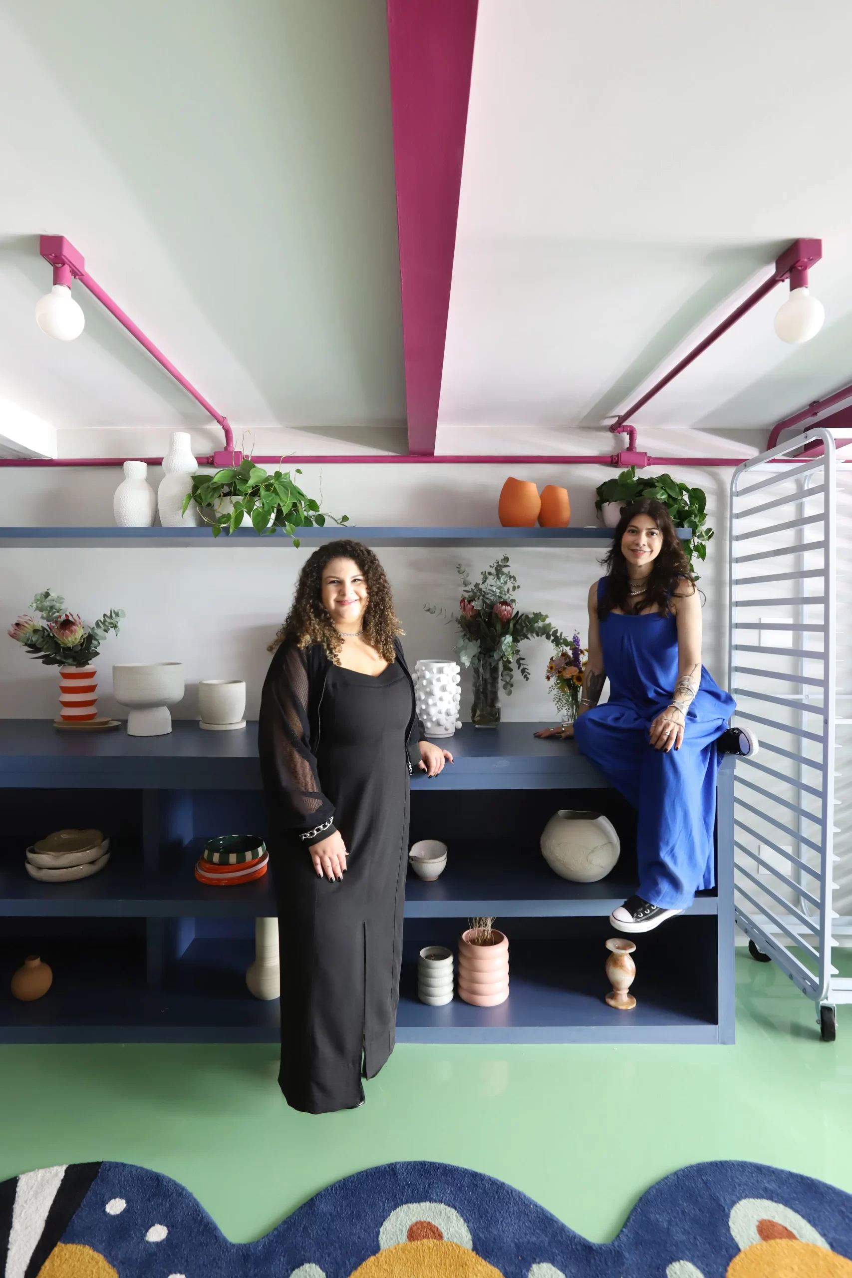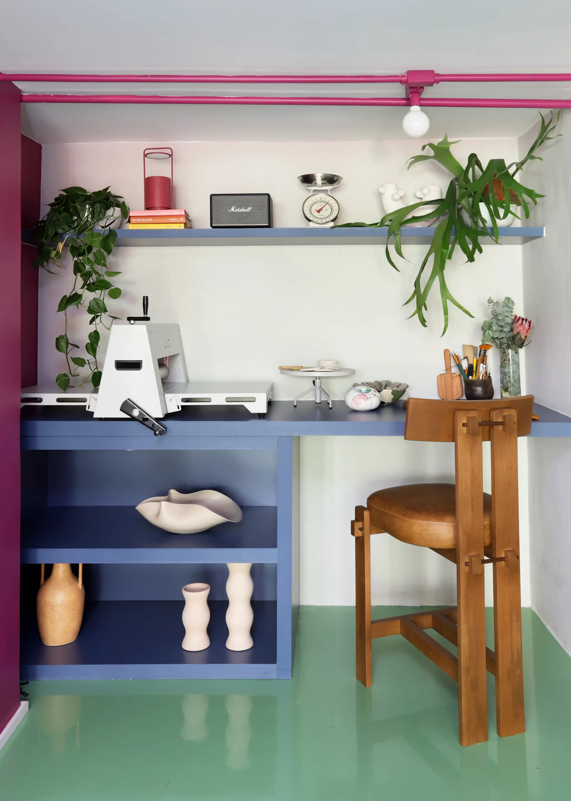 A bancada de trabalho da ceramista e os móveis expositores foram desenhados pelo Studio92 e revestidos em fórmica azul. A cuba grande, no estilo farm sink, foi posicionada sobre marcenaria rosa, contrastando com os tons do entorno. Para receber clientes, criamos uma área com mobiliário contemporâneo: cadeiras pretas em metal, mesas e cachepots brancos, compondo com os metais da bancada e os acessórios do lavabo.