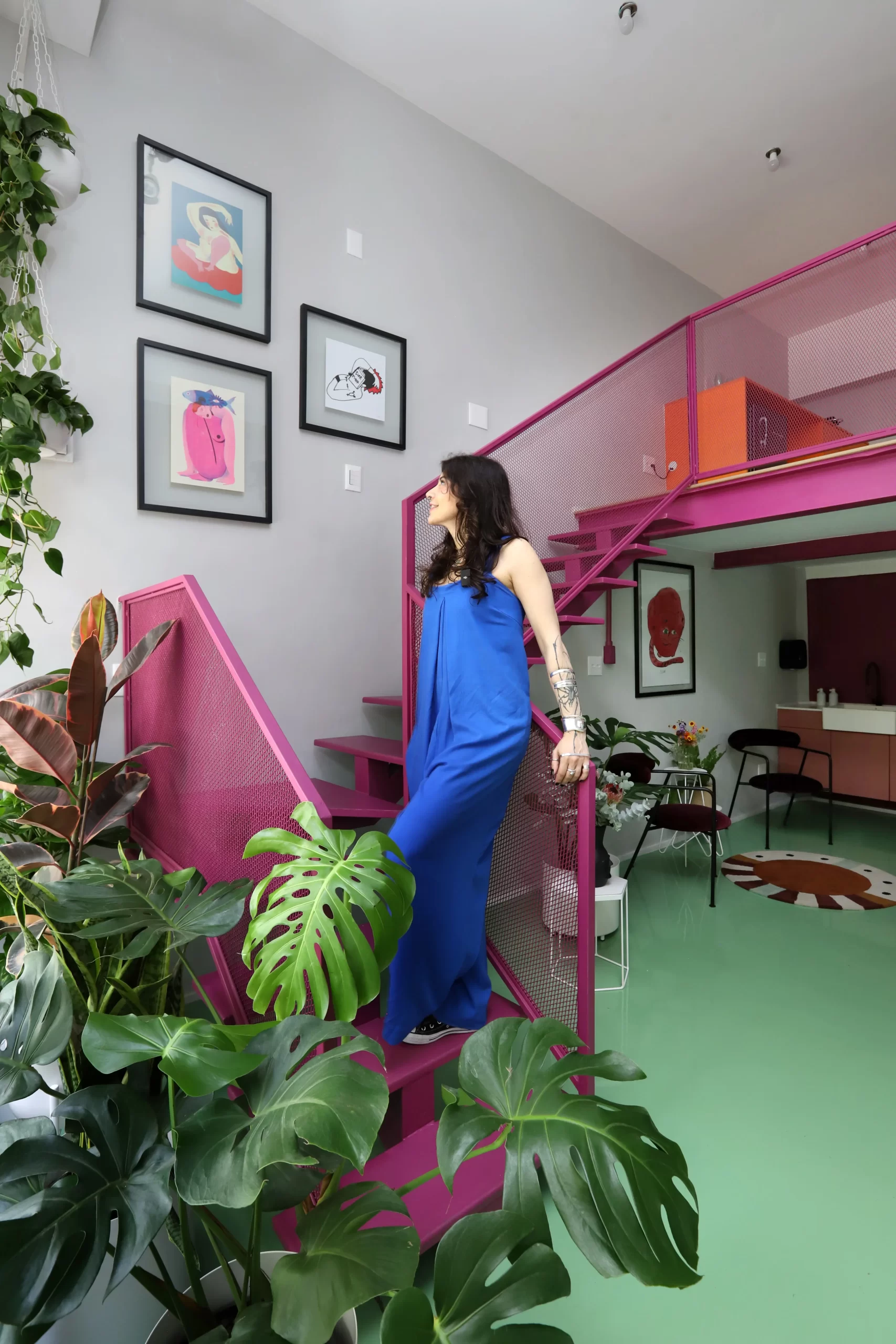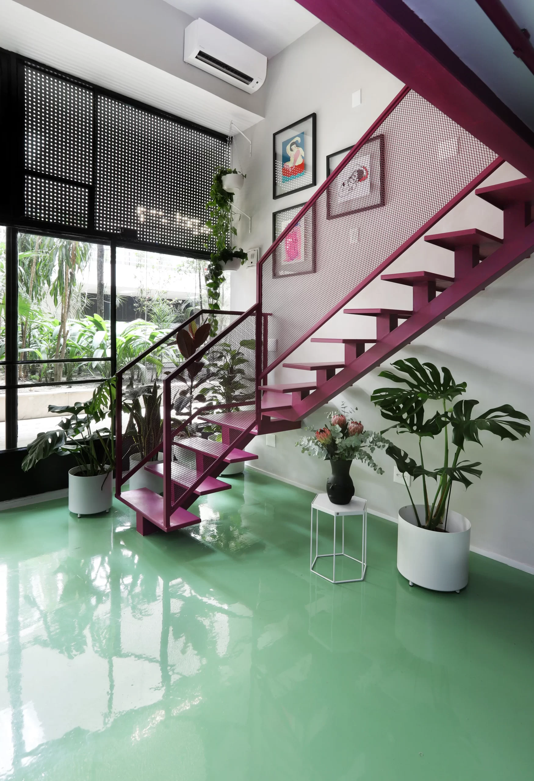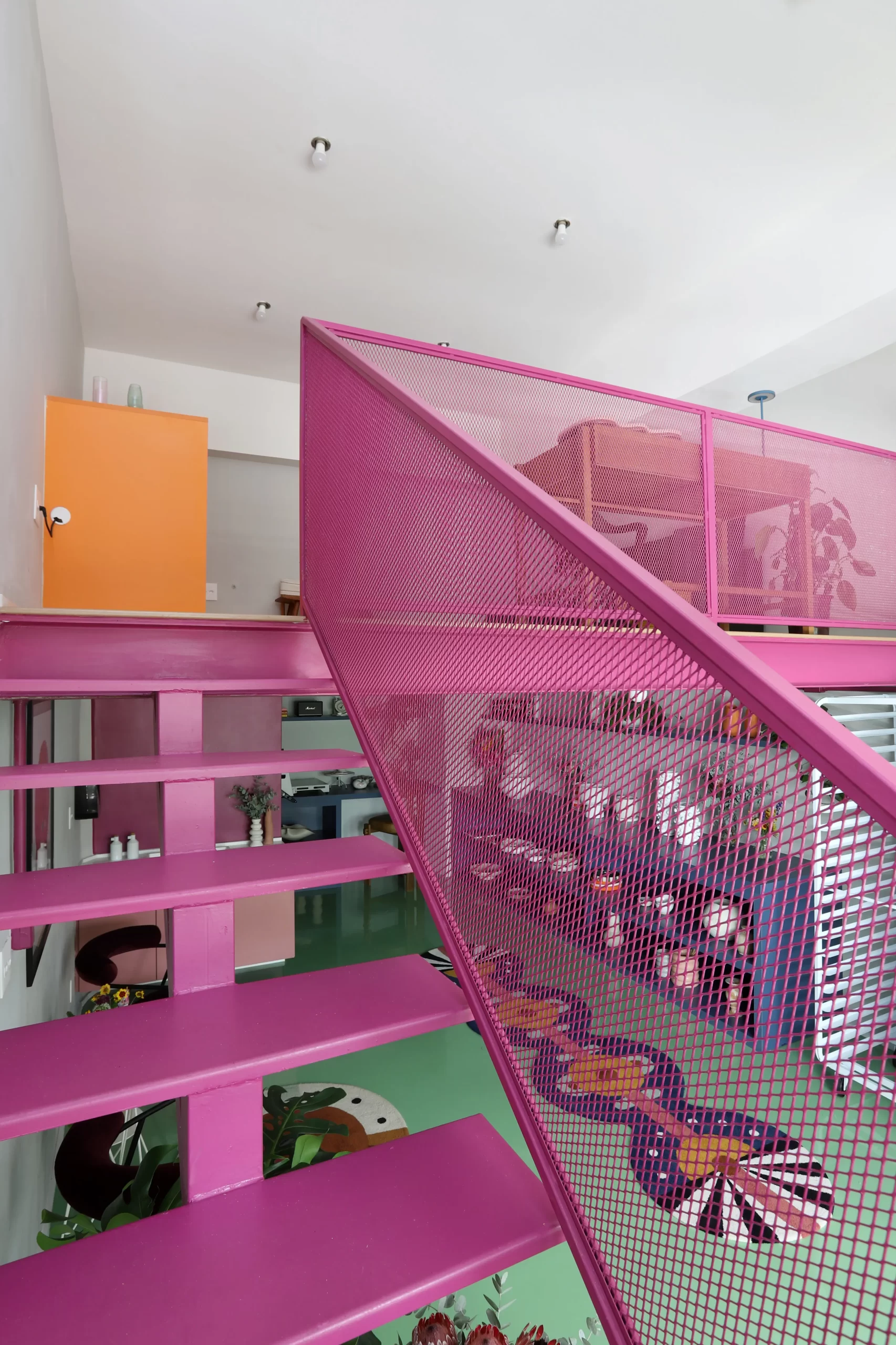 A estrutura metálica da escada recebeu tela vazada como guarda-corpo, criando transparência e ampliando a presença das cores no espaço. Na vitrine, vasos com plantas ajudam a filtrar a vista da rua e trazem um toque de biofilia para o interior.