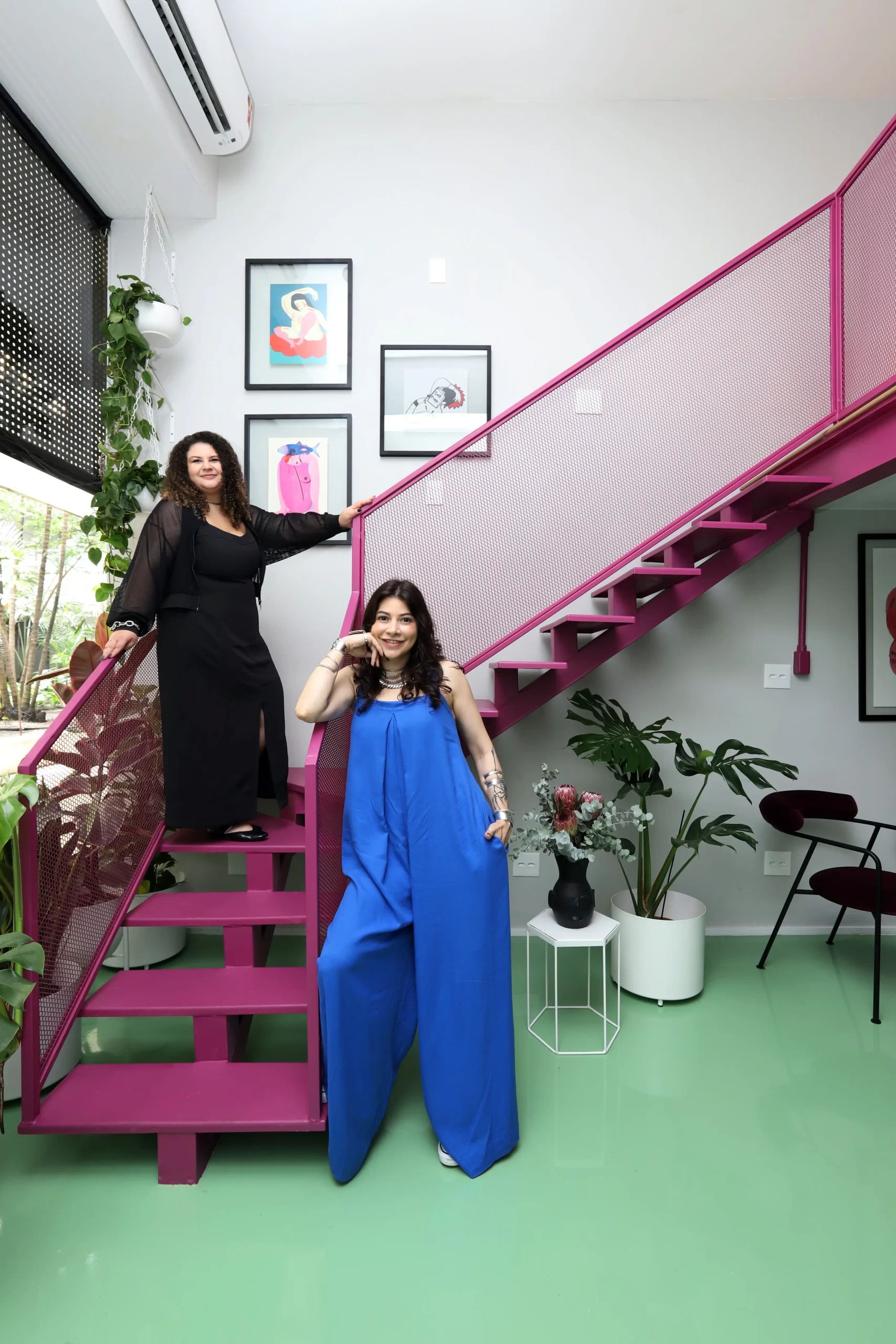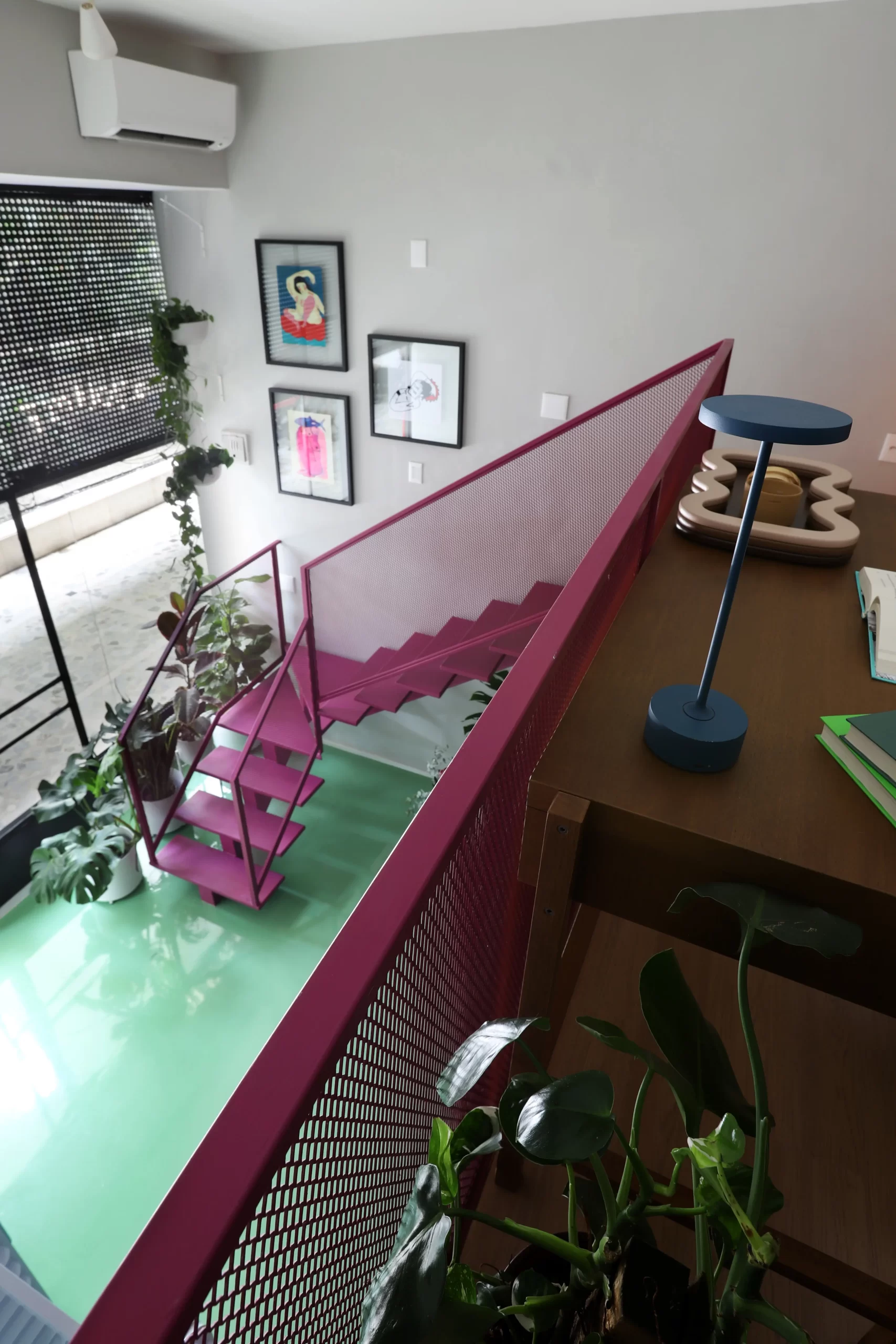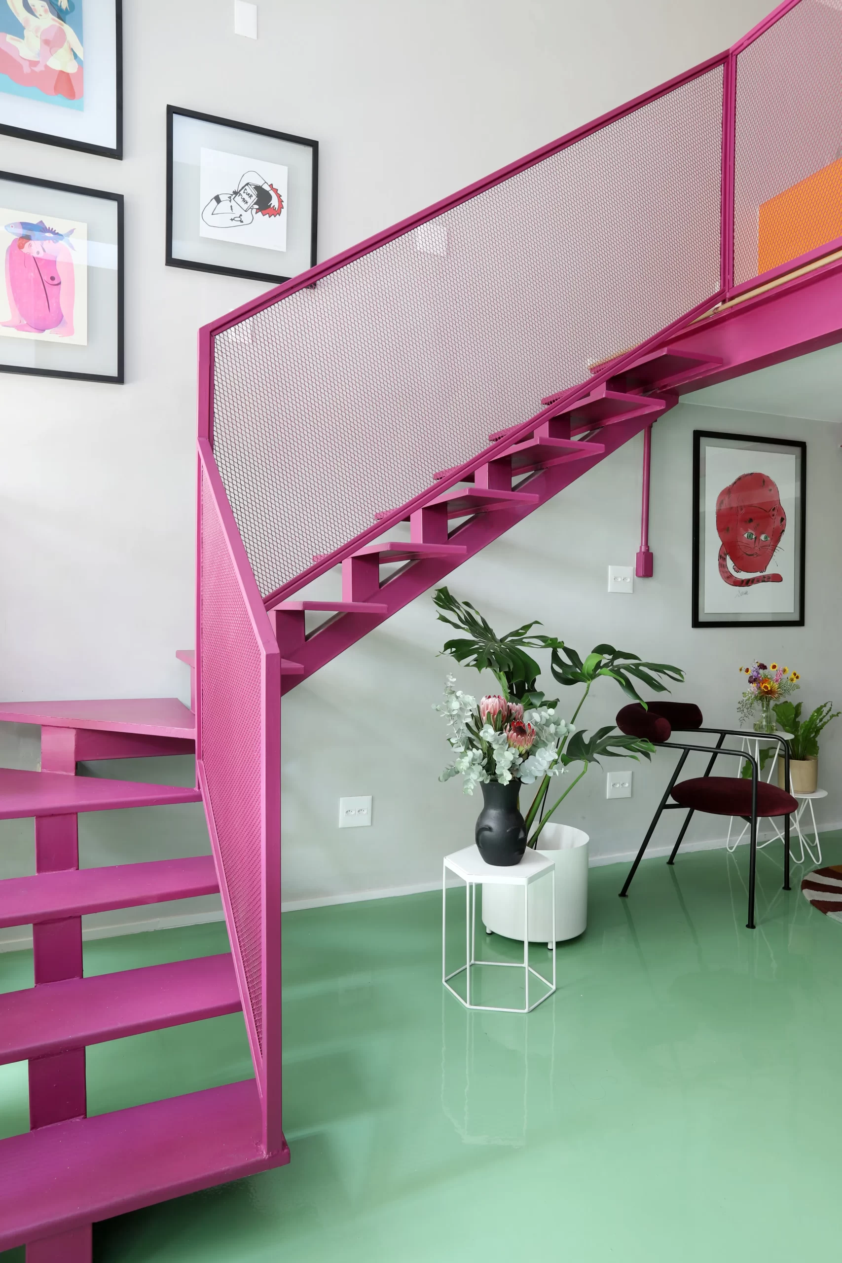 A estrutura metálica da escada recebeu tela vazada como guarda-corpo, criando transparência e ampliando a presença das cores no espaço. Na vitrine, vasos com plantas ajudam a filtrar a vista da rua e trazem um toque de biofilia para o interior.