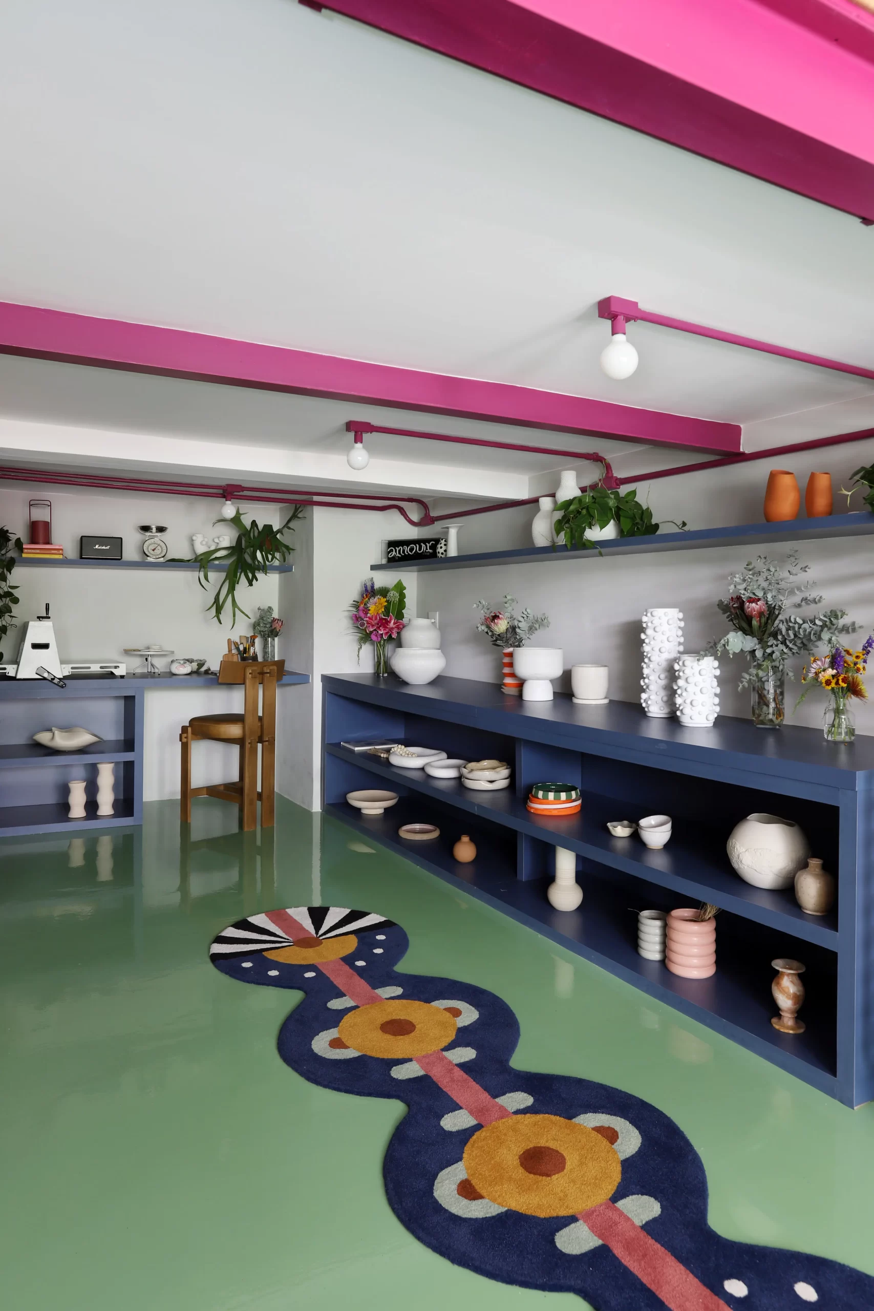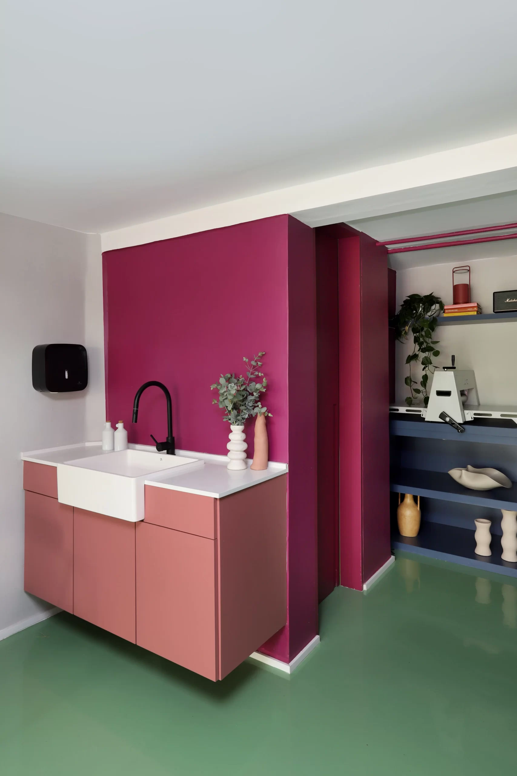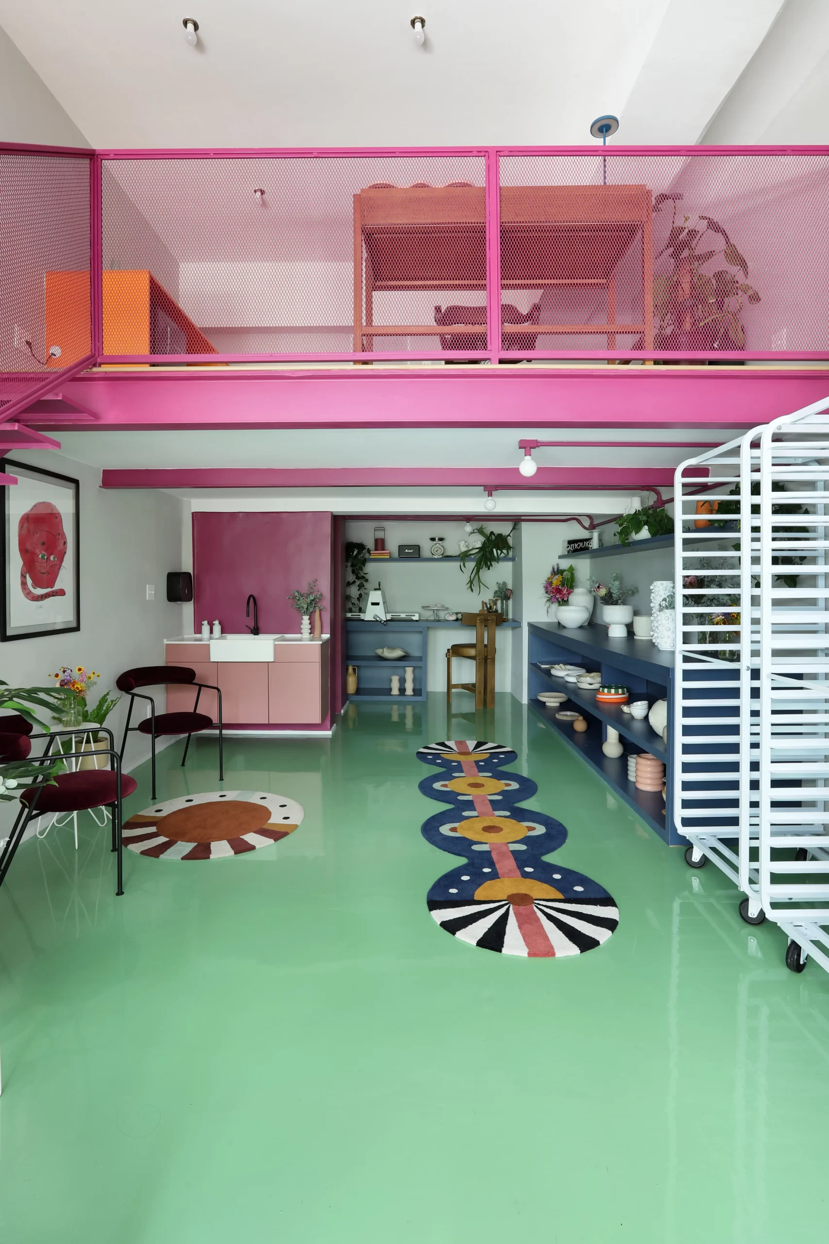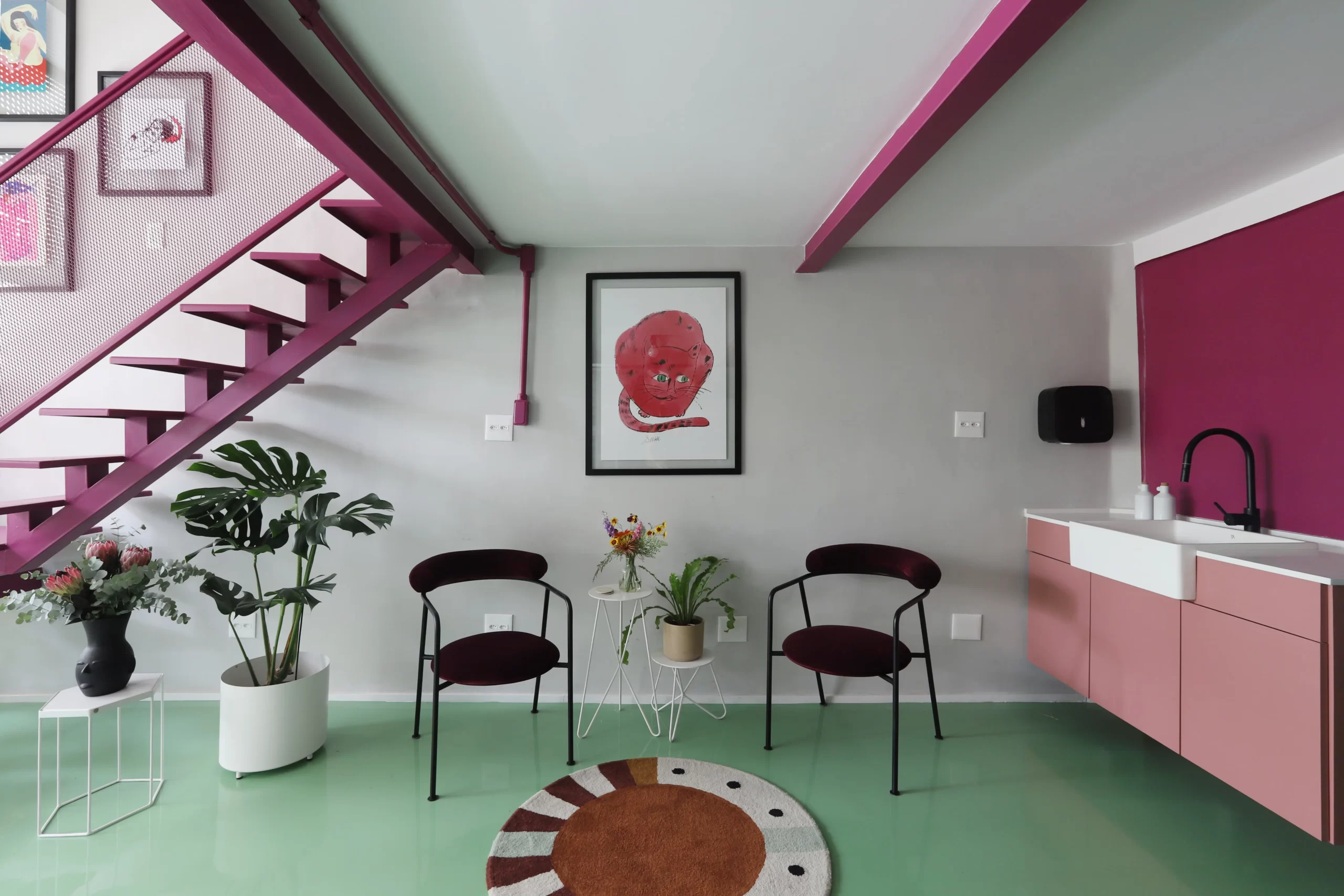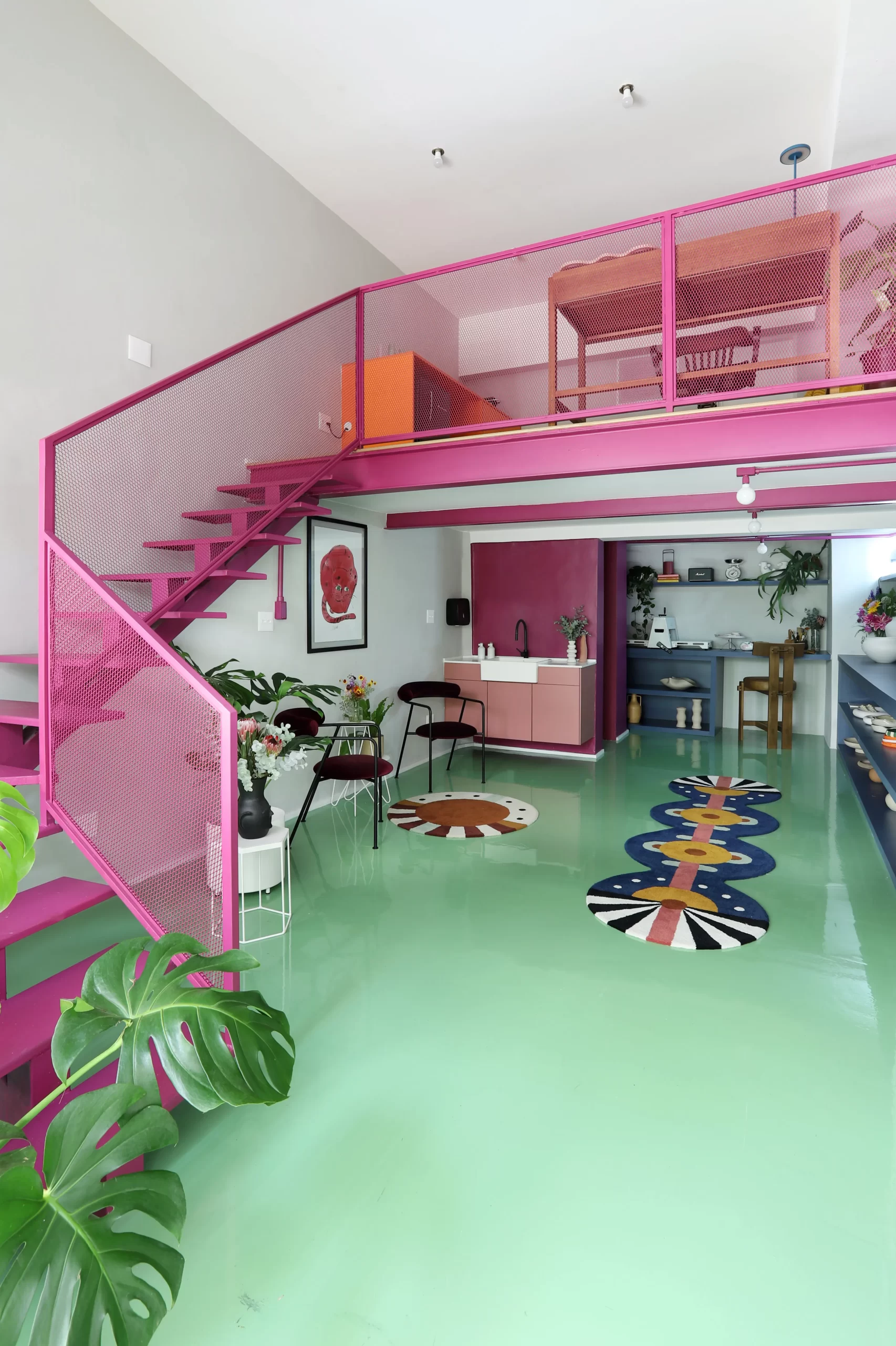A paleta de cores é um dos elementos centrais do projeto. Piso em epóxi verde, escada e vigas em tom de beterraba, armários em fórmica azul e rosa, além de pontos de cor em laranja e verde-limão criam uma atmosfera vibrante e impactante. A escolha do epóxi para o piso atende tanto à estética quanto à necessidade de resistência e fácil manutenção — essencial para o fluxo de pessoas e o uso intenso do espaço.