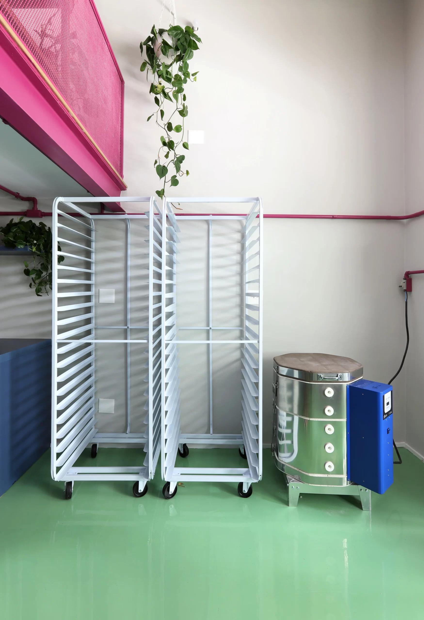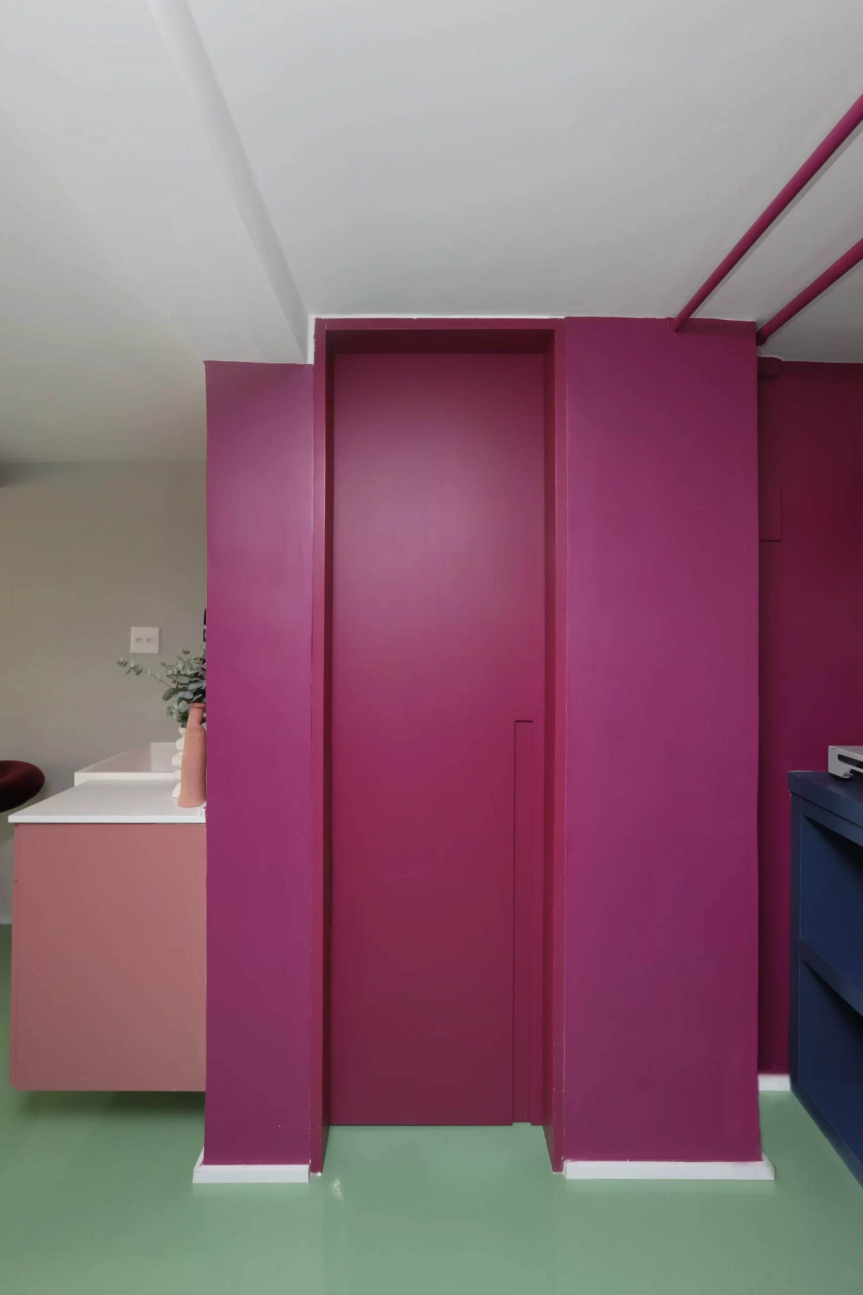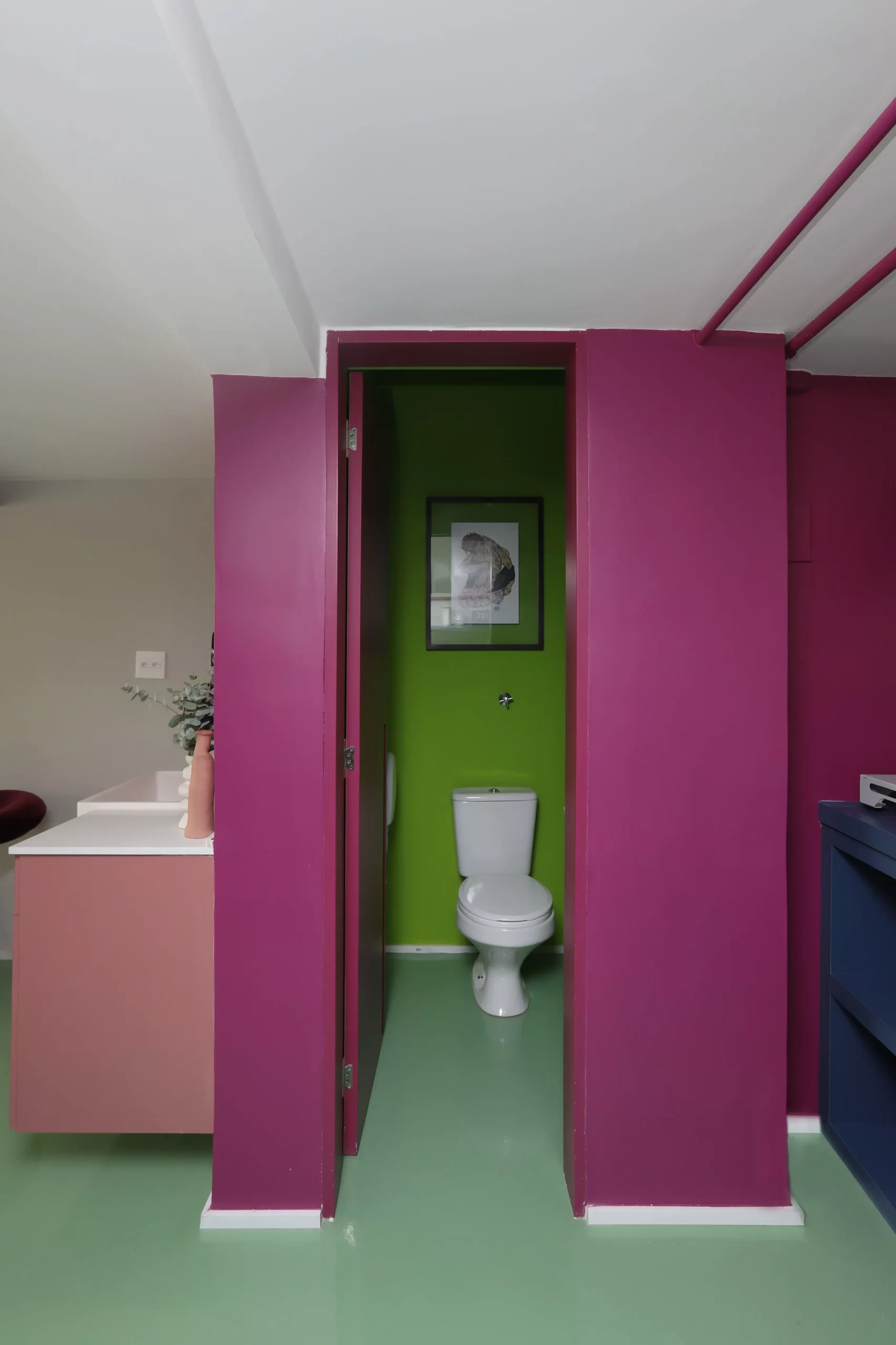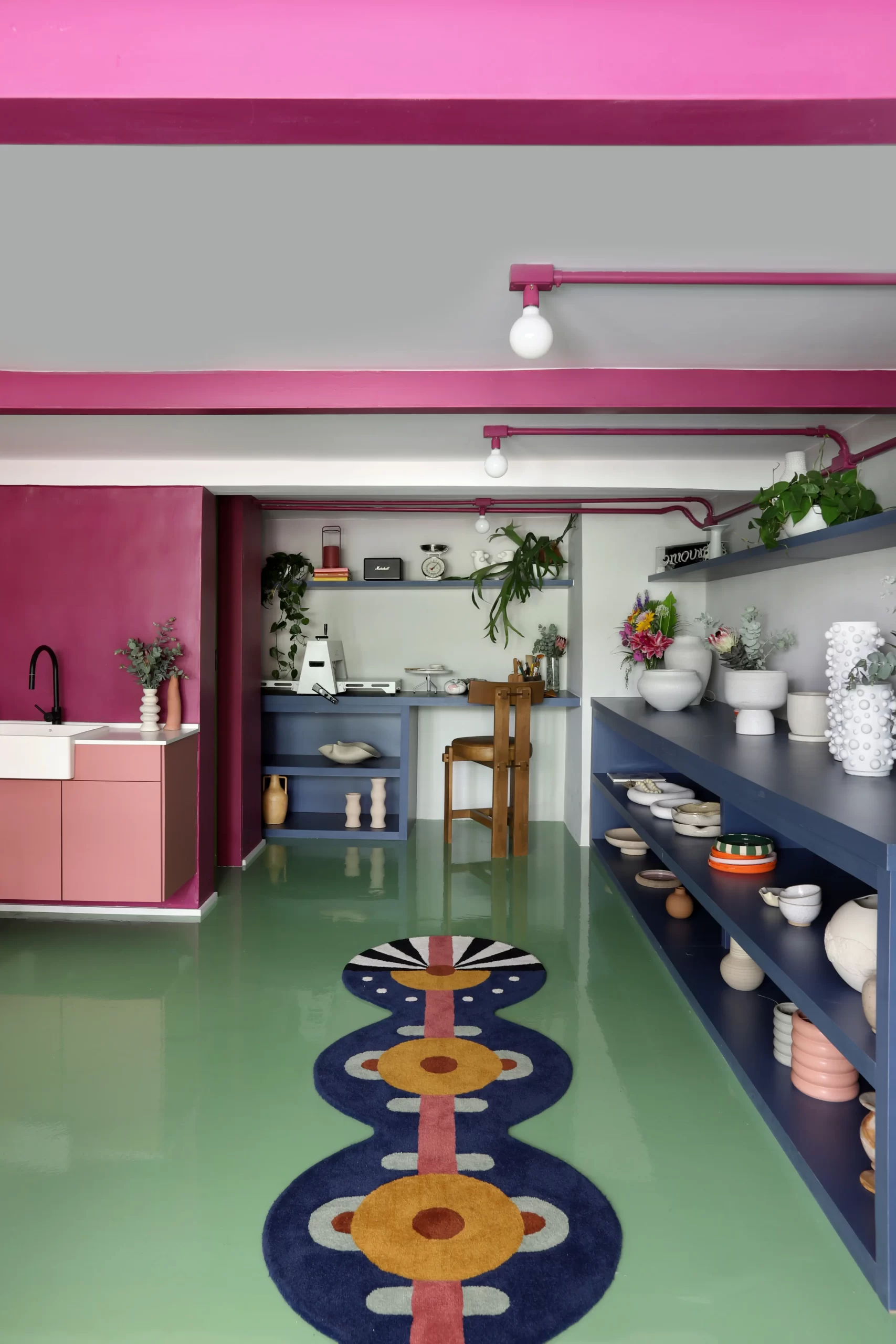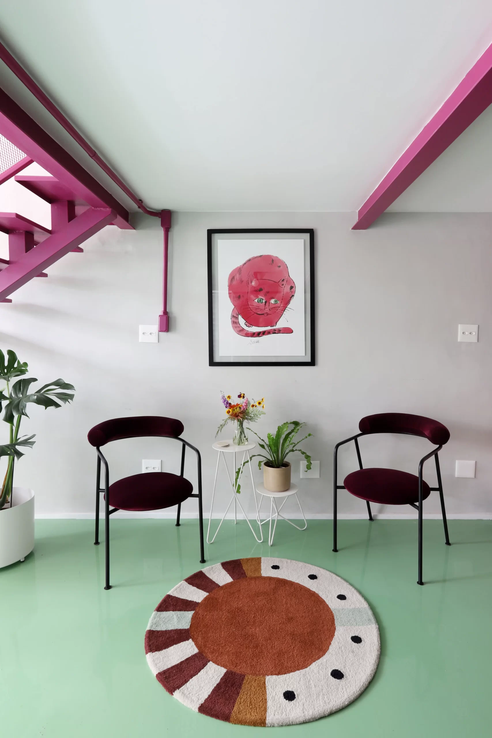 A paleta de cores é um dos elementos centrais do projeto. Piso em epóxi verde, escada e vigas em tom de beterraba, armários em fórmica azul e rosa, além de pontos de cor em laranja e verde-limão criam uma atmosfera vibrante e impactante. A escolha do epóxi para o piso atende tanto à estética quanto à necessidade de resistência e fácil manutenção — essencial para o fluxo de pessoas e o uso intenso do espaço.