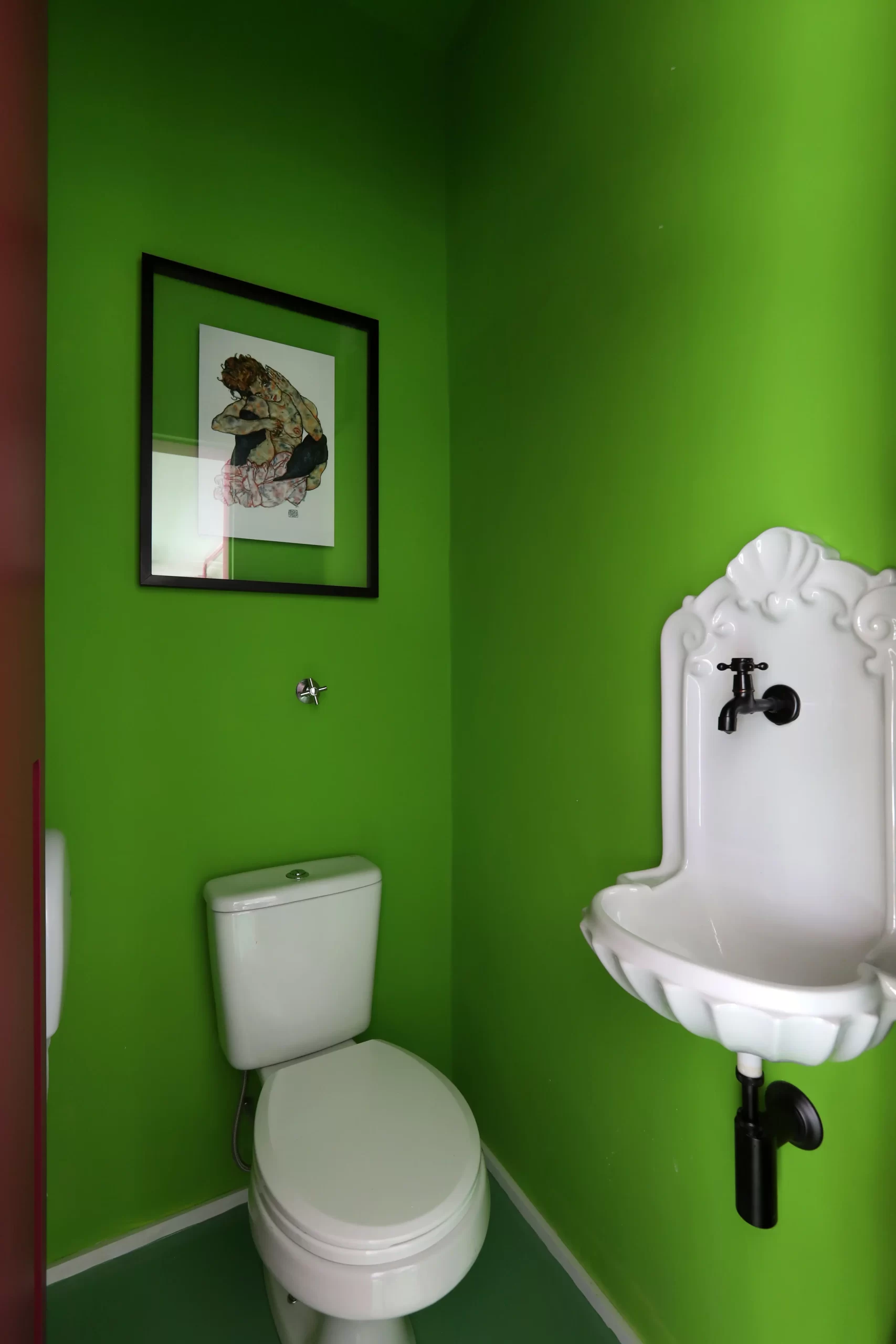 As obras de arte, tapetes geométricos e objetos decorativos reforçam a proposta de um espaço autoral, onde a cerâmica dialoga com outras expressões visuais. O lavabo segue a mesma lógica: paredes e teto em verde-limão, porta laqueada em roxo e uma pia vintage compõem um ambiente lúdico e cheio de contraste.