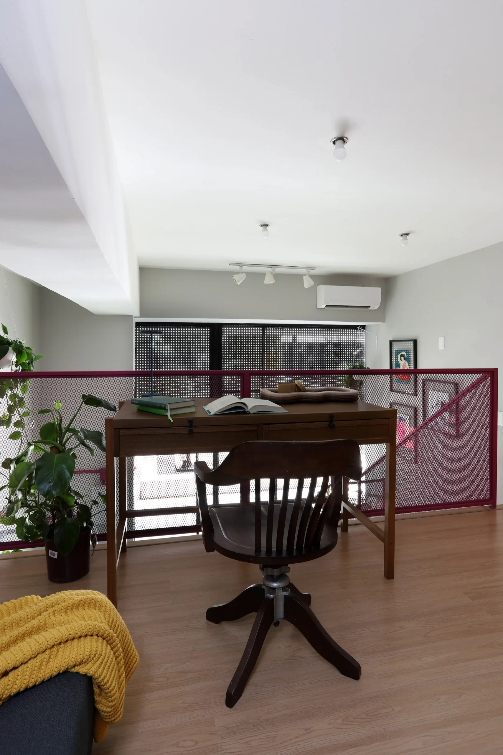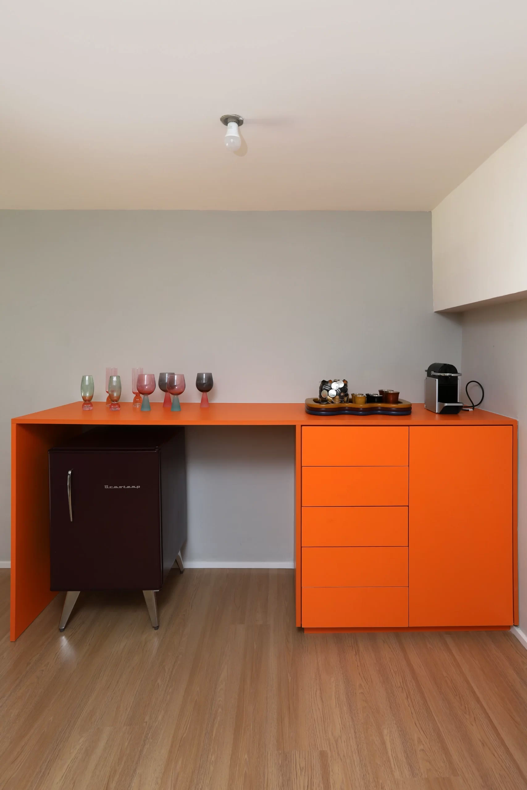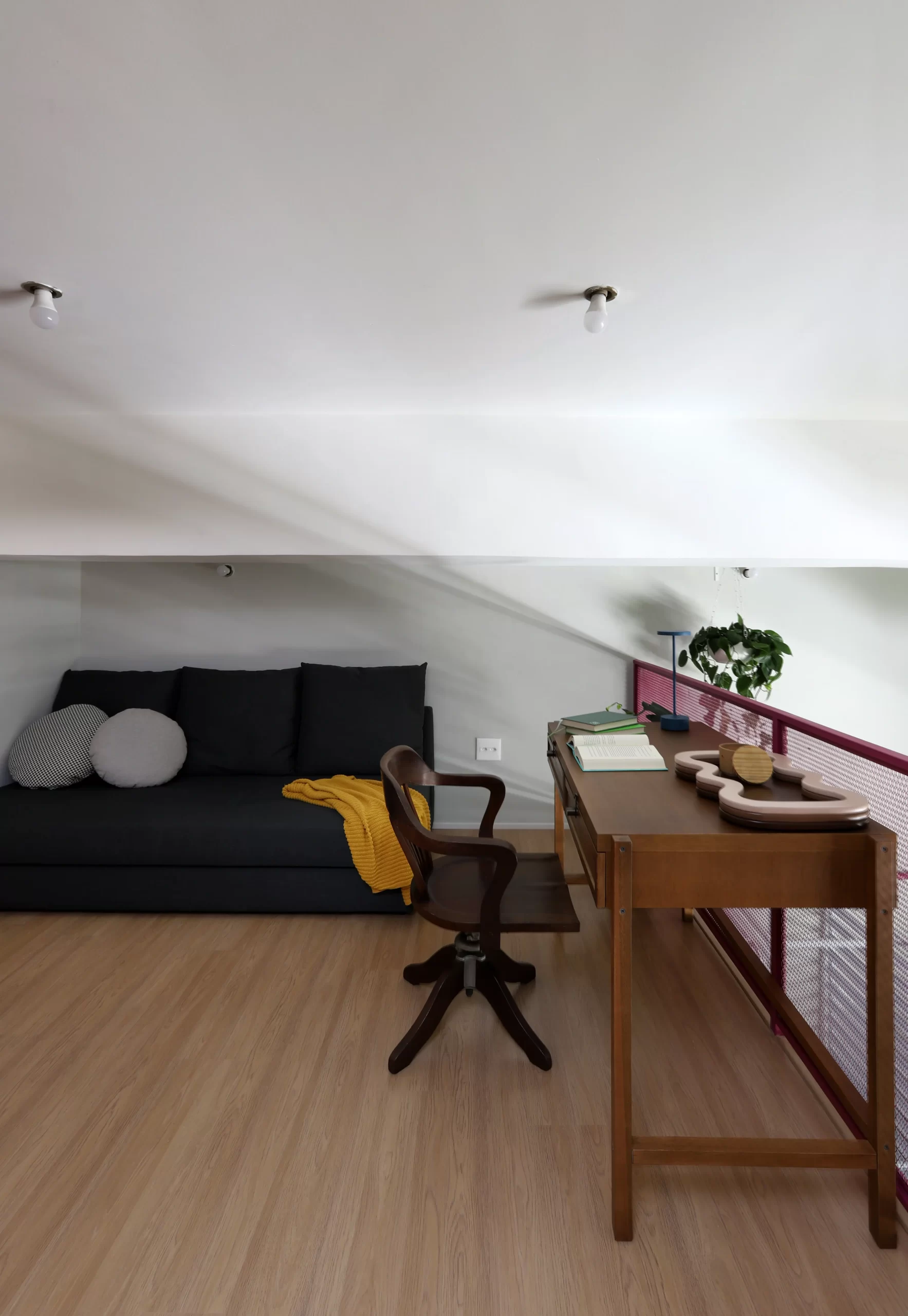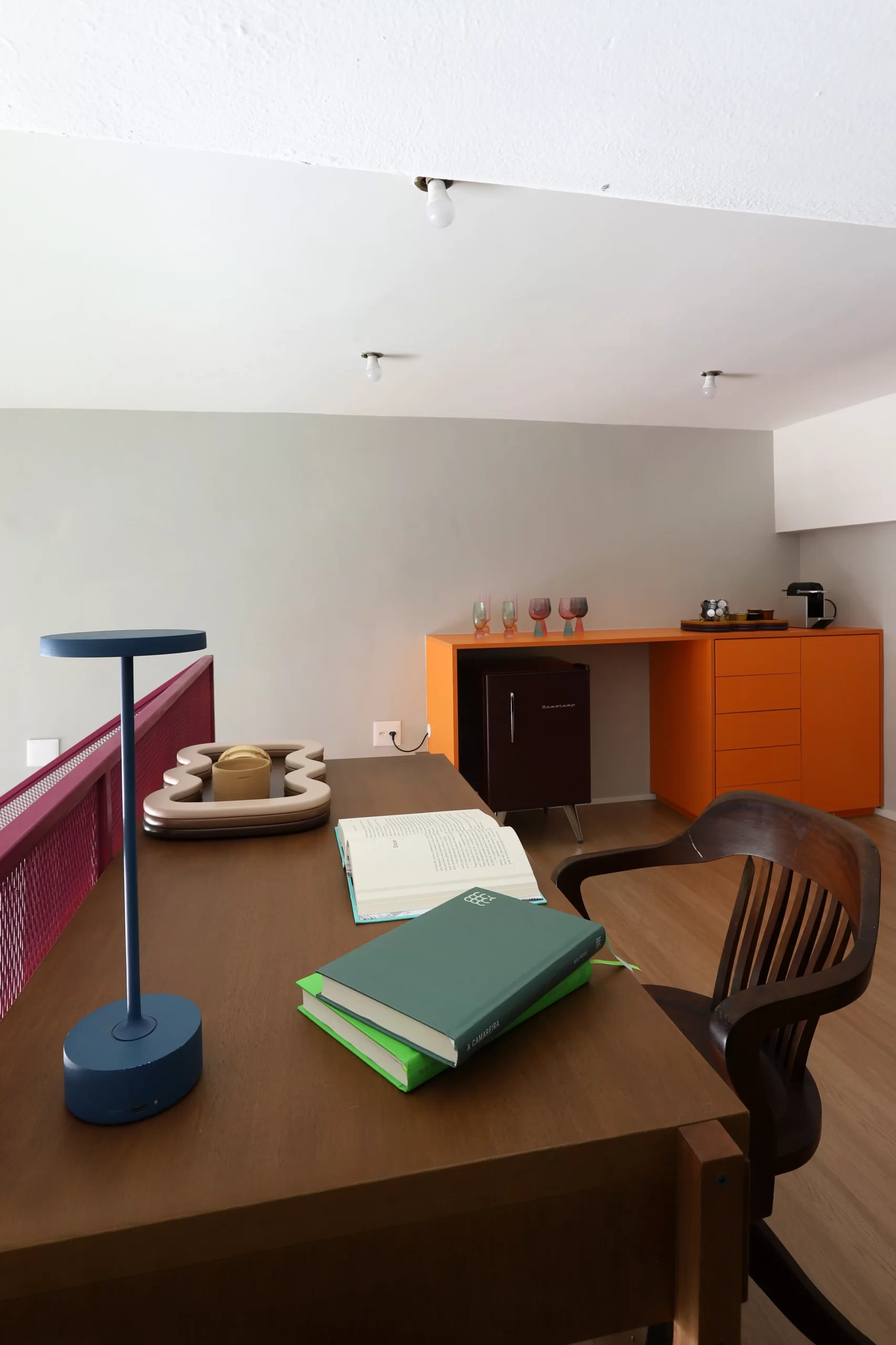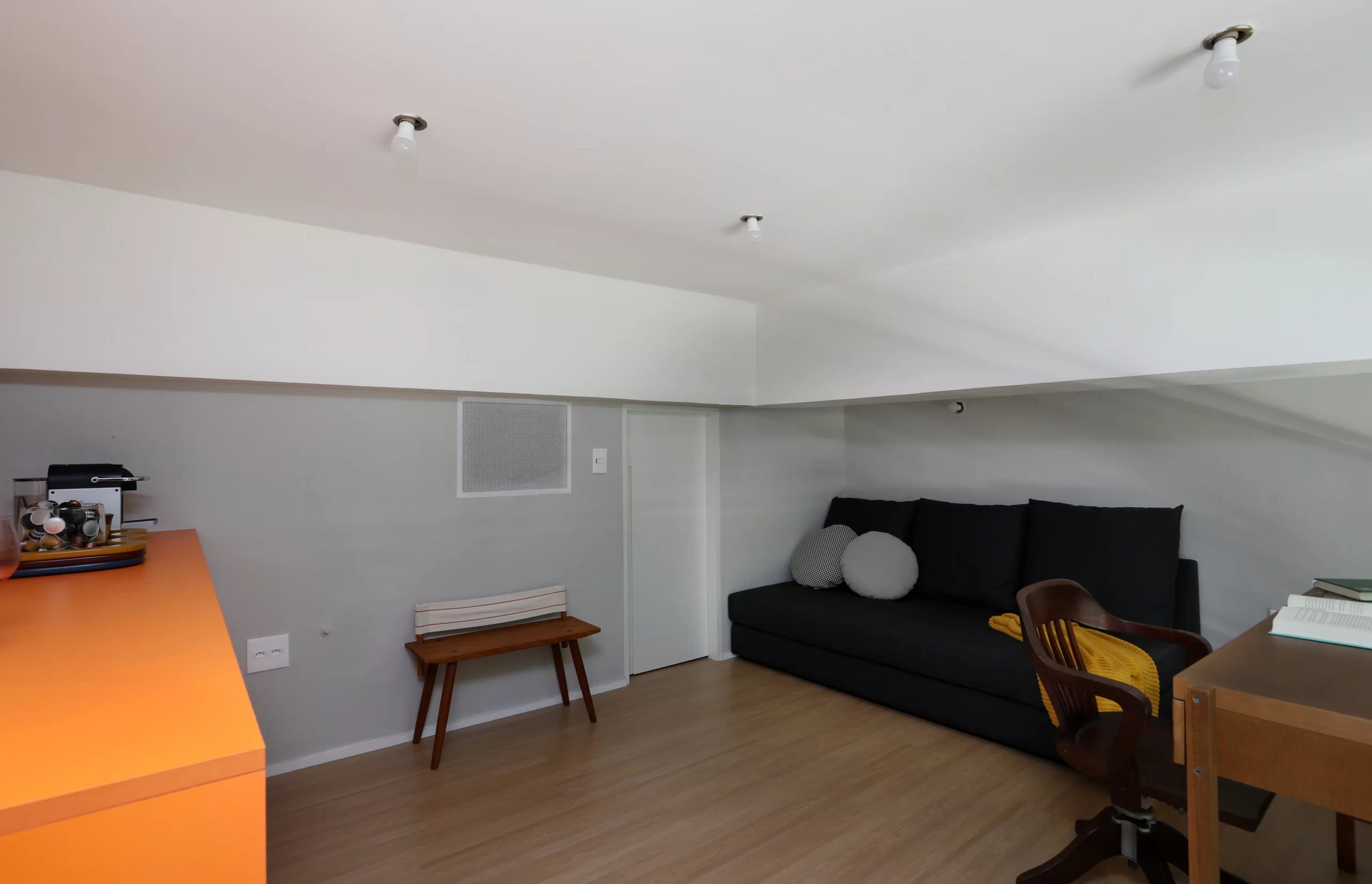 Na parte superior, o mezanino funciona como espaço de descompressão e criação. O piso em laminado de madeira traz conforto, enquanto os móveis, entre eles um armário laranja desenhado pelo escritório e uma escrivaninha vintage com poltrona do acervo da cliente, equilibram o novo e o antigo de forma leve e despretensiosa.